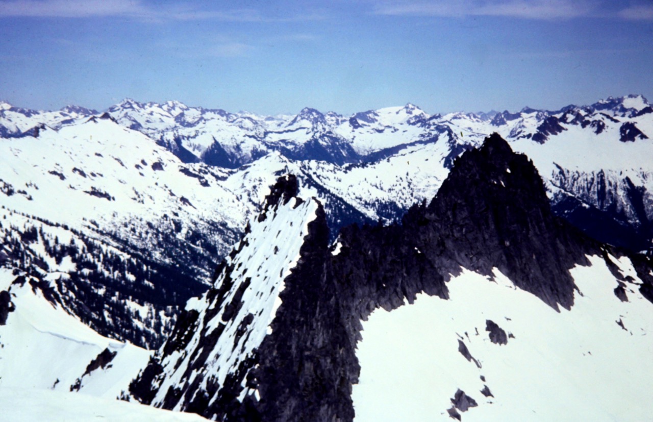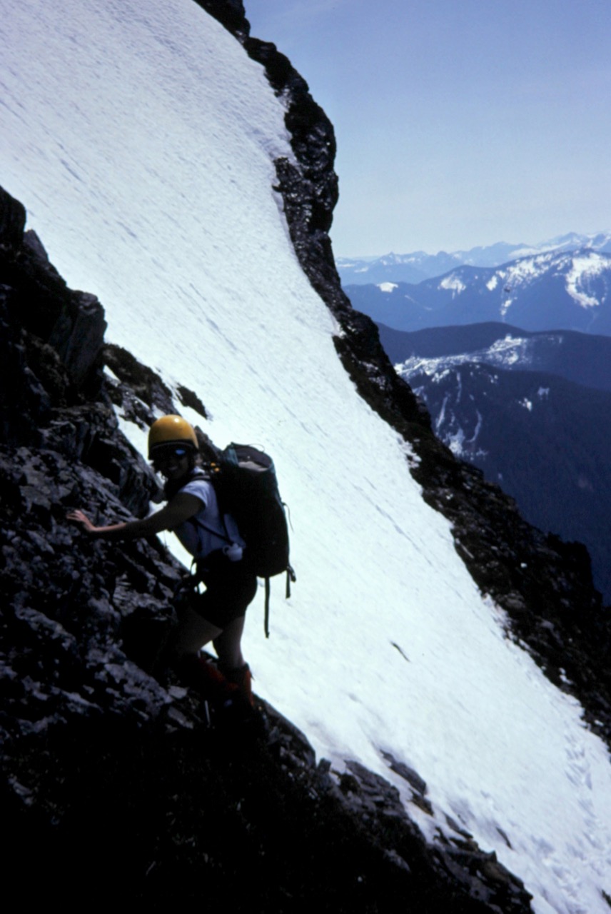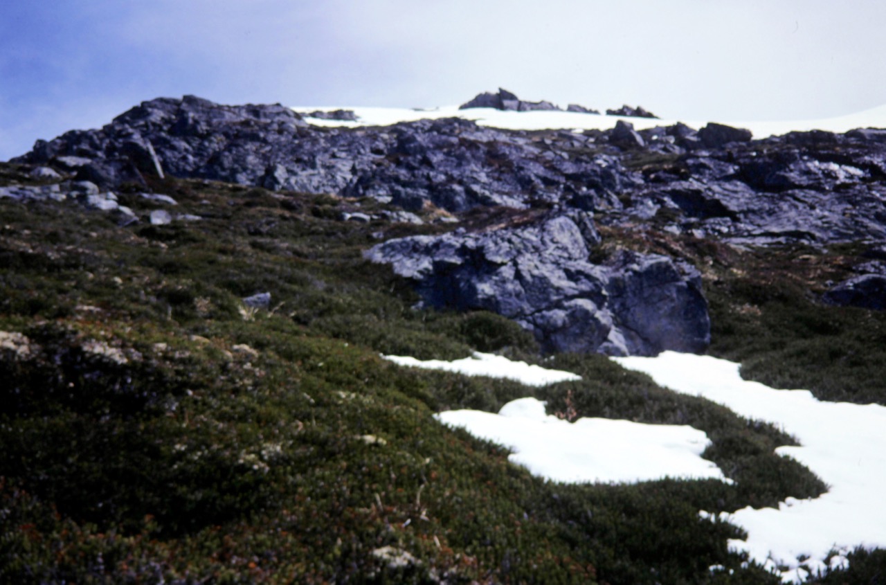 Above this, another heather slope leads to a short but very steep and exposed snowfield that arcs across the summit crest. My stomach securely tied itself into a quadruple-bowline-on-the-bight as I negotiated this last pitch, wishing we had come prepared for such dicey terrain. Finally, there was the narrow, airy summit (9.4 hours from TH)!