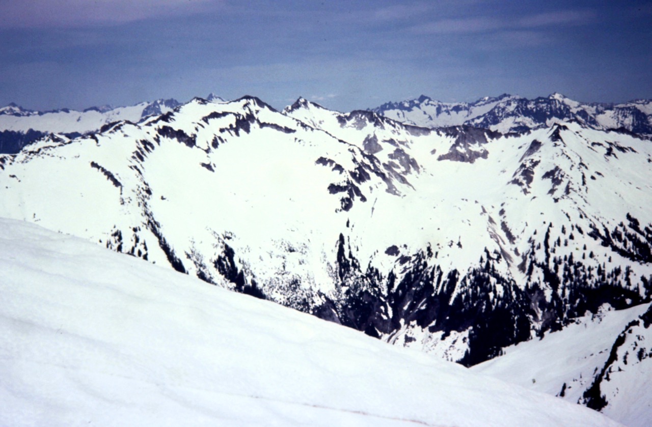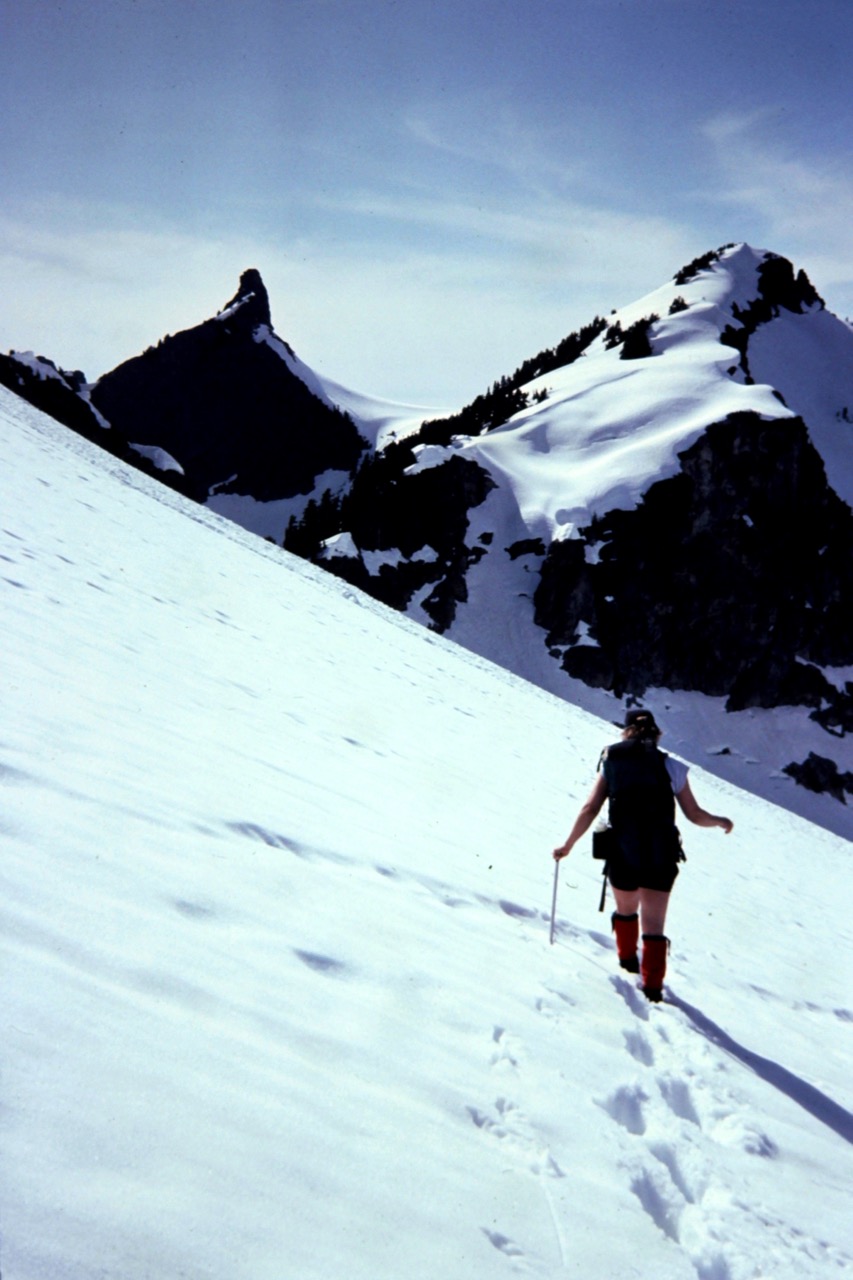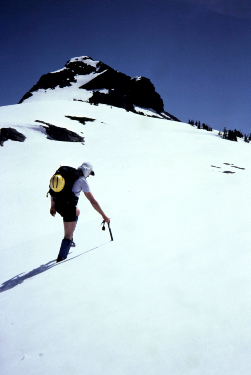 Getting to the summit pyramid involves traversing the steep southern side of the west ridge for 1 mile to a higher 5900-foot saddle, then traversing the gentler northern side for another ½ mile. Our progress was slowed by mushy snow on both sides, and the midday sun broiled us.