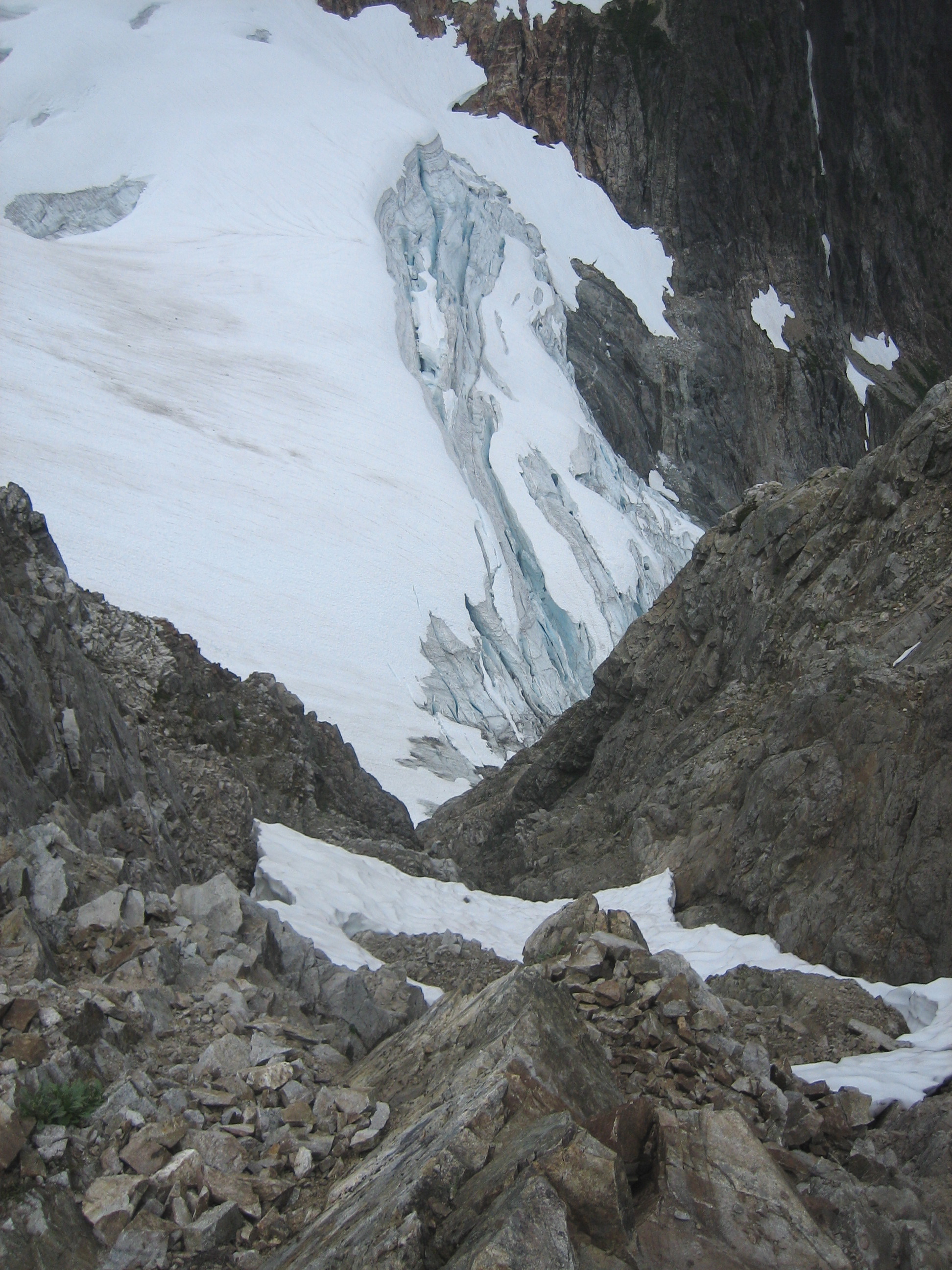 Leaving the summit at 4:00pm, we rappelled over the dihedral and carefully down-climbed to where Eric was waiting below. Getting past the cliff band was a big concern now; our short rope was going to require two or three time-consuming rappels, and anchor points could be hard to find.