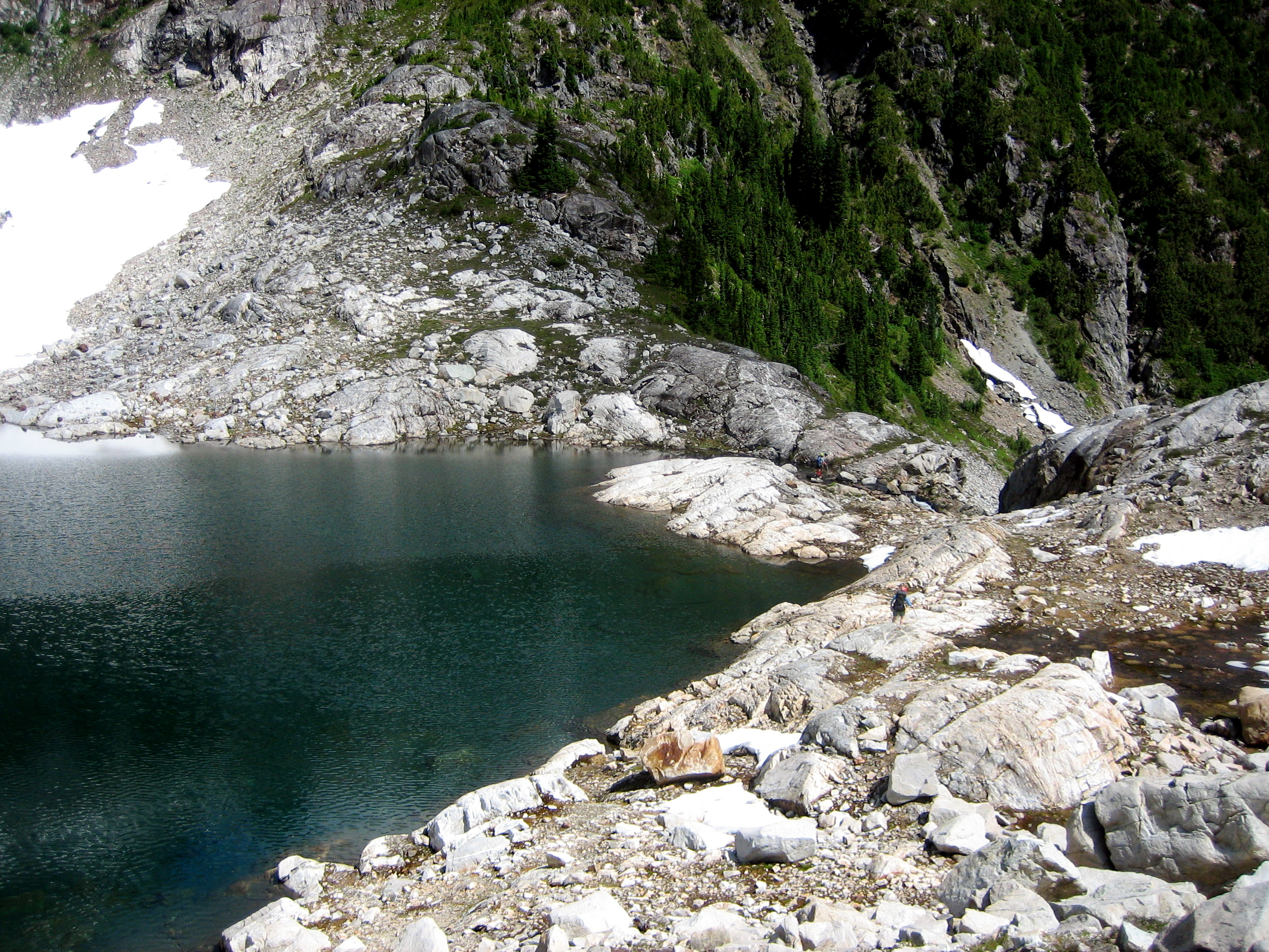We quickly descended a north-facing snowfield to 4900 feet, traversed around partially frozen “Regret Lake,” and gained a moraine on its west side. After re-ascending to about 5300 feet, we began a long traverse across heather and slabs and several ravines to reach 5100-foot Upper Despair Lake at noon (5.6 hours from camp).