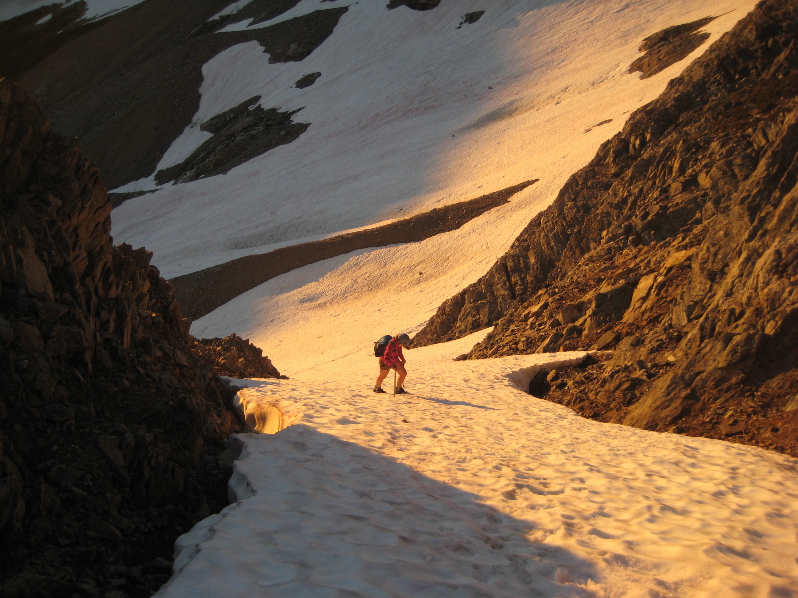 Our descent of the south face was cautious but fairly efficient. I recalled that a fatality had occurred on a descent of this face several years ago and so treated every hold with skepticism. Soon we were back on the comforting sandstone shoulder and heading for the south saddle. The last rays of sunlight tinged our ascent of the snowfinger, as well as the LeConte Glacier to the southeast.