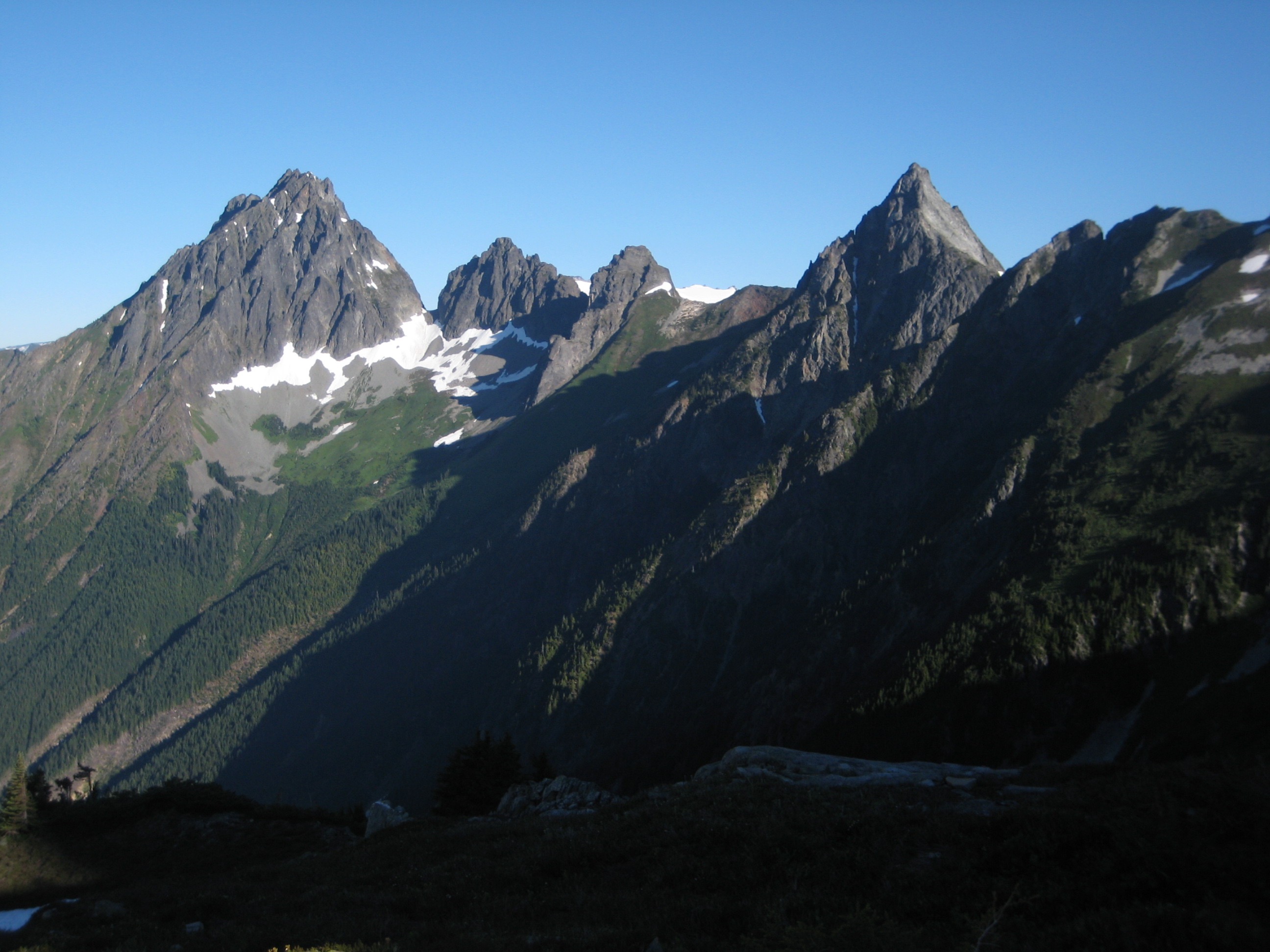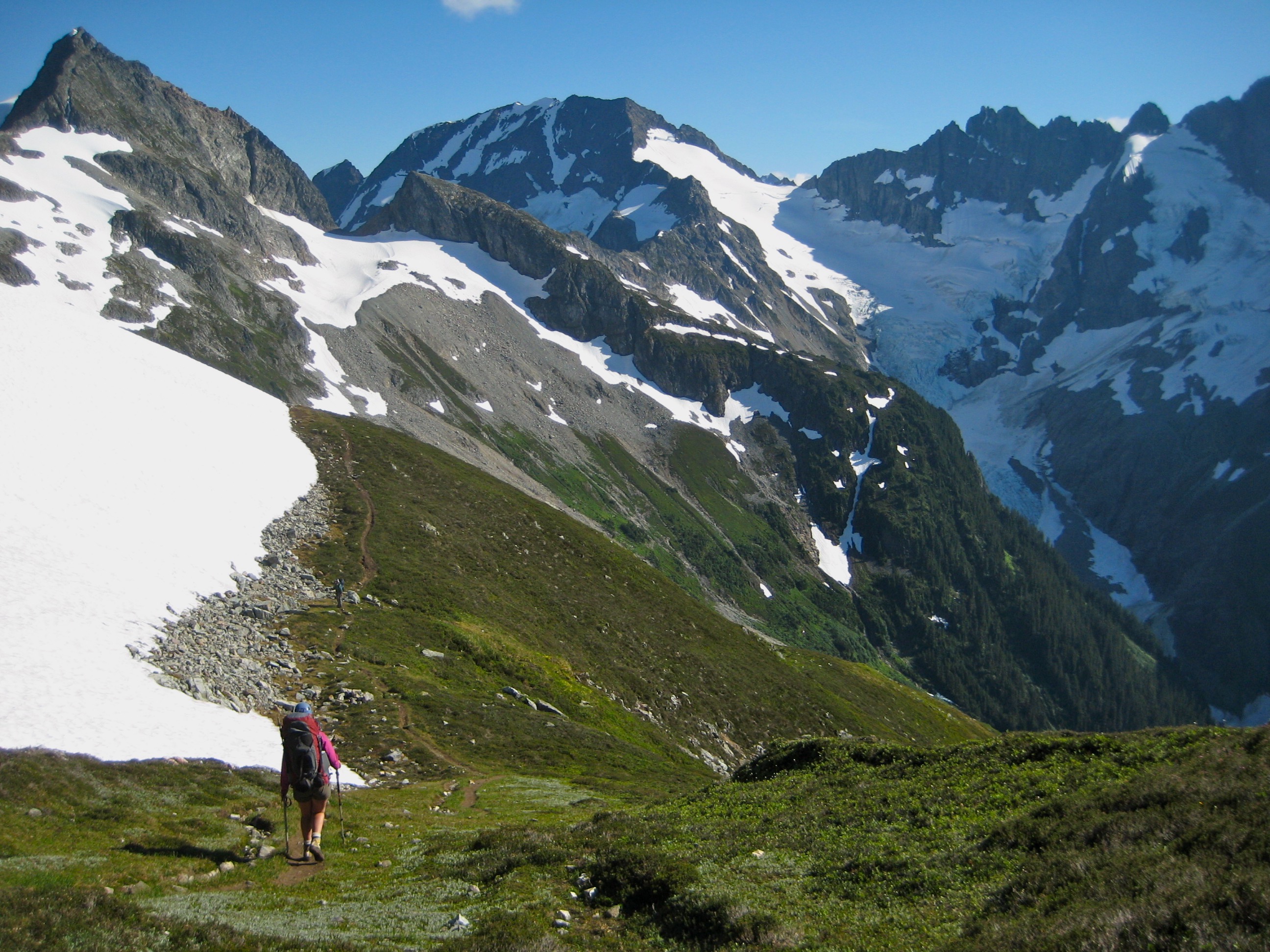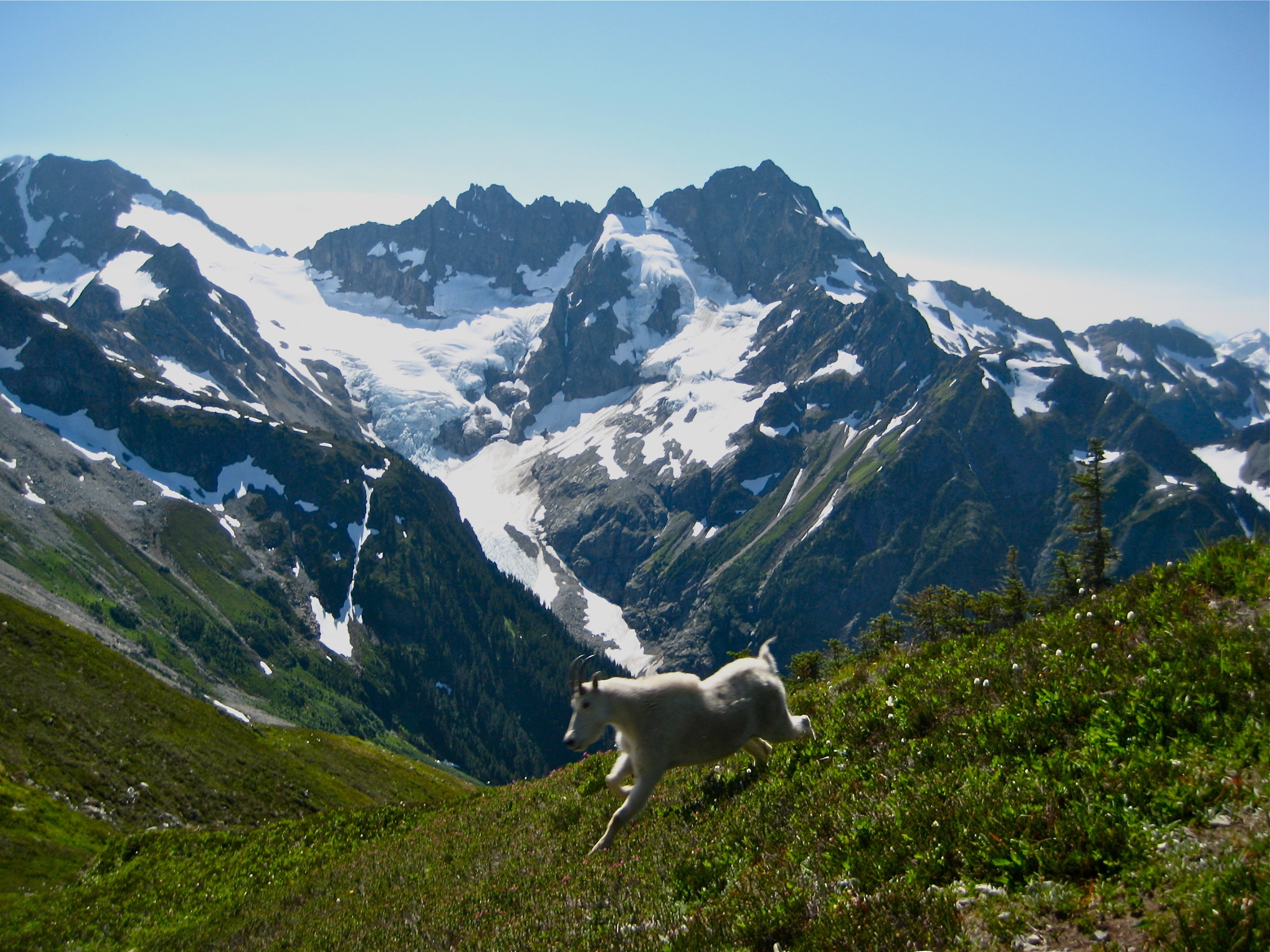 I was relieved to awake to gentle winds in the morning. While Eileen and Beth were still sleeping, I went in search of wind-blown gear. My efforts recovered one sock and one bra in the trees below camp, but our water bucket was AWOL (probably halfway to Marblemount by then). We had a lazy morning before heading back toward the trailhead. Upon reaching Cache Col, I was greeted by three climbers who were each lounging on rocks and smoking cigarettes. They looked as though they had just stepped out of a Marlboro advertisement. A while later, two mountain goats strolled past us without a care. This appears to be the place to view wildlife of all sorts!
