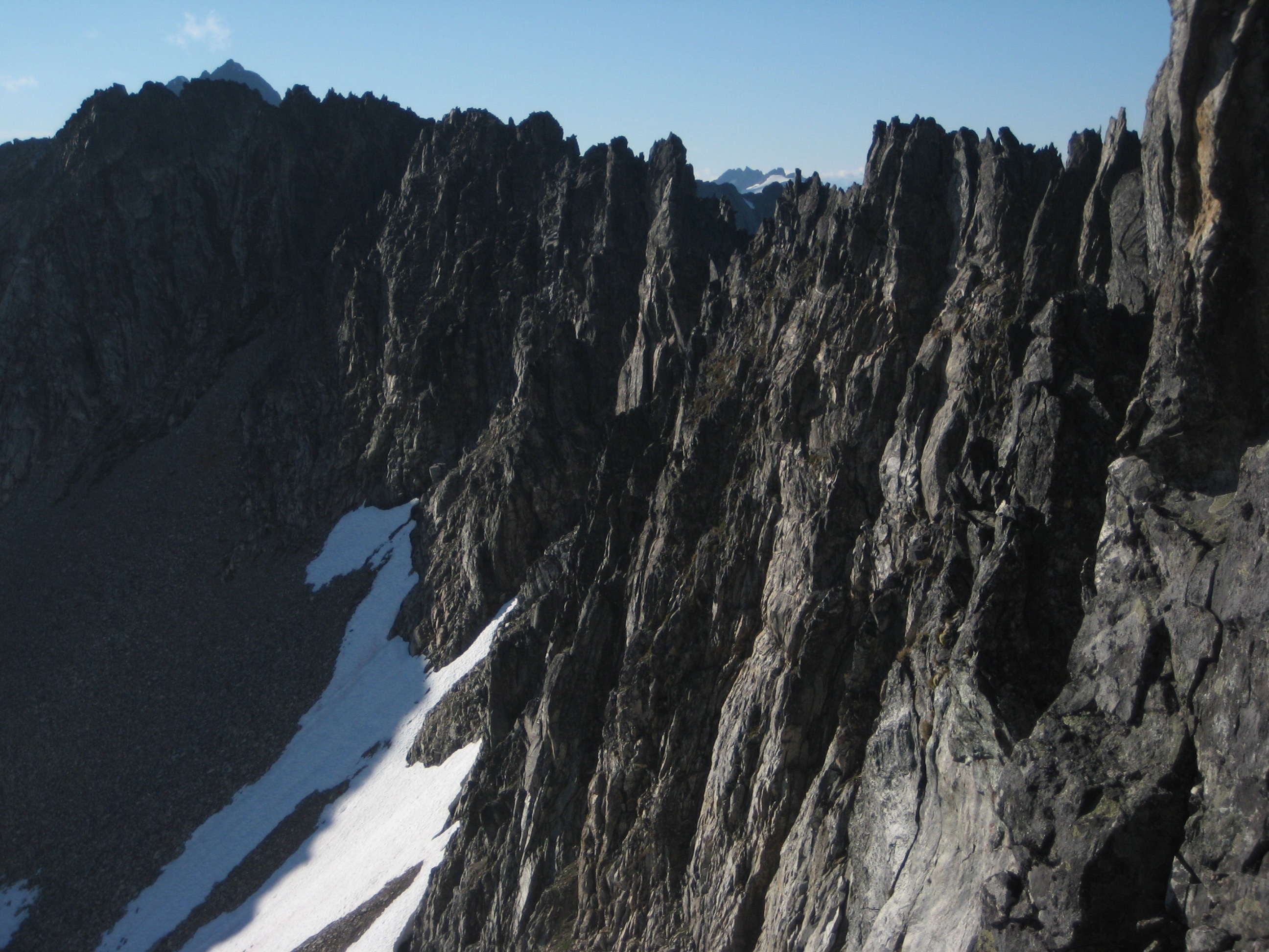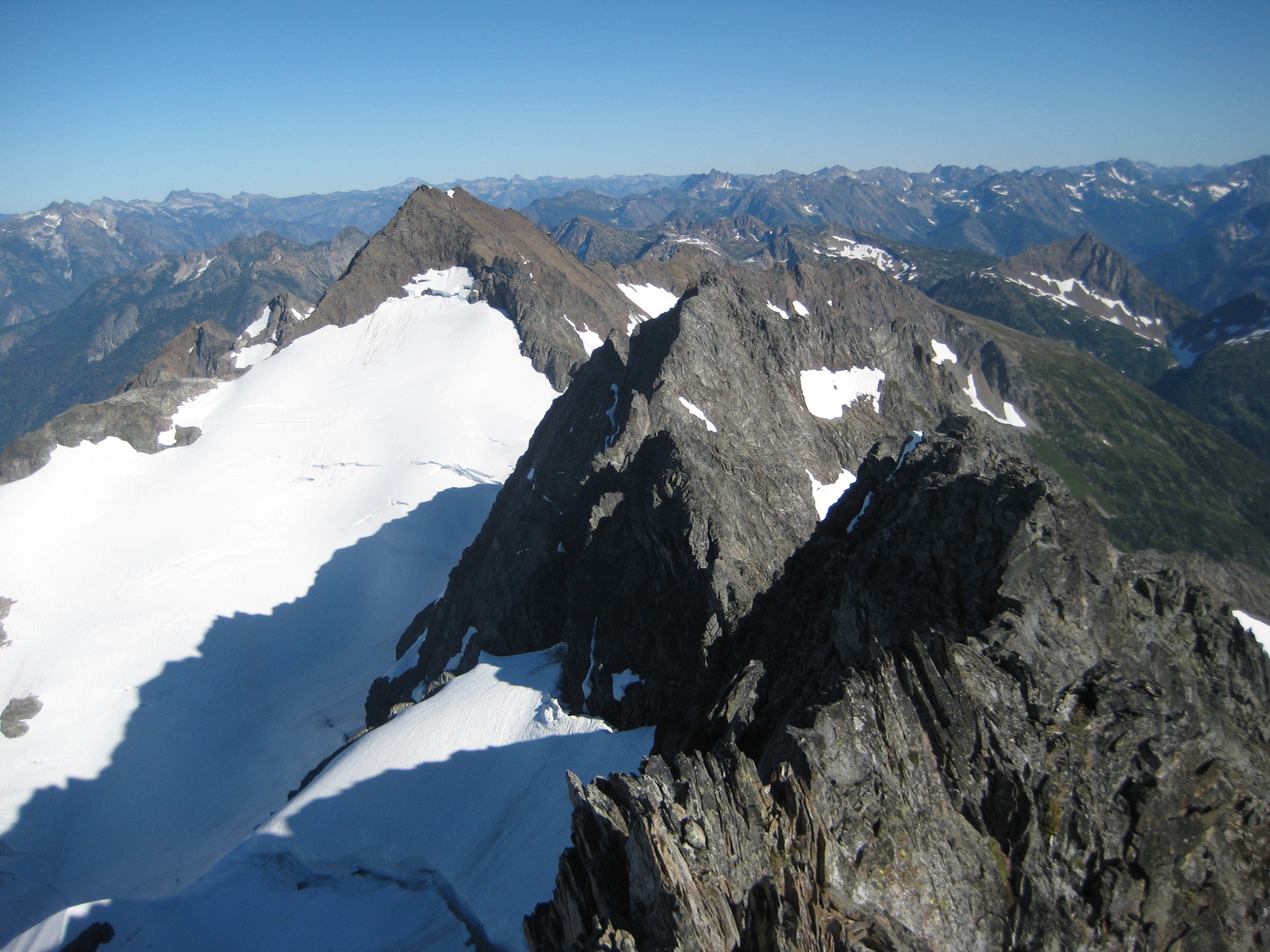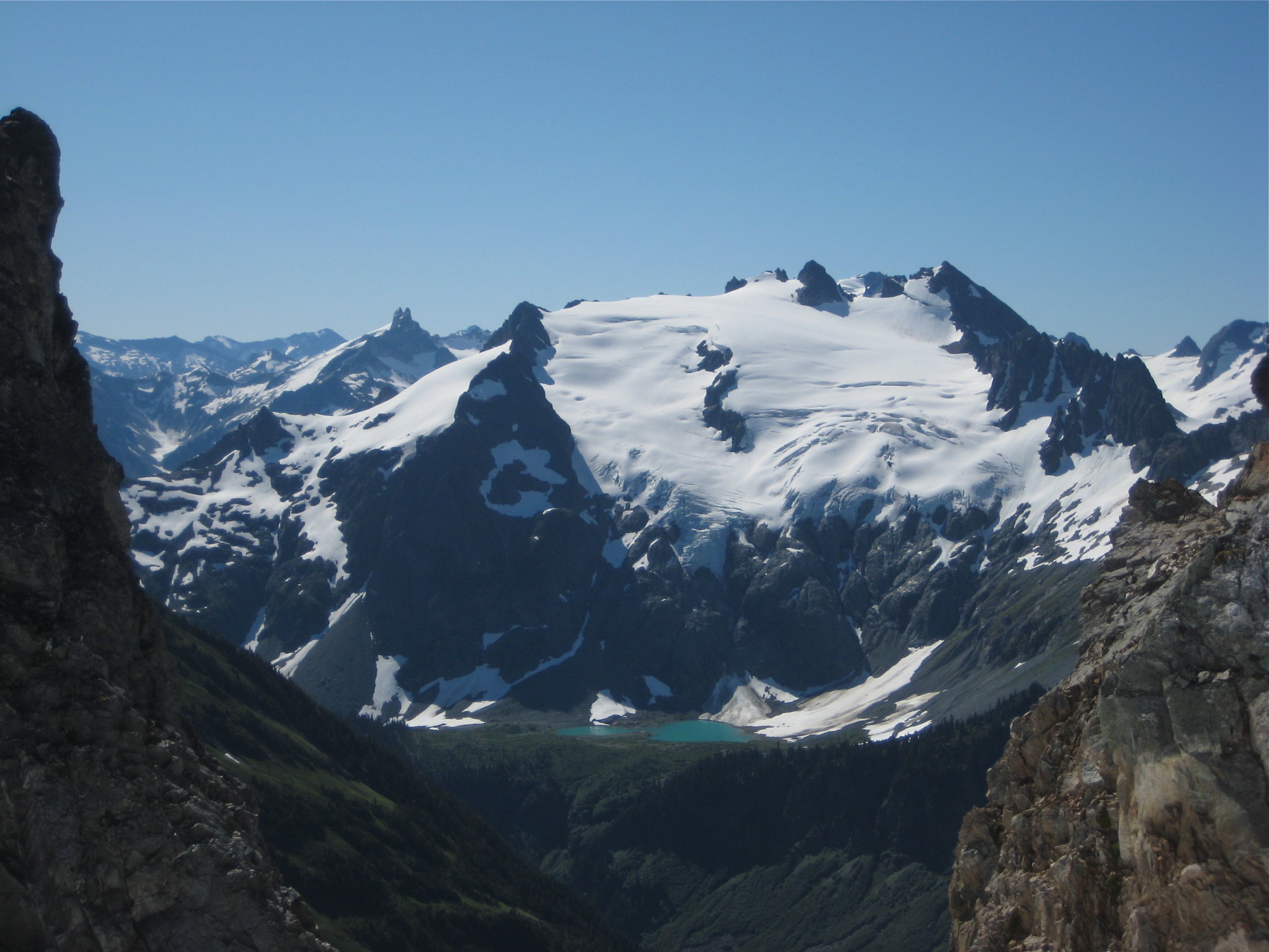 We awoke to blue skies and a cold breeze coming off the high ridges. By about 7:30am, we were underway toward the Middle Cascade Glacier. Our long southerly traverse took us across countless bands of heather, snow, and talus. The only variety was provided by the famous (or, for some, infamous) Red Ledges, which were thankfully snowfree and benign. The glacier itself was perfectly crispy and spectacularly scenic.