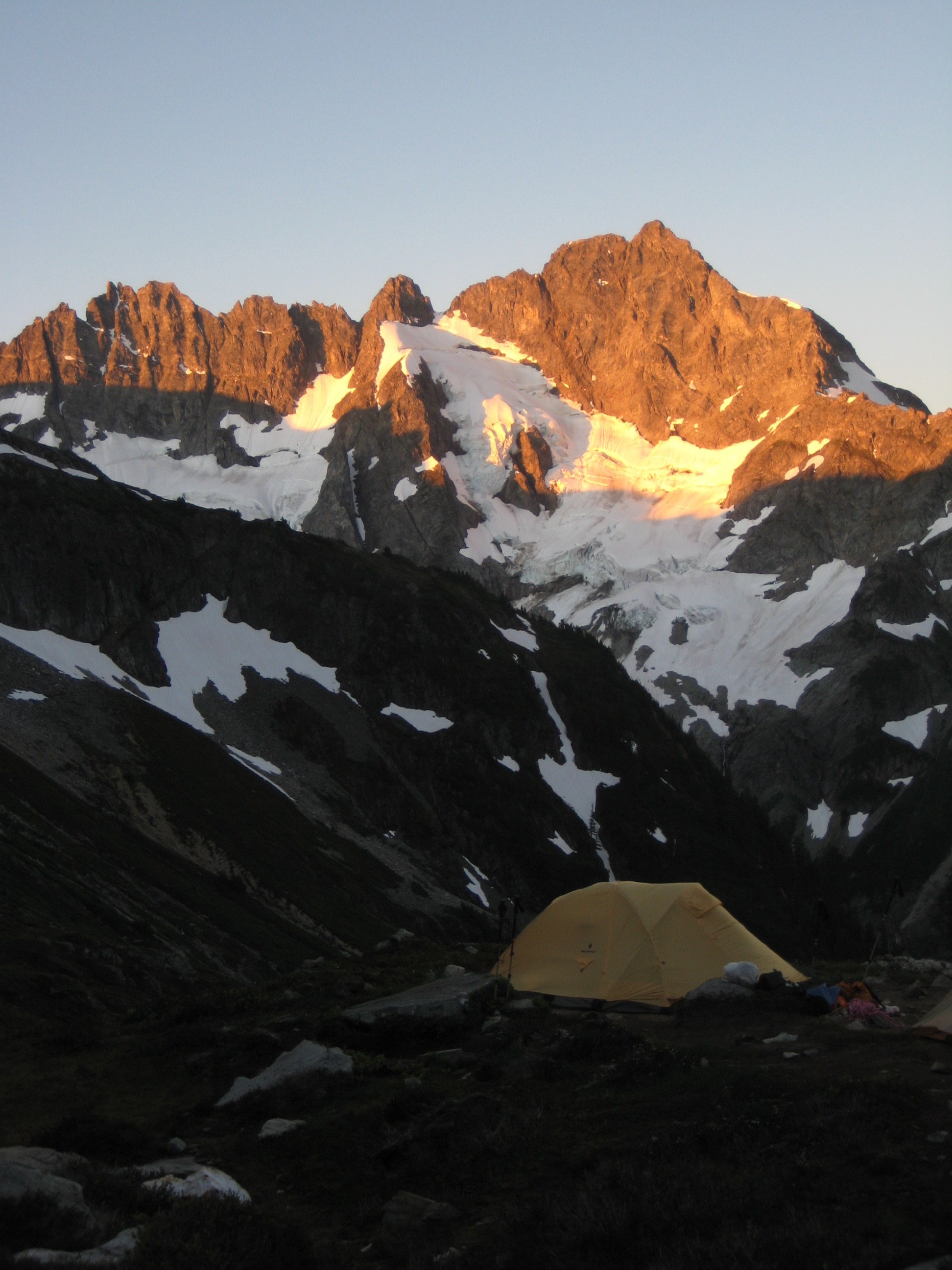 Upon reaching the glacier’s edge, we pulled out headlamps and began a long, tedious contour back across the talus and snow slopes. The Ptarmigan Traverse route appears to be well-defined in broad daylight, but when seen in 10-yard segments, it becomes a route-finding challenge. We benefitted from Beth’s new role as a techno-geek, because she had marked many waypoints on her GPS. Nonetheless, it took all of our combined efforts to stay on the trodden path. The Red Ledges, in particular, seemed distressingly narrow and slippery in the dark. Our surreal journey finally ended at 11:30pm, when our headlamps reflected off our tents at Kool-Aid Lake (6.8 hours from summit).