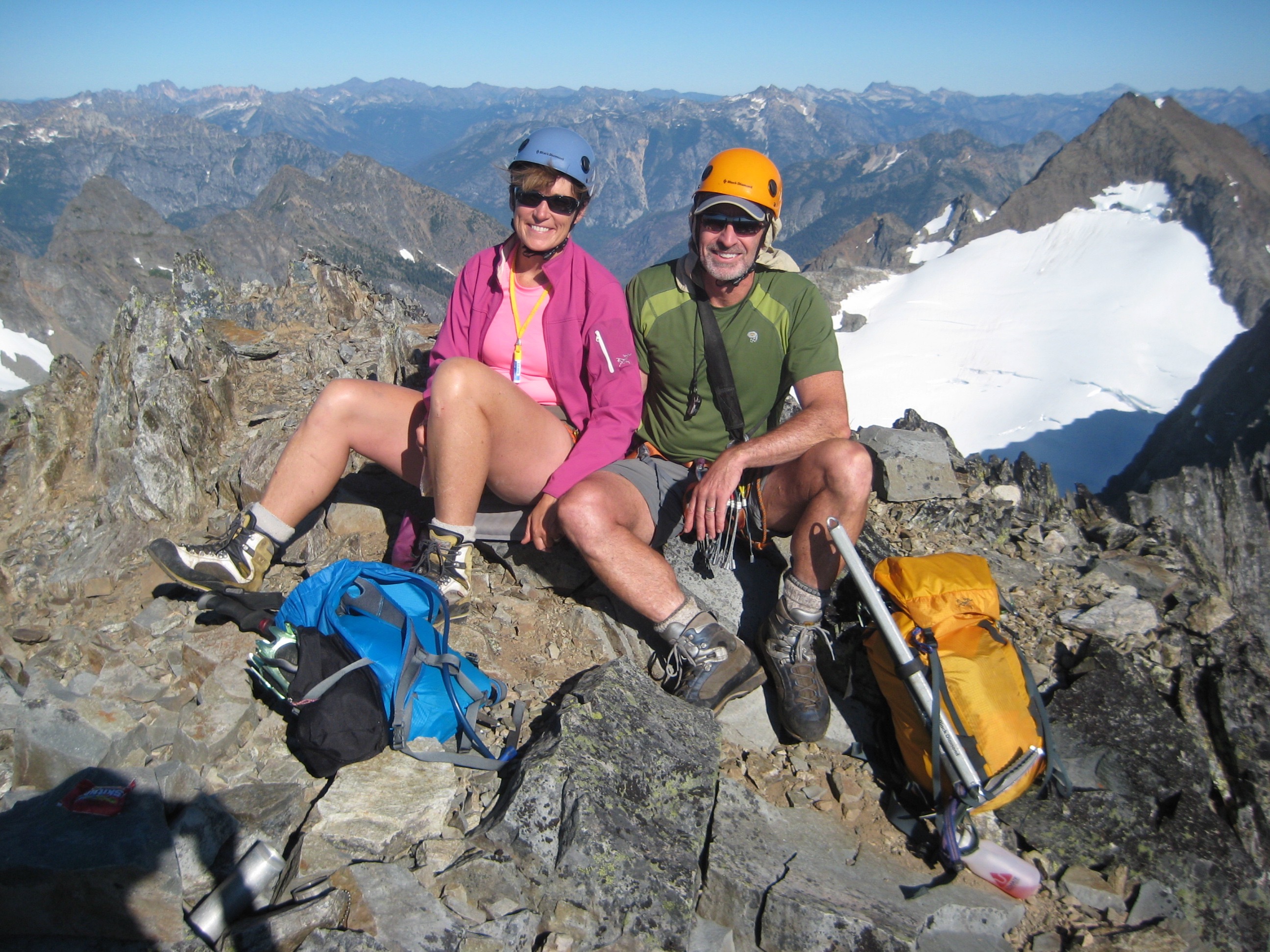 We roped up and belayed across this Class 4-5 cleft, then continued upward about 600 feet on broken Class 3 rock, reaching the summit at 4:20pm (8.7 hours from camp). The splendid views demanded a half-hour stay even with the inevitability that we’d be returning to camp in the dark.
