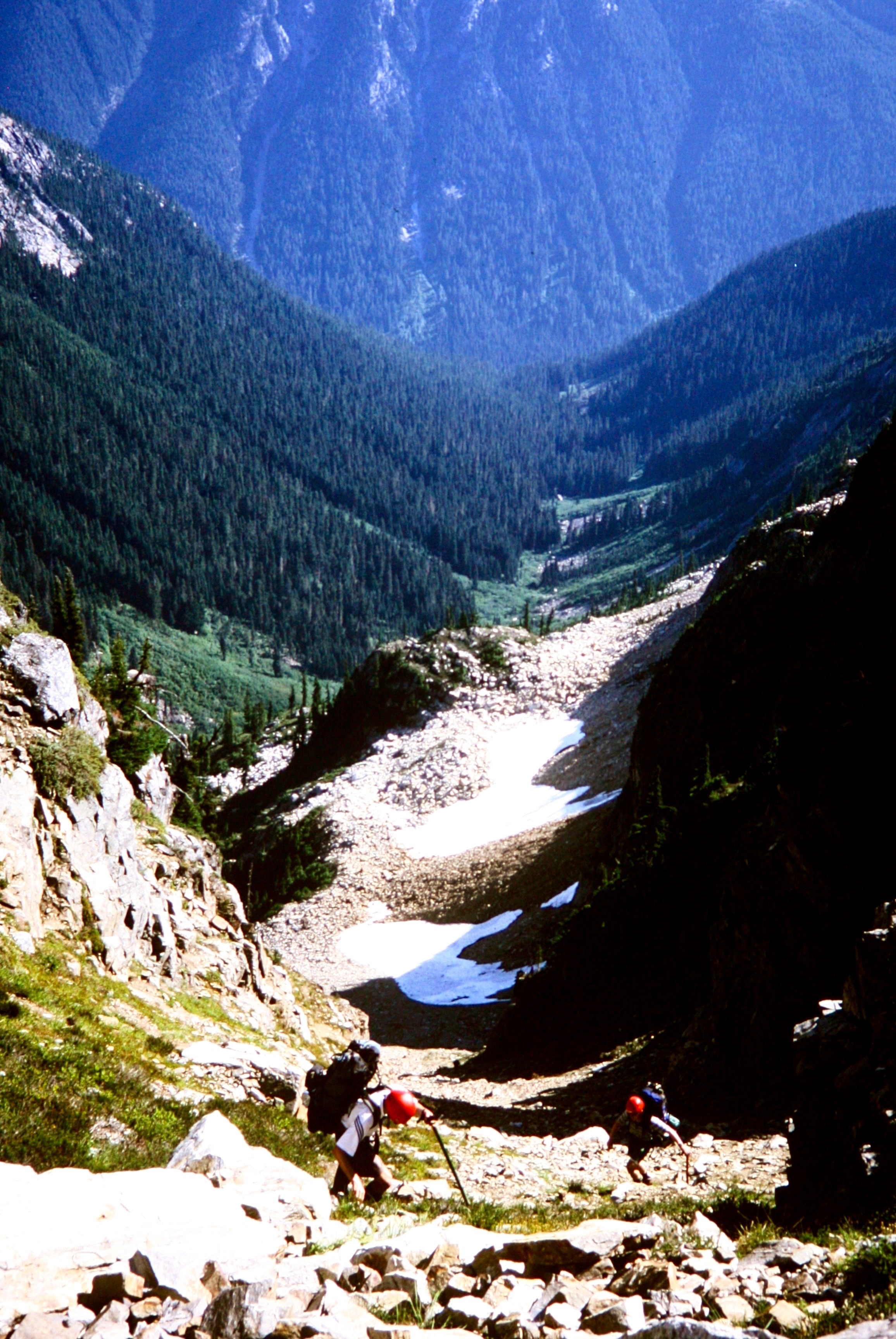 The traverse over to Access Col was uneventful and even pleasant in the cool morning, whereas the 1800-foot plunge to Access Basin itself seemed excessively long and tedious.  We stopped to retrieve our stashed gear and fill water bottles before heading into the brush.
