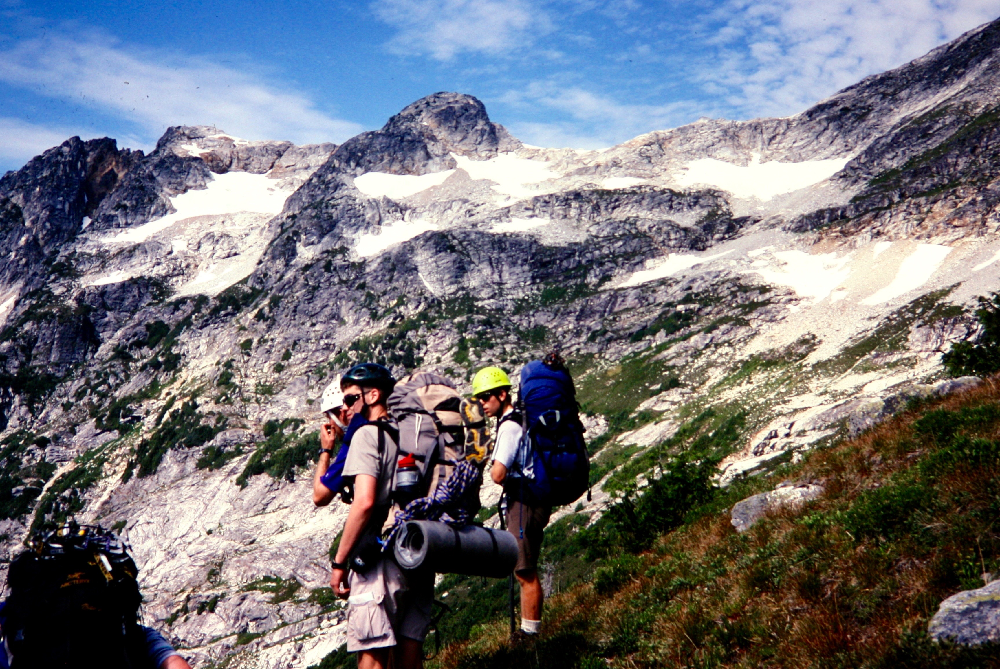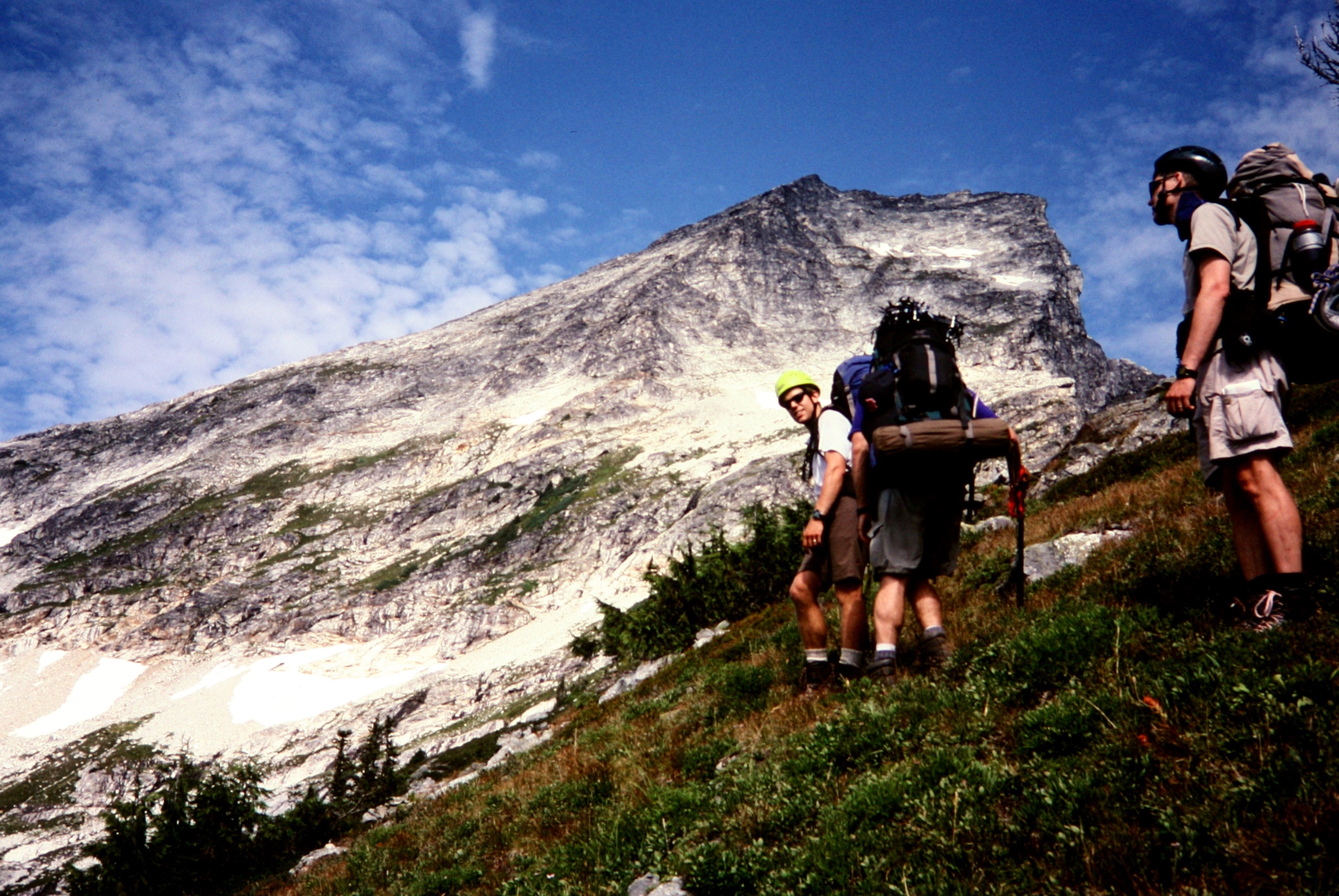 mountain climbers traverse grassy slopes below rocky Luna Peak in the Northern PIckets
