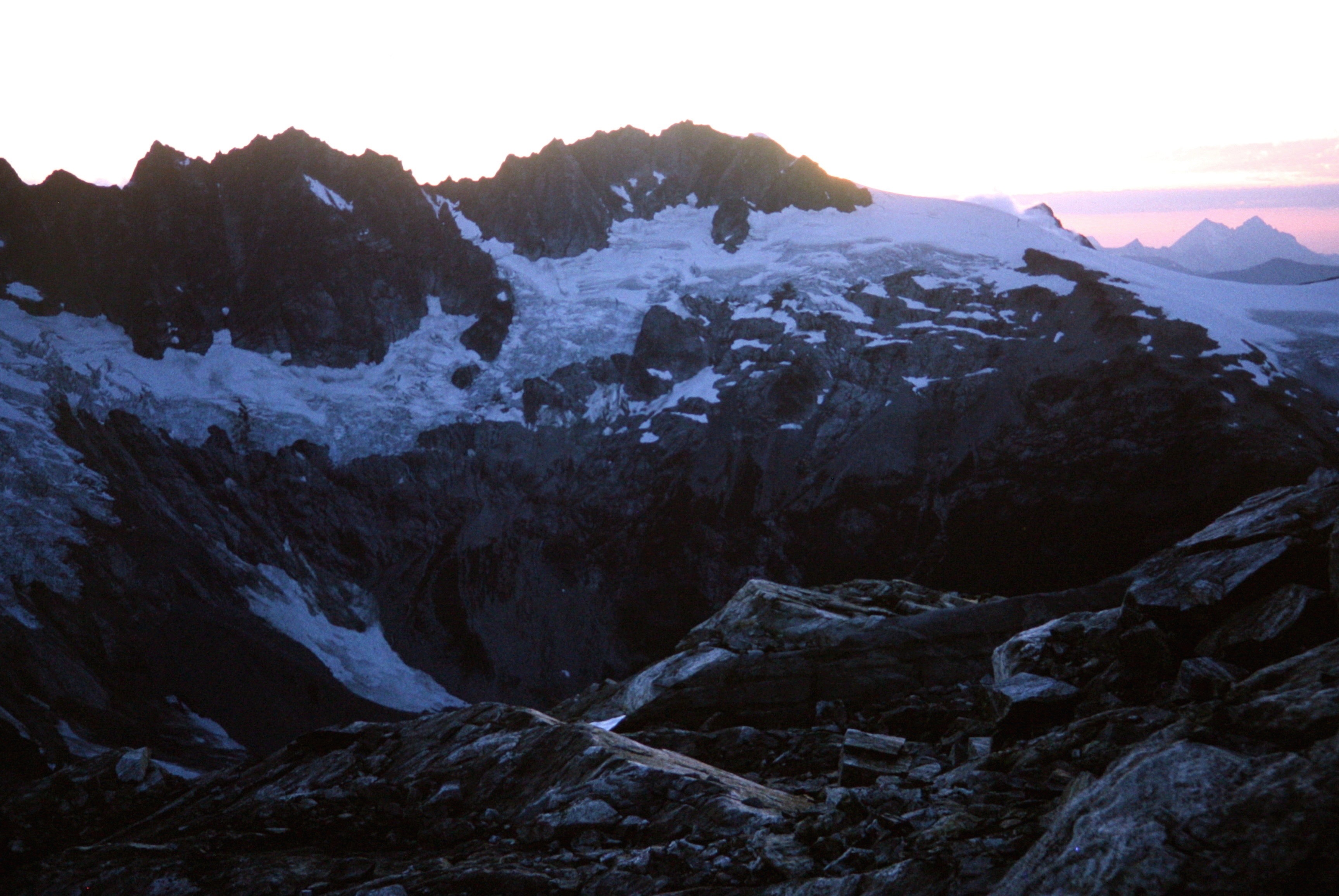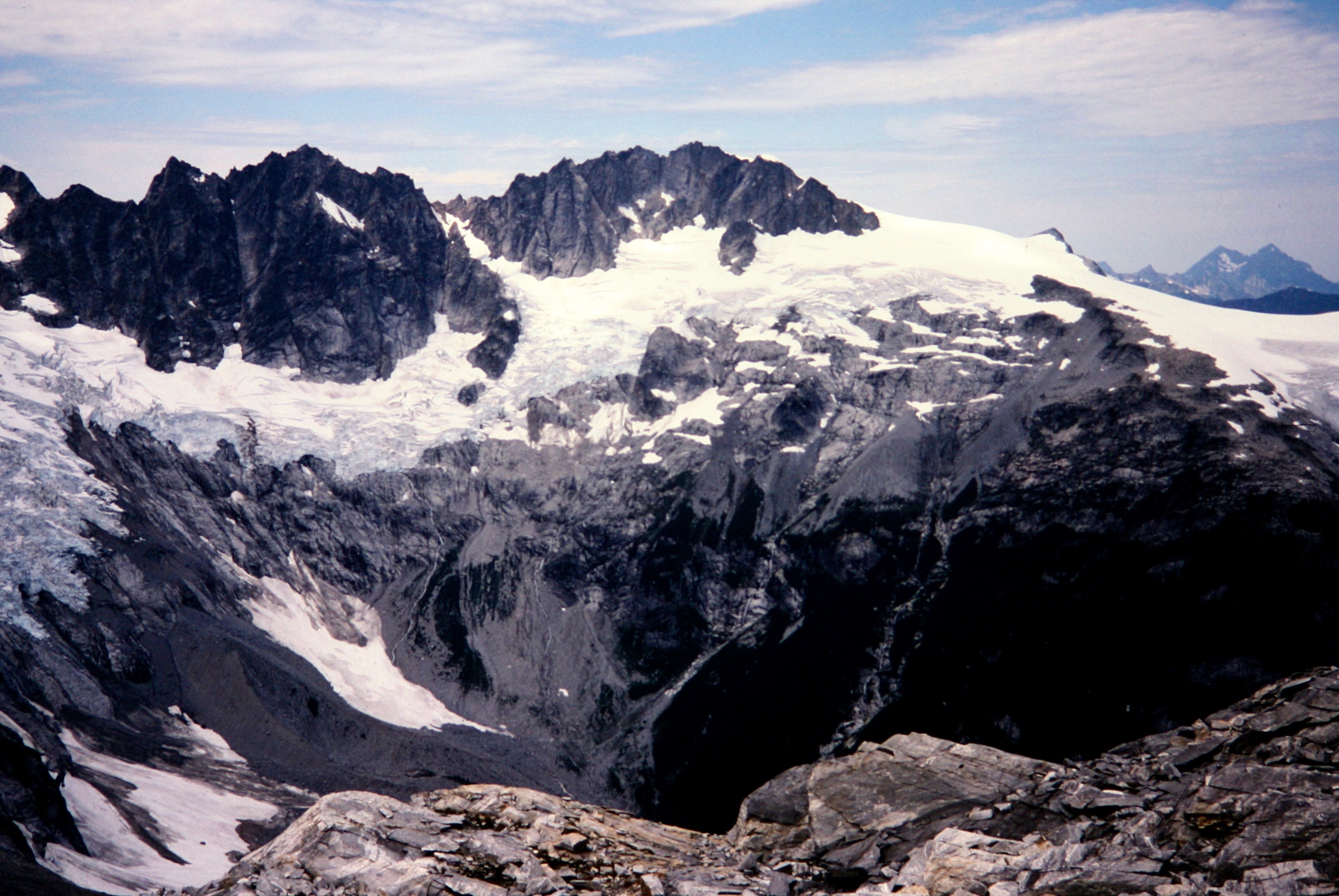 The East Peak of Mt Fury rises above a black cliff and steep glacier as seen from Luna Pass in the Picket Range