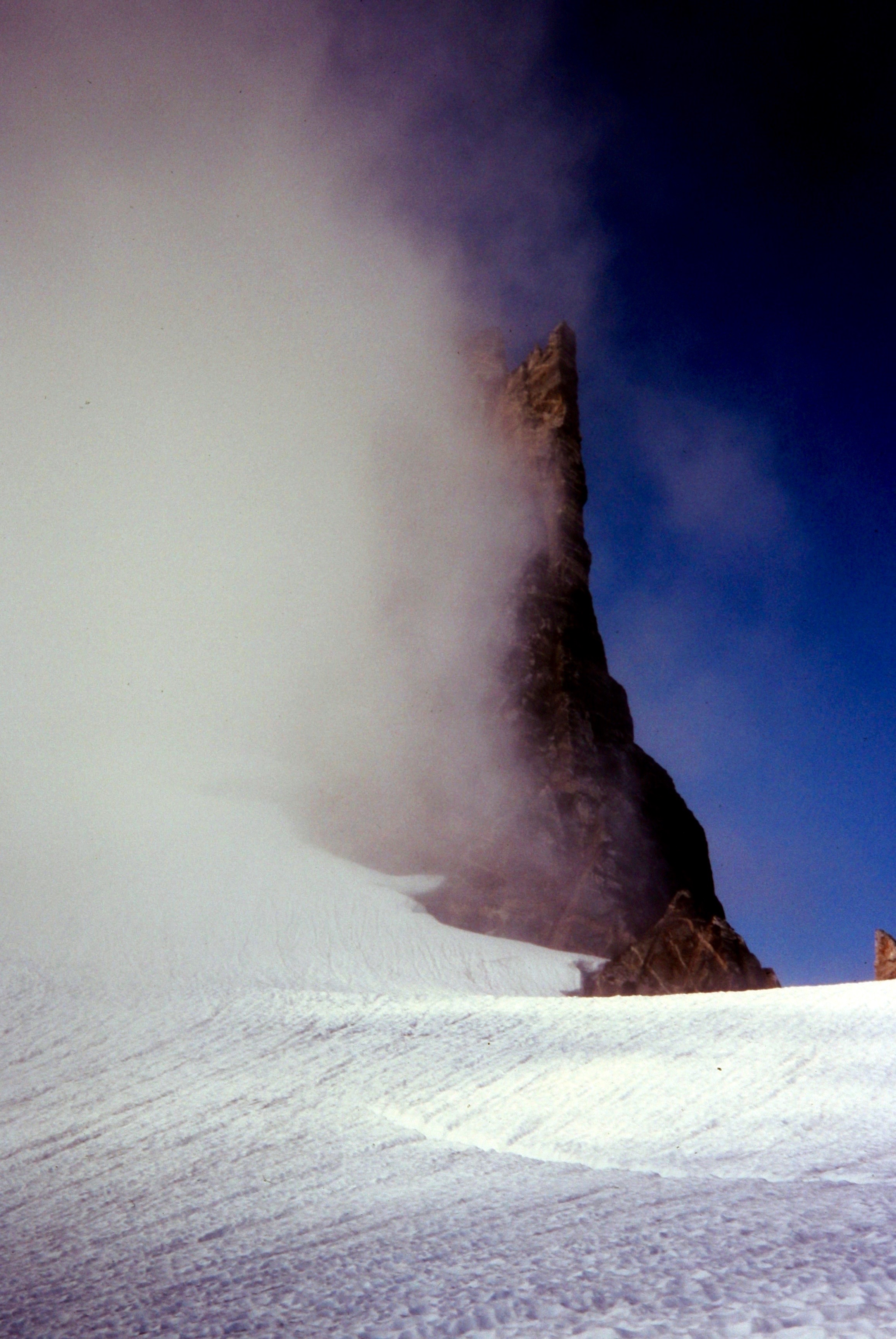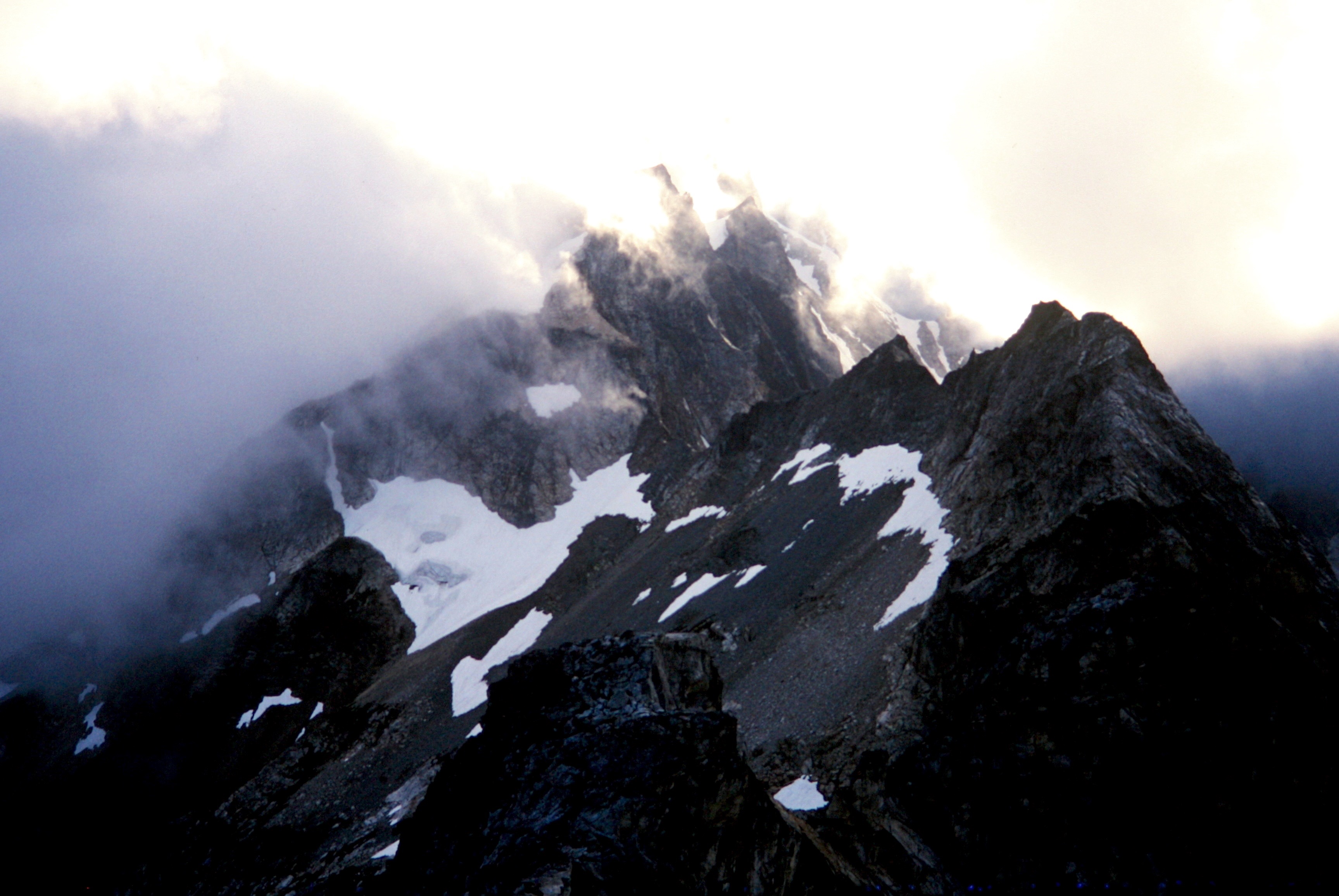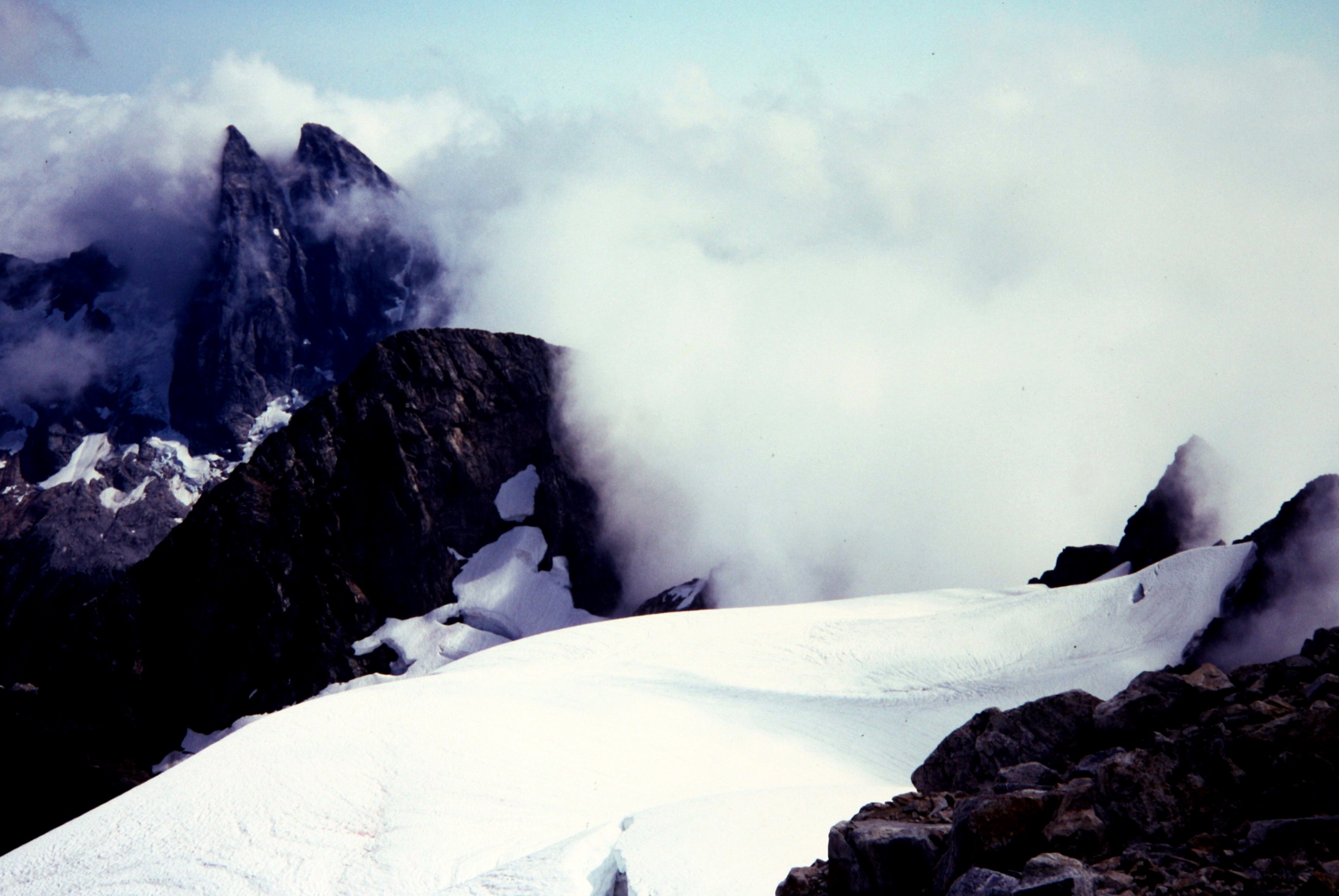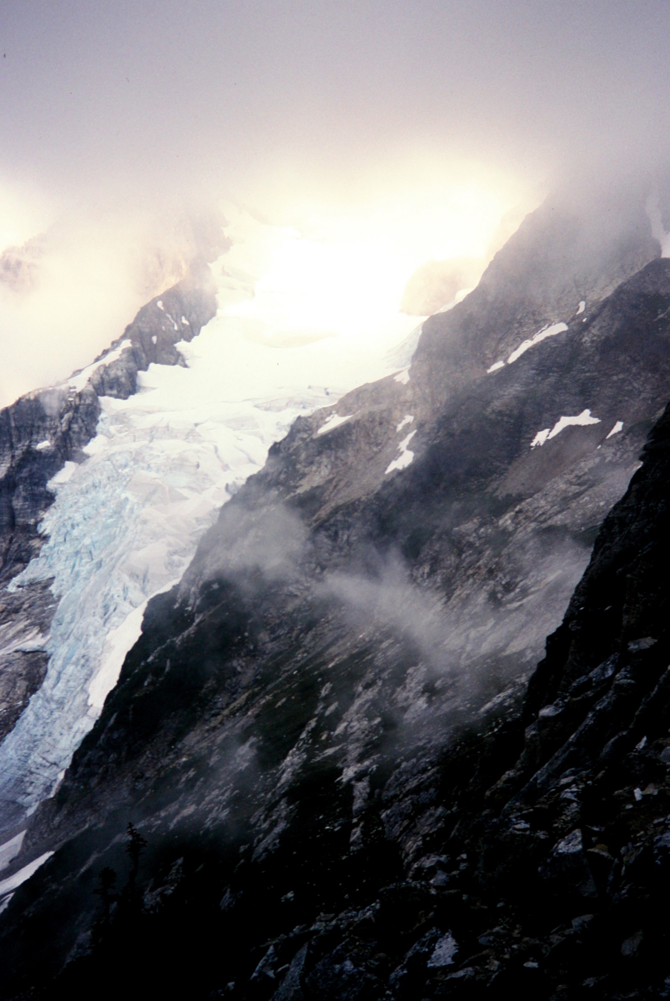 Fog concelling the summit horn of East Mt Fury in the Northern Pickets exposing the Fury Glacier