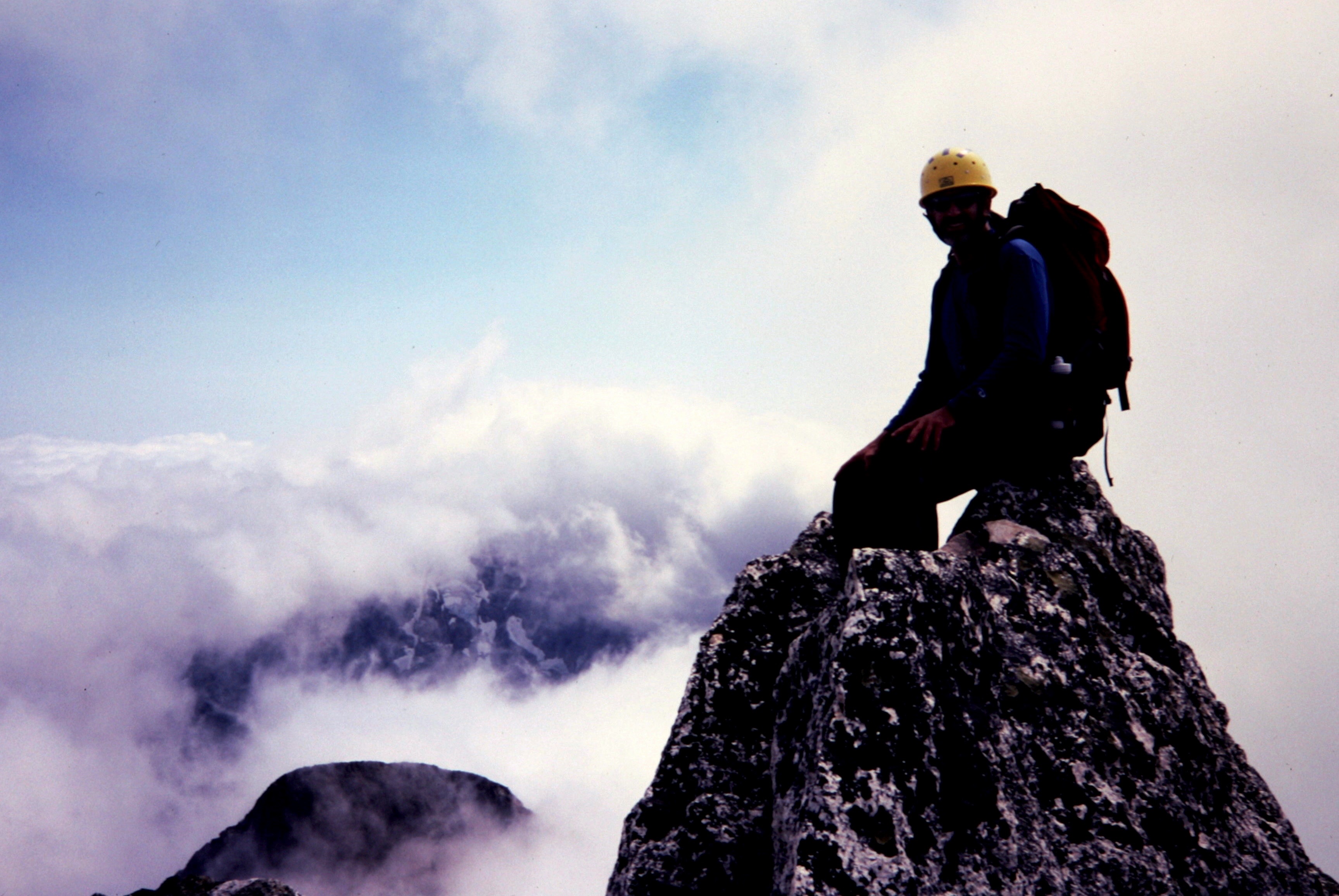 The Northeast Ridge’s challenges begin scant minutes beyond Luna Pass. The route appears to be blocked by a menacing rock knob, which towers 100 feet over the pass and drops off steeply to each side. Almost miraculously, however, a broad ledge cuts across the northwestern (right) face and allows easy access to the unexpectedly gentle ridge crest (I had scoped this out the night before). Soon, we were wandering along the crest, which gained a mystical quality in the wafting fog.