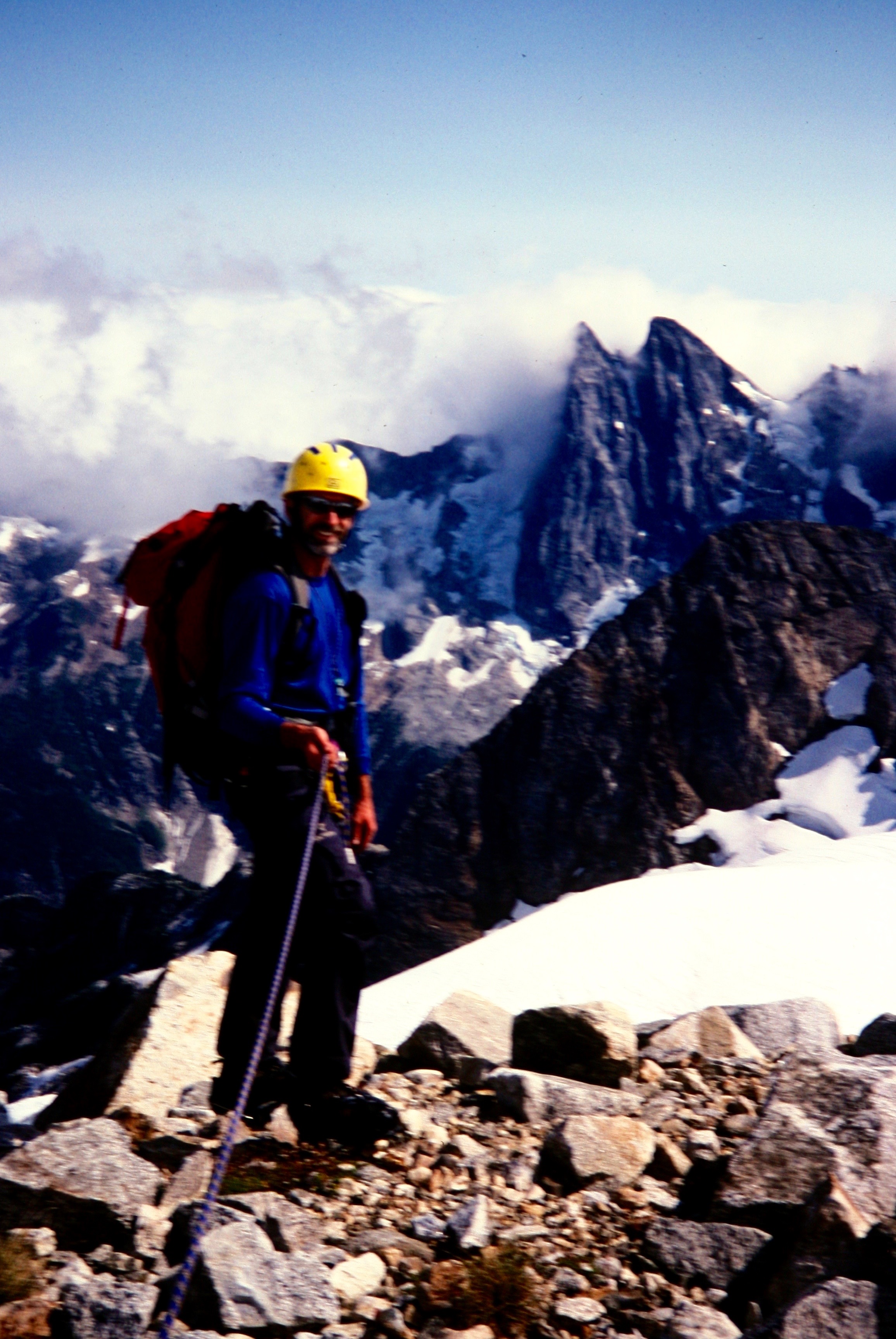 looking down on mountain climber scrambling up steep rocky face of Luna Peak in the Northern Pickets