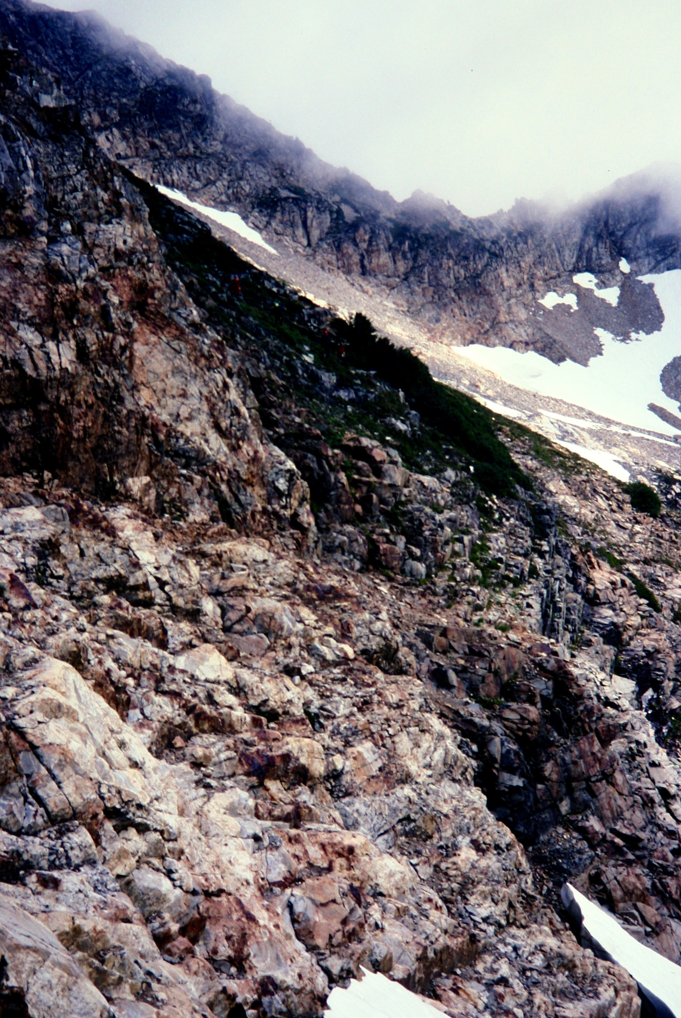 Our group confidence had hit bottom at this point, so I dearly hoped that the ledge would turn out to offer a safe, easy traverse.  It didn’t.  Instead, I found myself clinging to a loose, vertical wall while carefully edging along a rotten, down-sloping, pebble-strewn catwalk.  I crossed nervously and encountered a steep scree slope on the other side of the rib.  After clawing up the slope, I squinted through the fog and thought I could see…snow!  Could this be the Southeast Glacier?