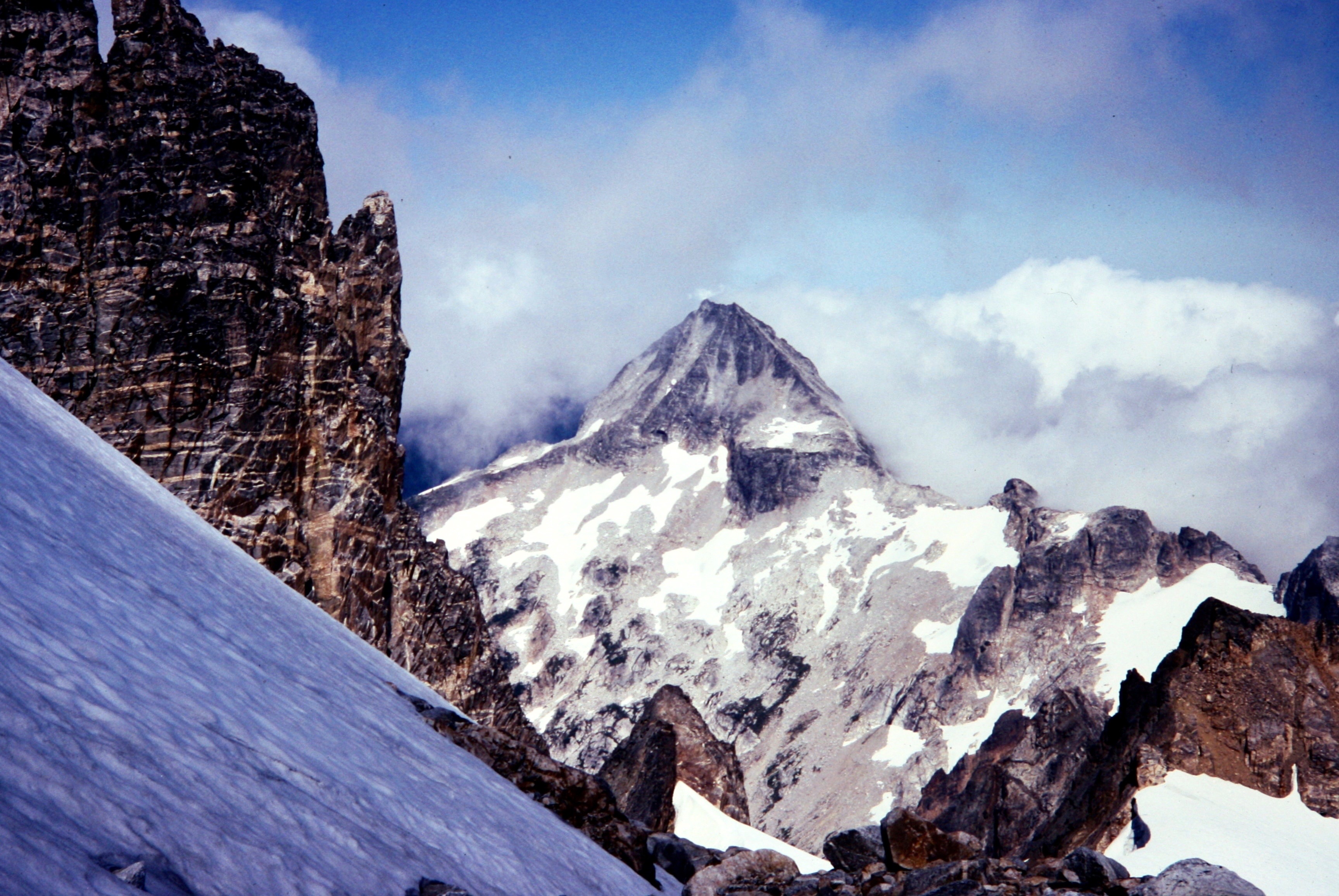 Clouds On East Mt Fury Peak with snow fields in foreground in the Northern Picket Range