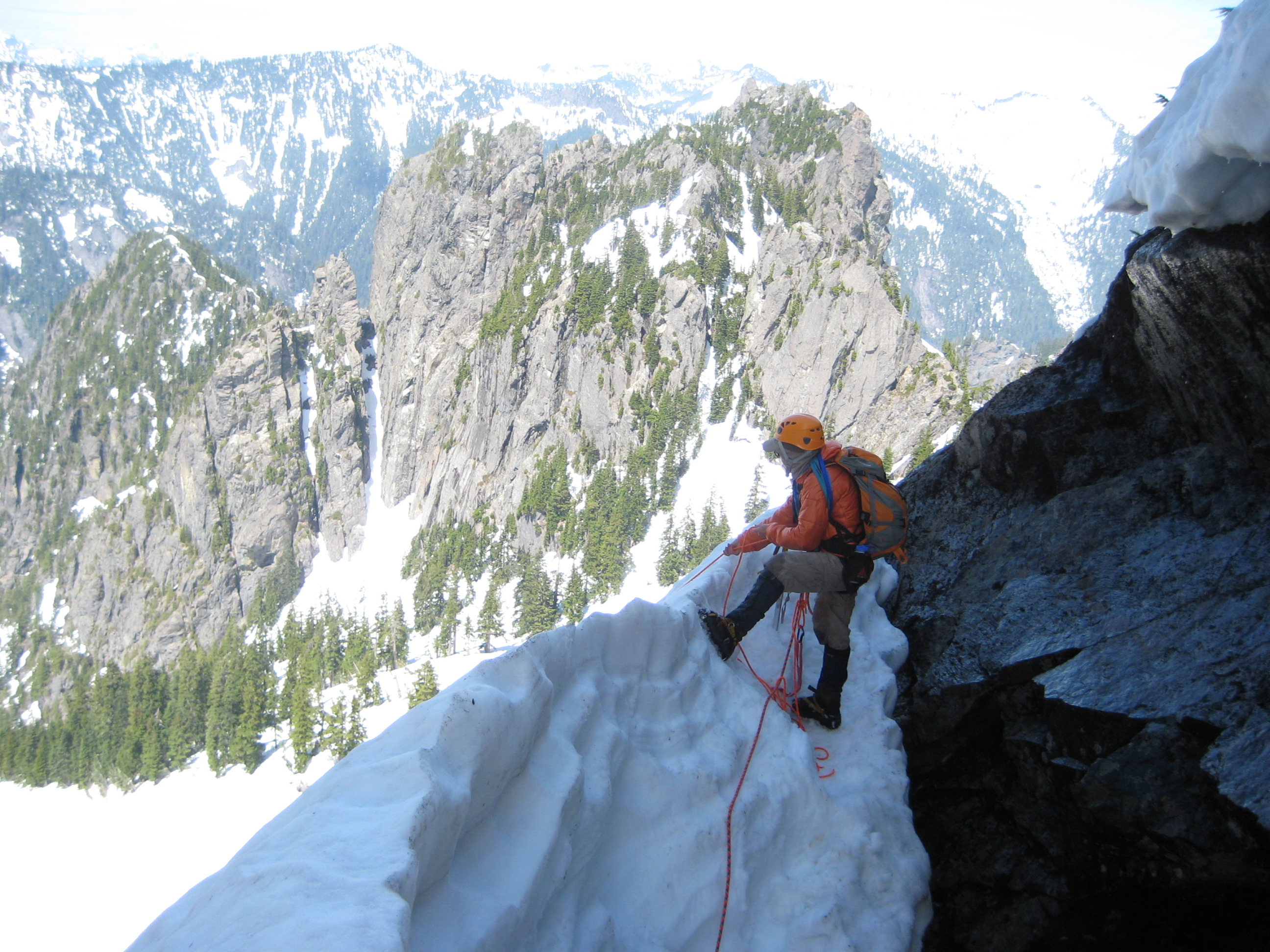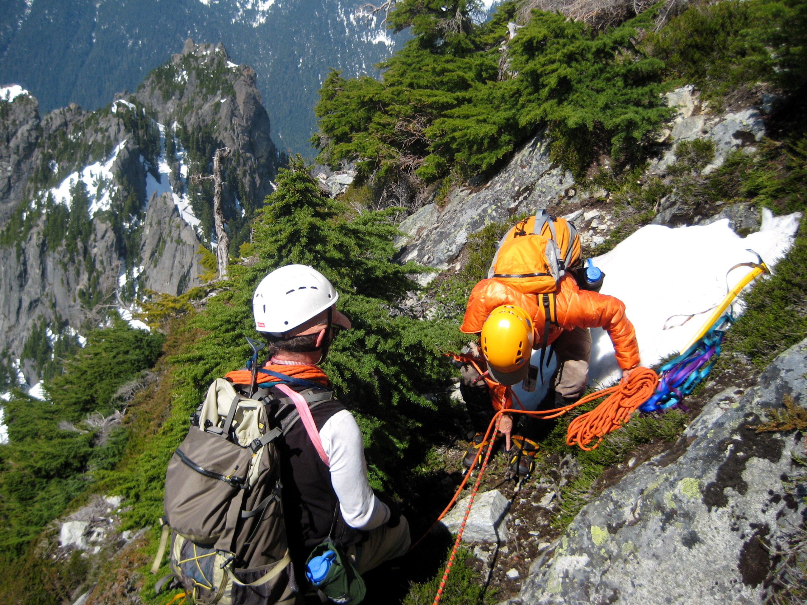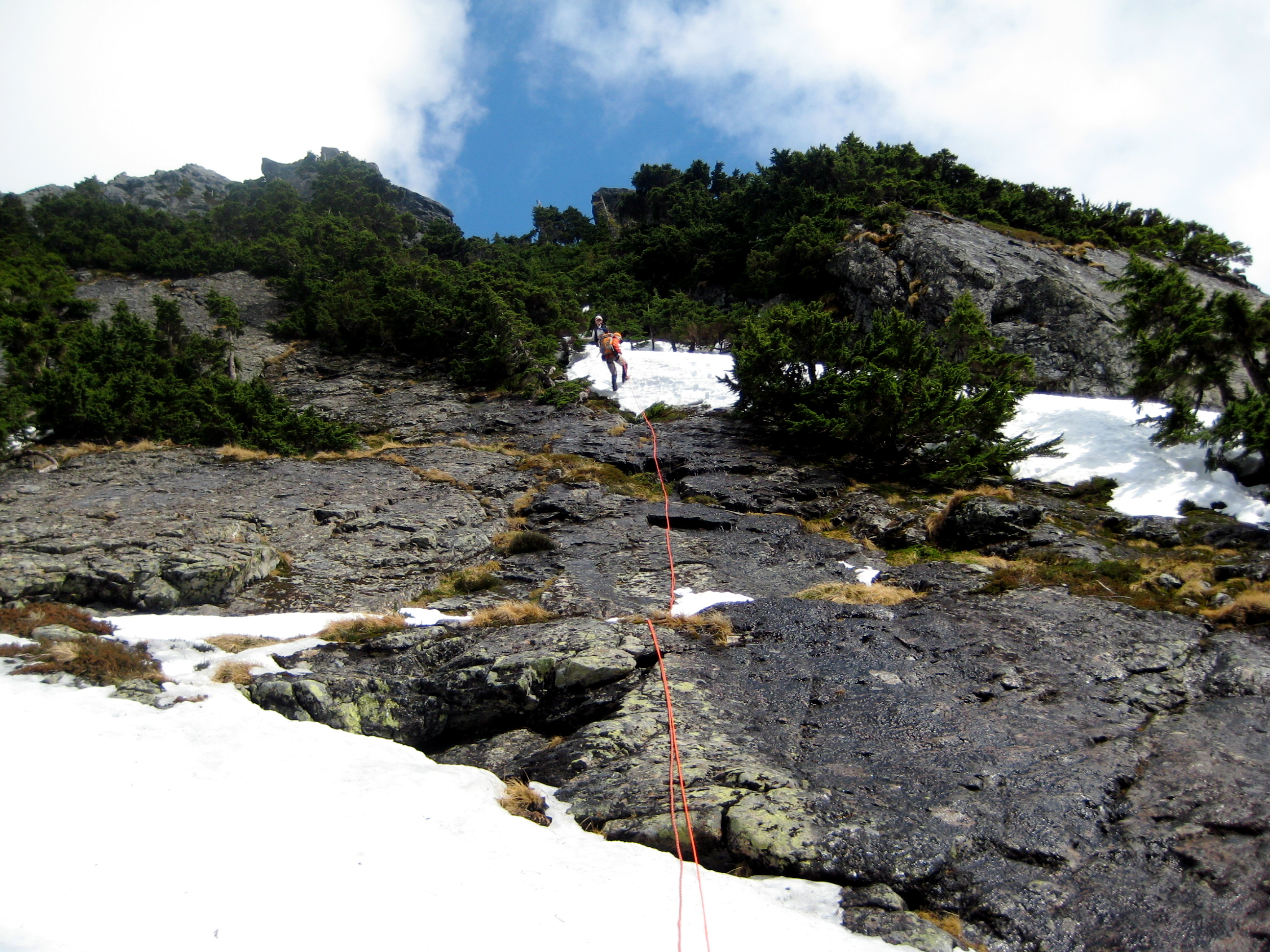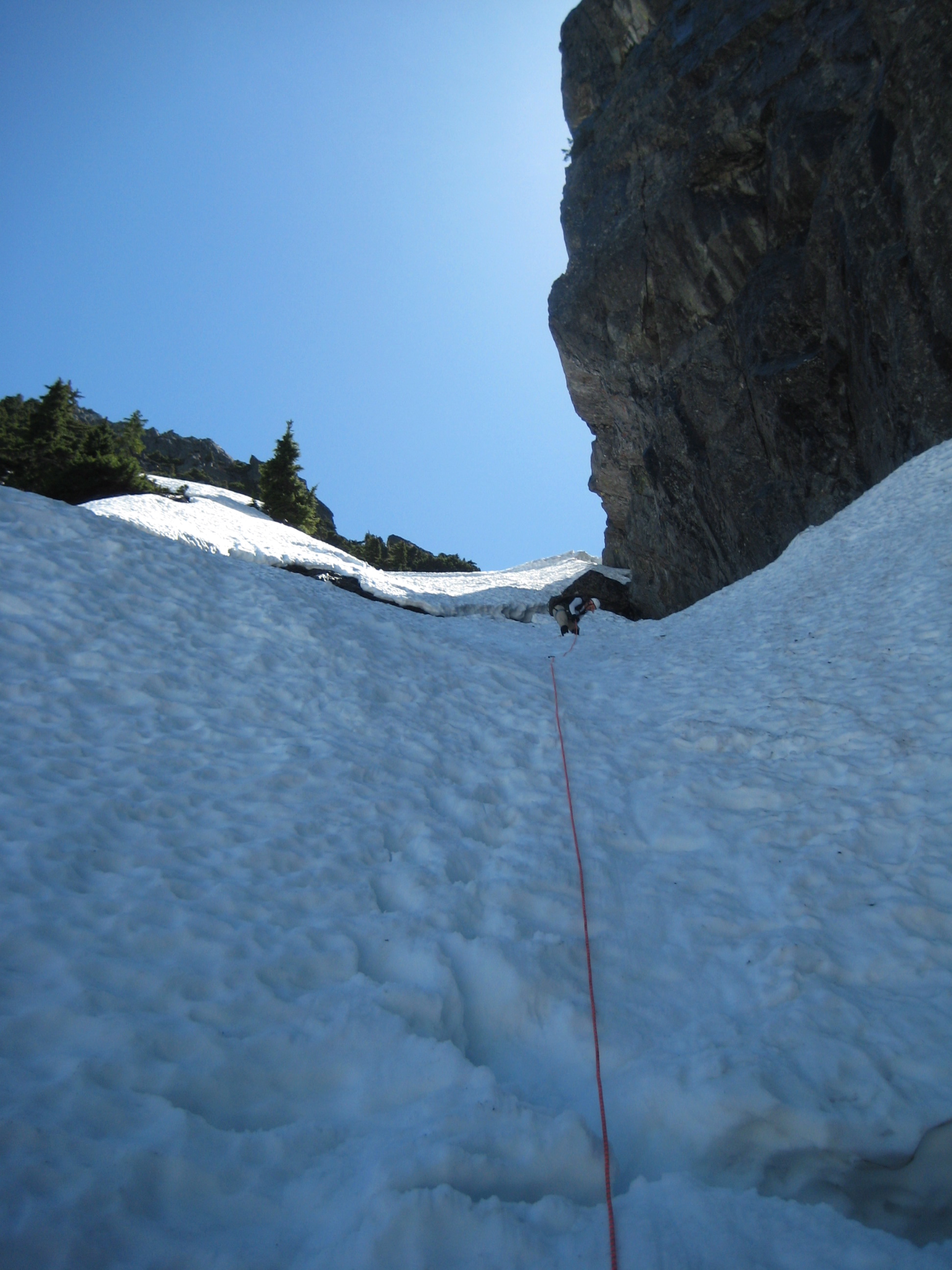 From there, we maintained running belays while ascending steep snow, heather, and rock on the west ridge.