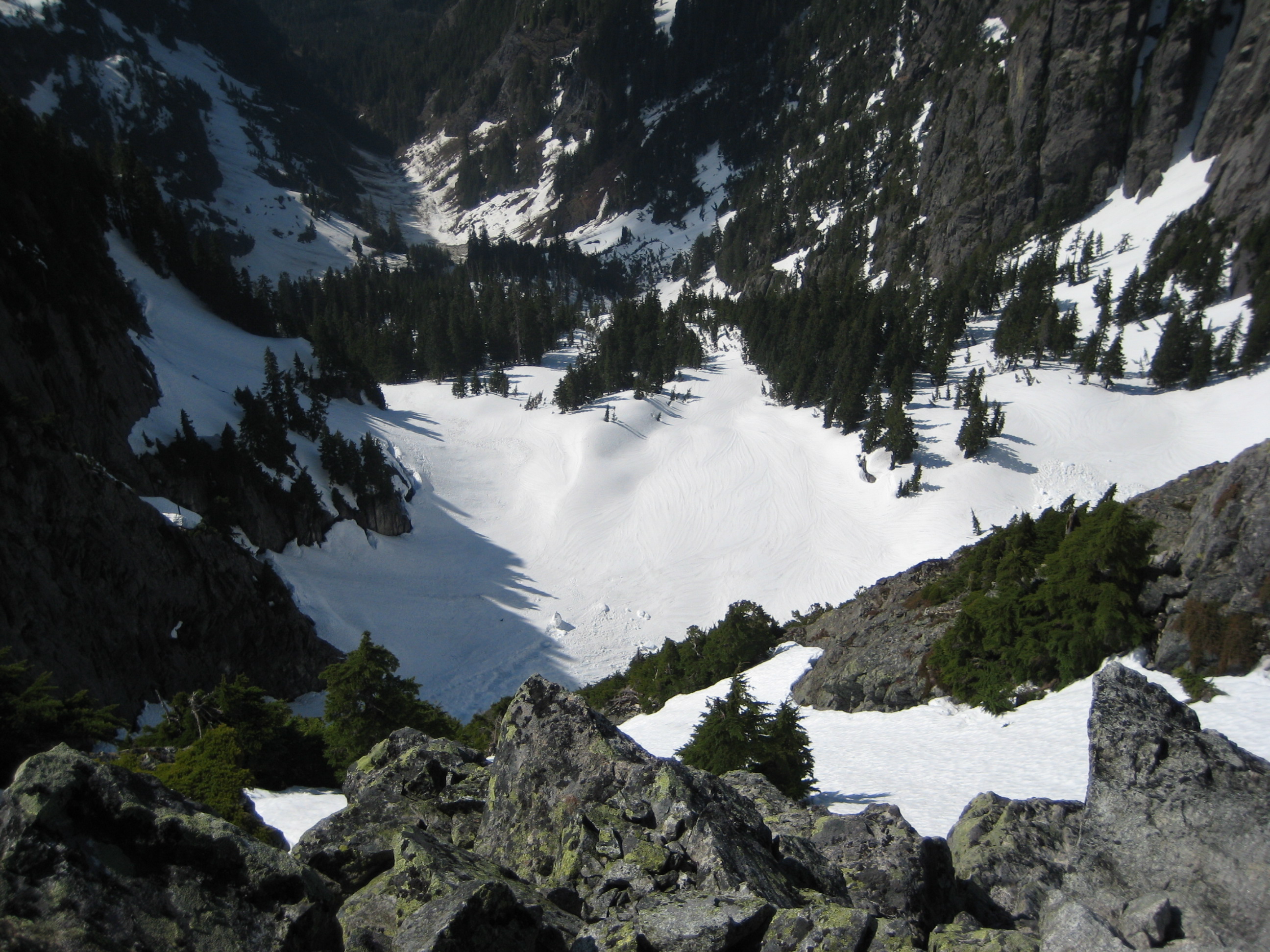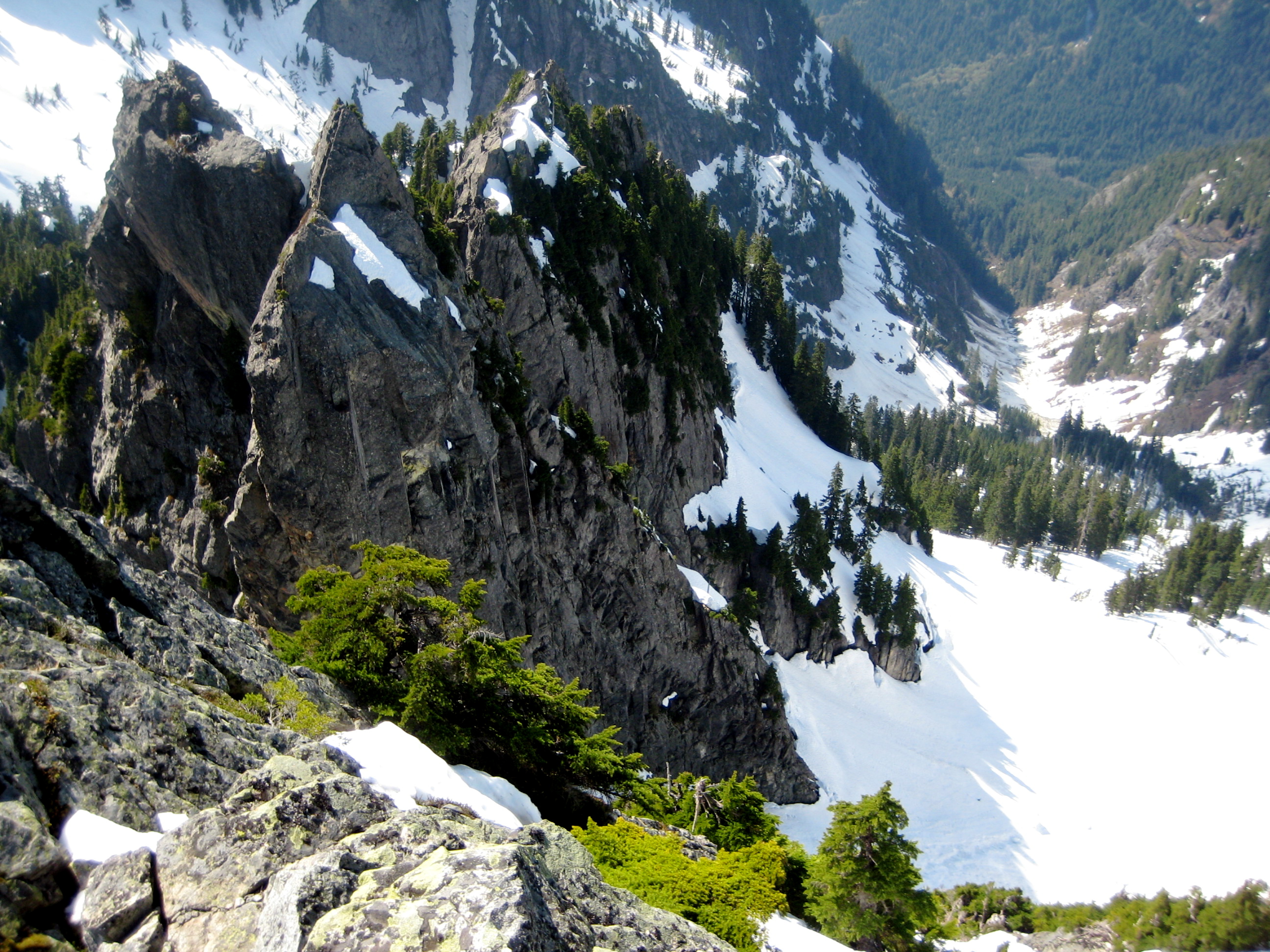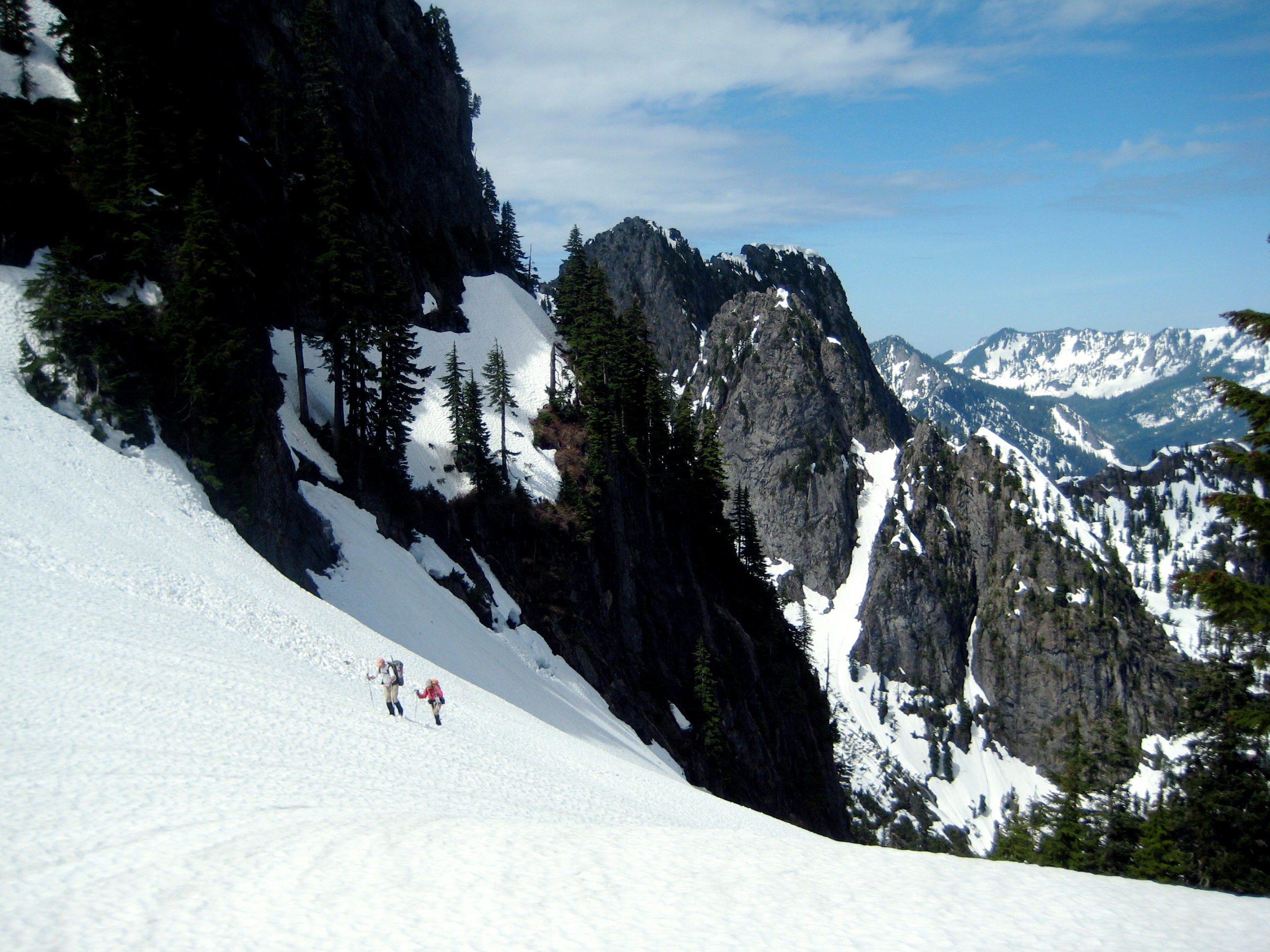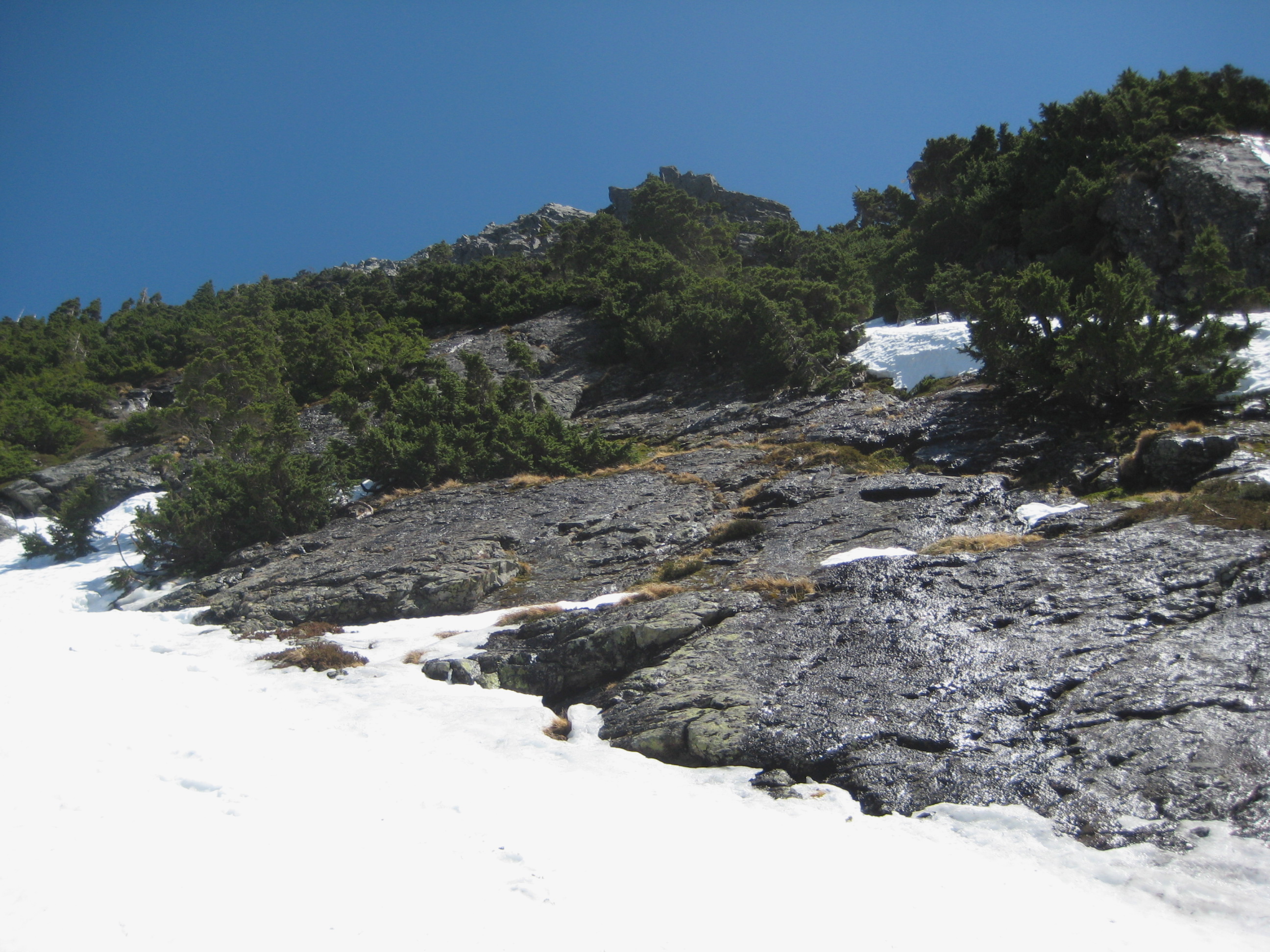 From there, we maintained running belays while ascending steep snow, heather, and rock on the west ridge.
