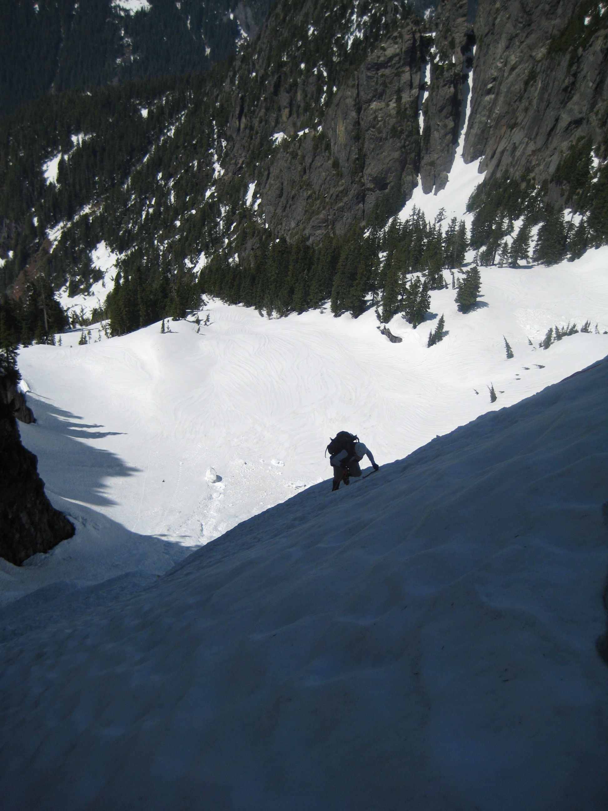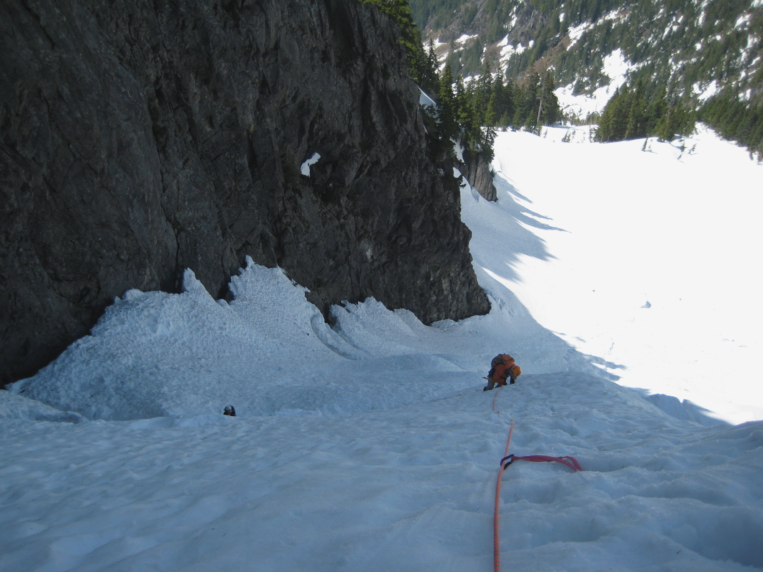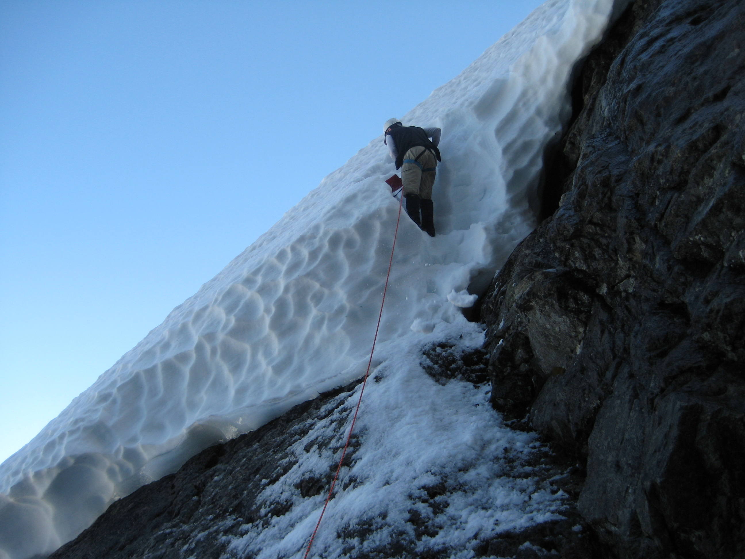 We crossed the first breach on an improbably thin snowbridge (tested by Mike), and ascended steep snow to the second breach.