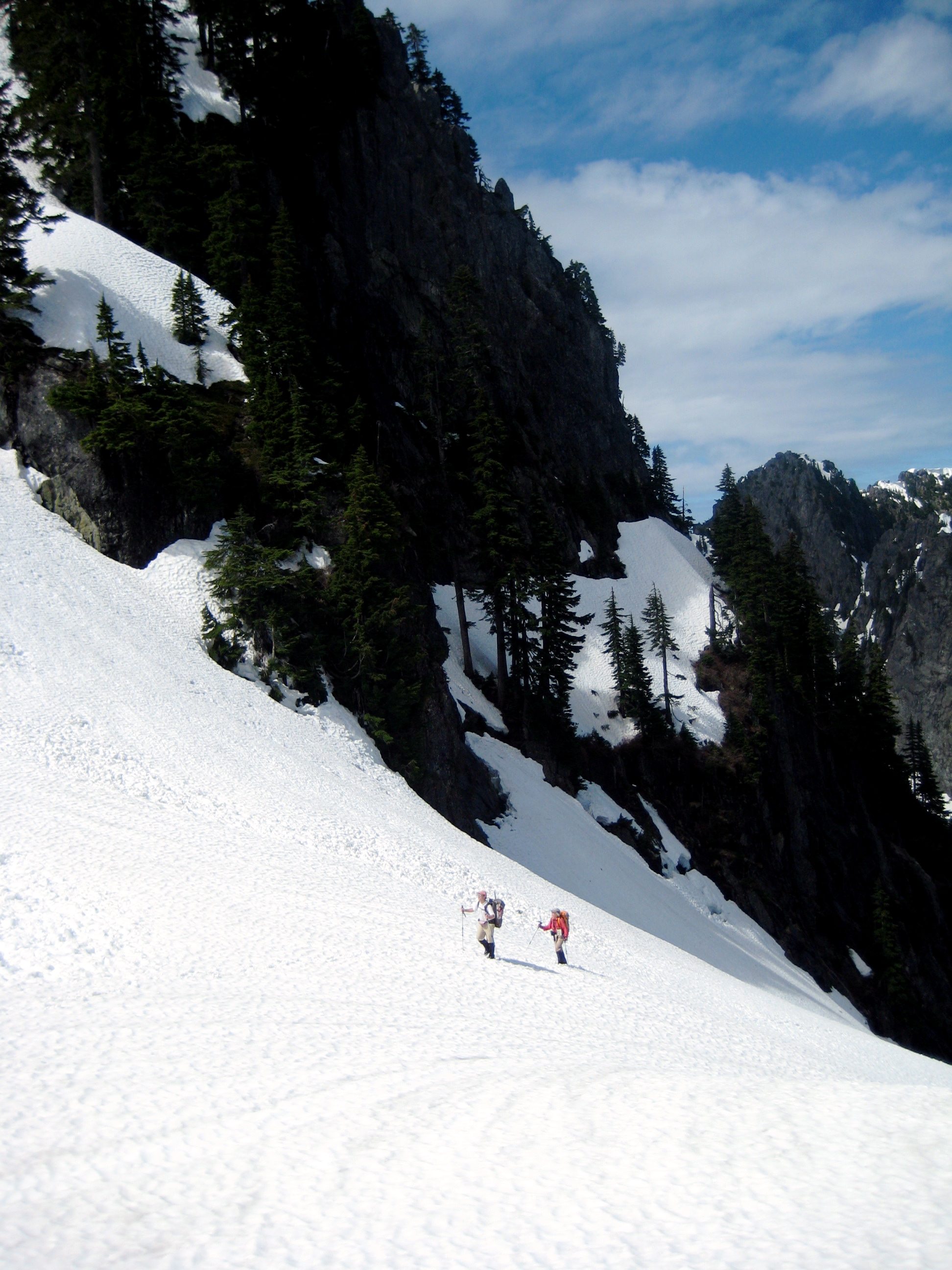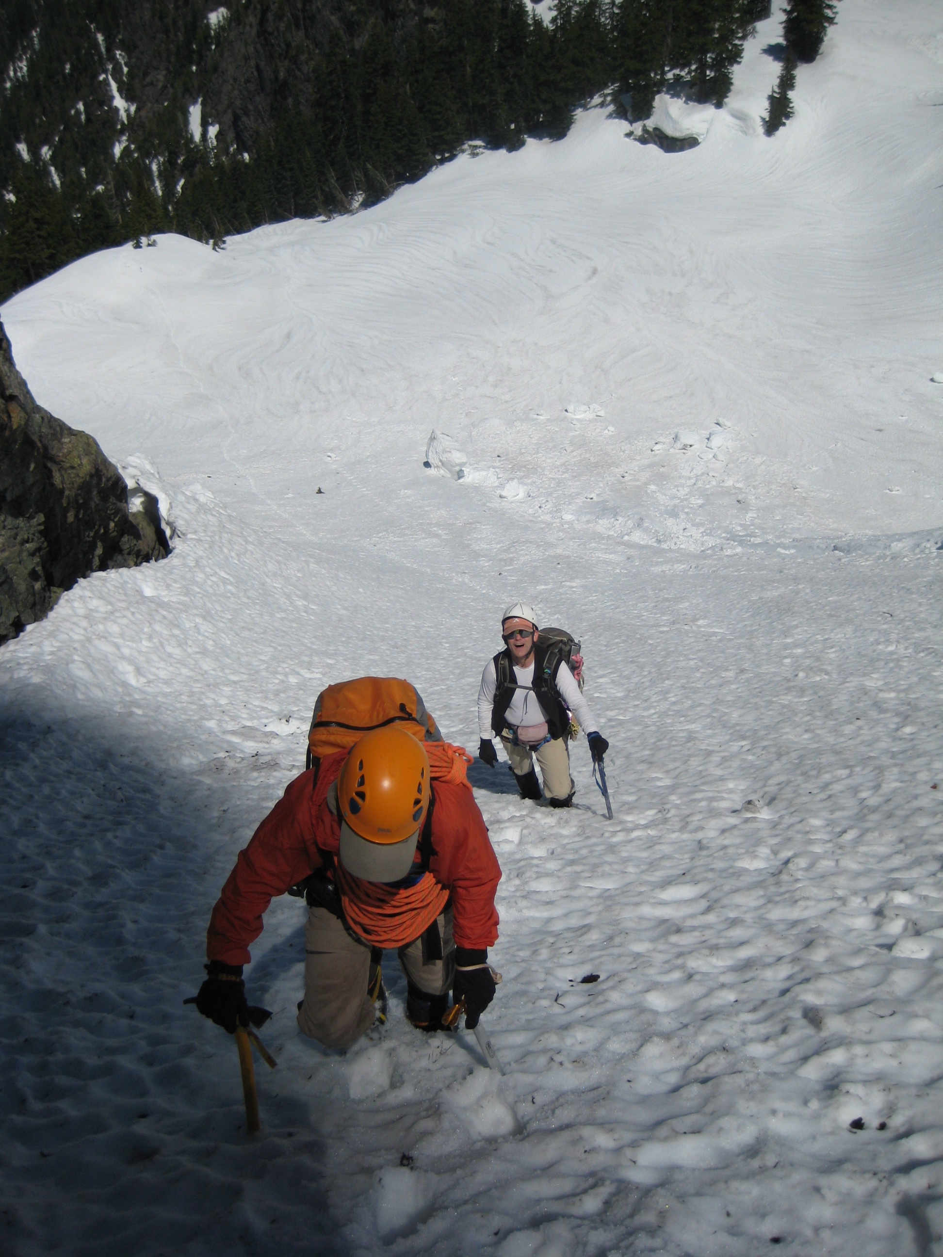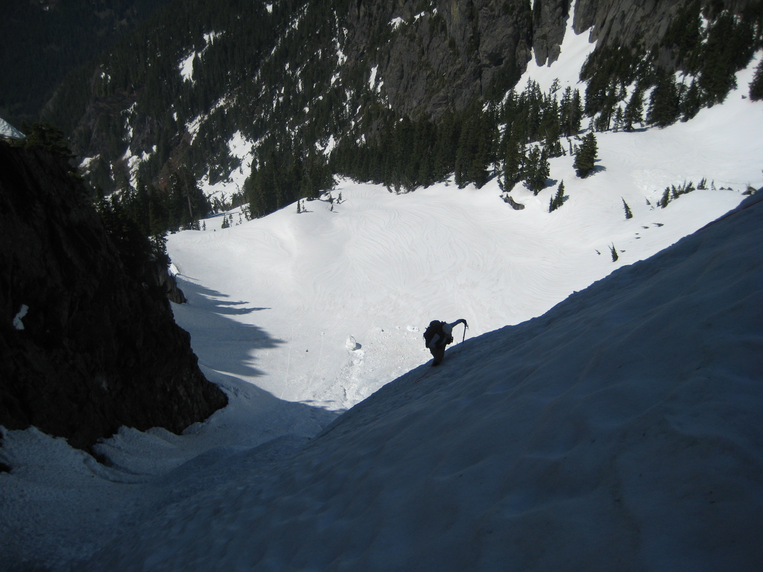 We crossed the first breach on an improbably thin snowbridge (tested by Mike), and ascended steep snow to the second breach.