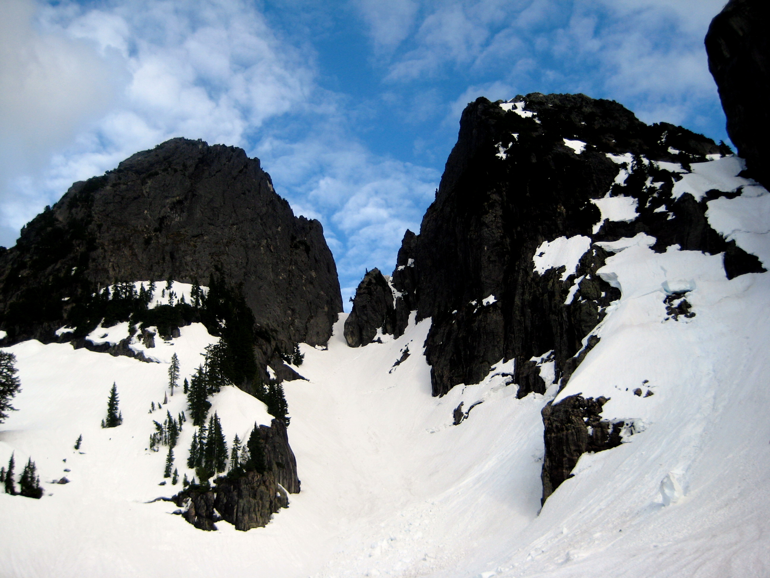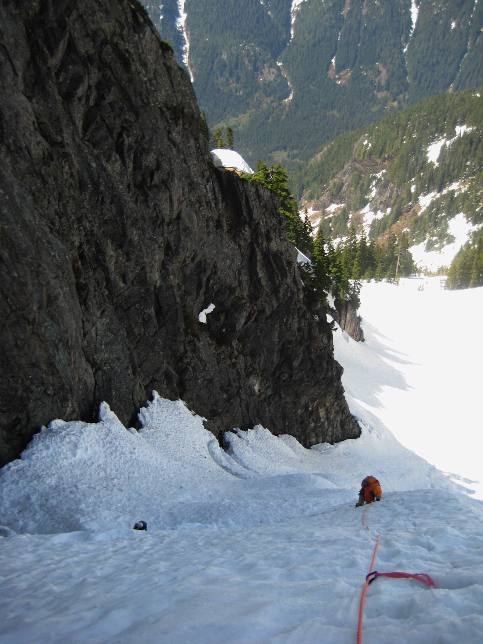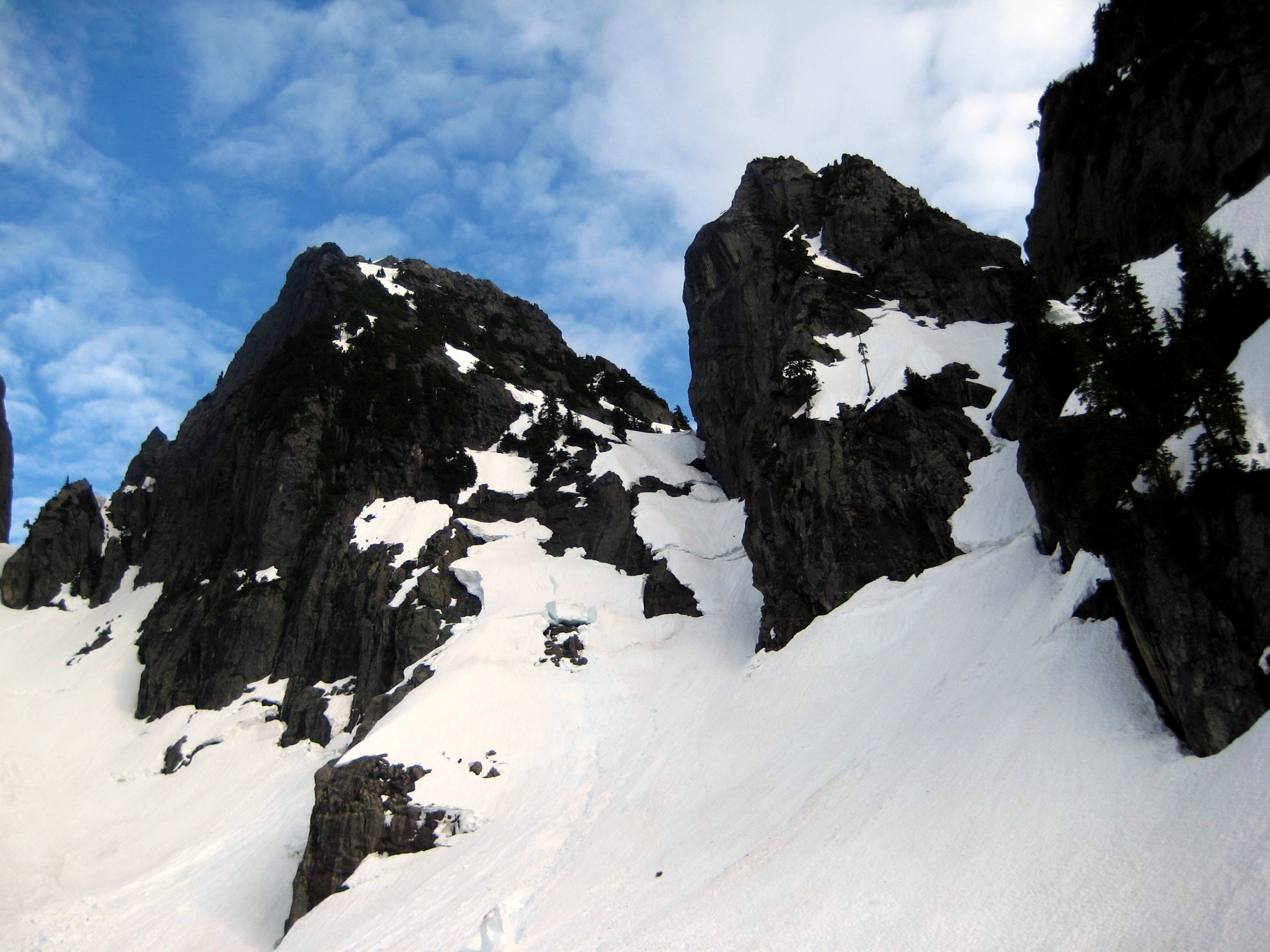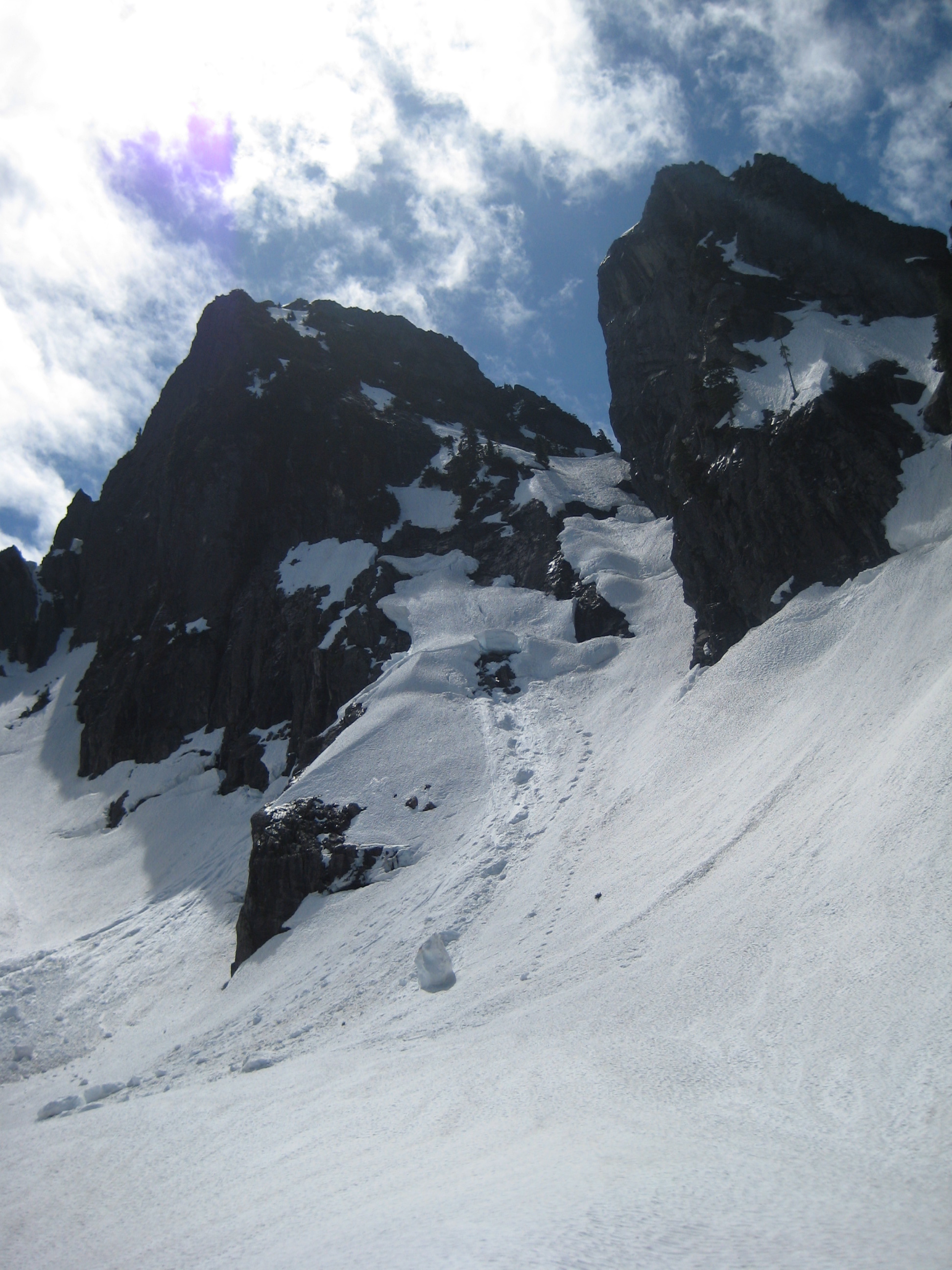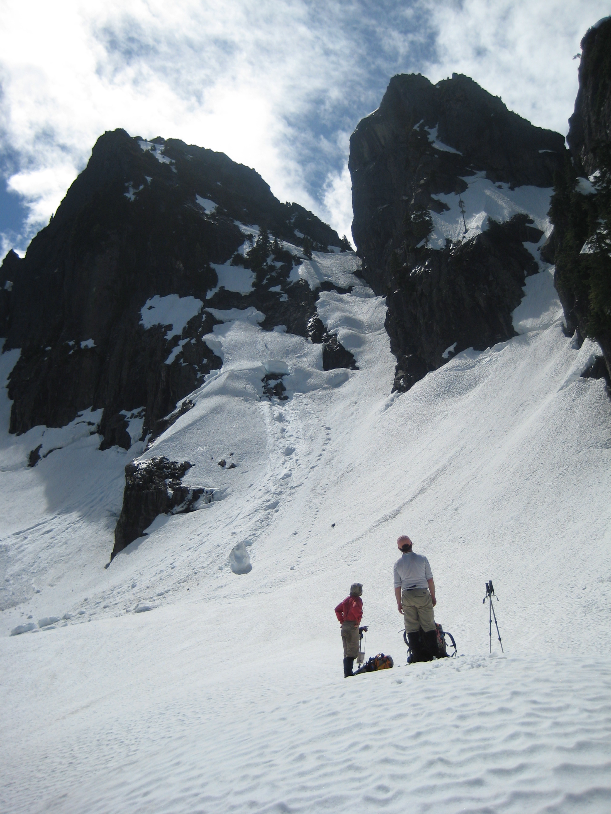 The route from this basin to the west col, which separates the Main Peak from Leaning Tower, was a steep snow couloir with three apparent breaches. Although it seemed unlikely that we could get past all three breaches, we headed up to at least get a closer look. Unfortunately for the mountain, we had Mike on our side.