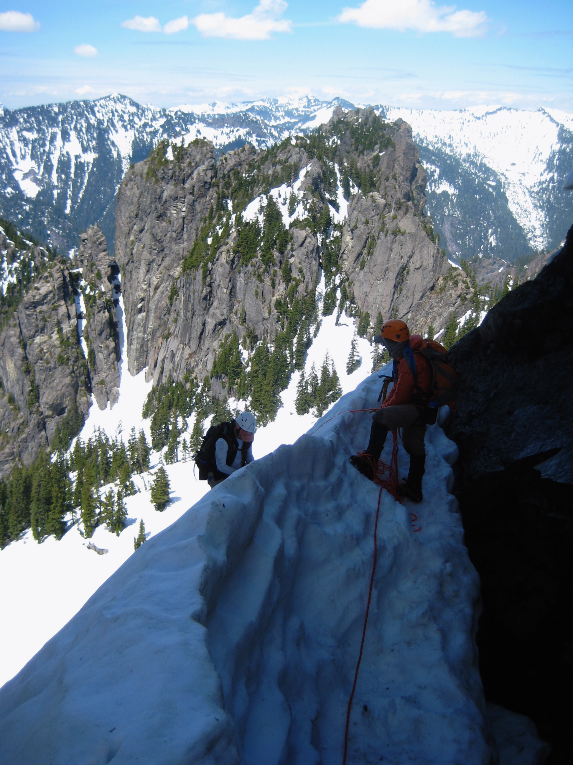 Amazingly, it worked! A half hour later, we were climbing up to the third (partial) breach, which made for a solid belay stance and was easily turned on the right to reach the west col (7.9 hours from car).
