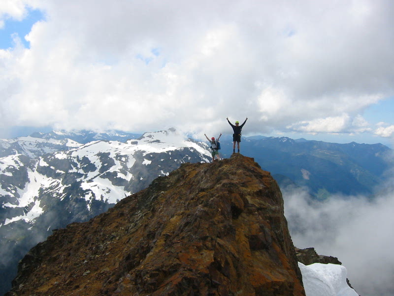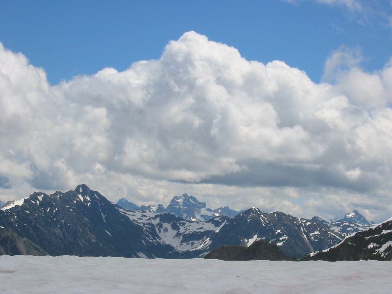 We topped out at 3:00pm (5.0 hours from TH) and spent a lazy hour admiring the steadily improving views as the clouds dissipated. American Border Peak and Mt. Slesse flirted with us the whole time, never wanting to give more than a partial look.