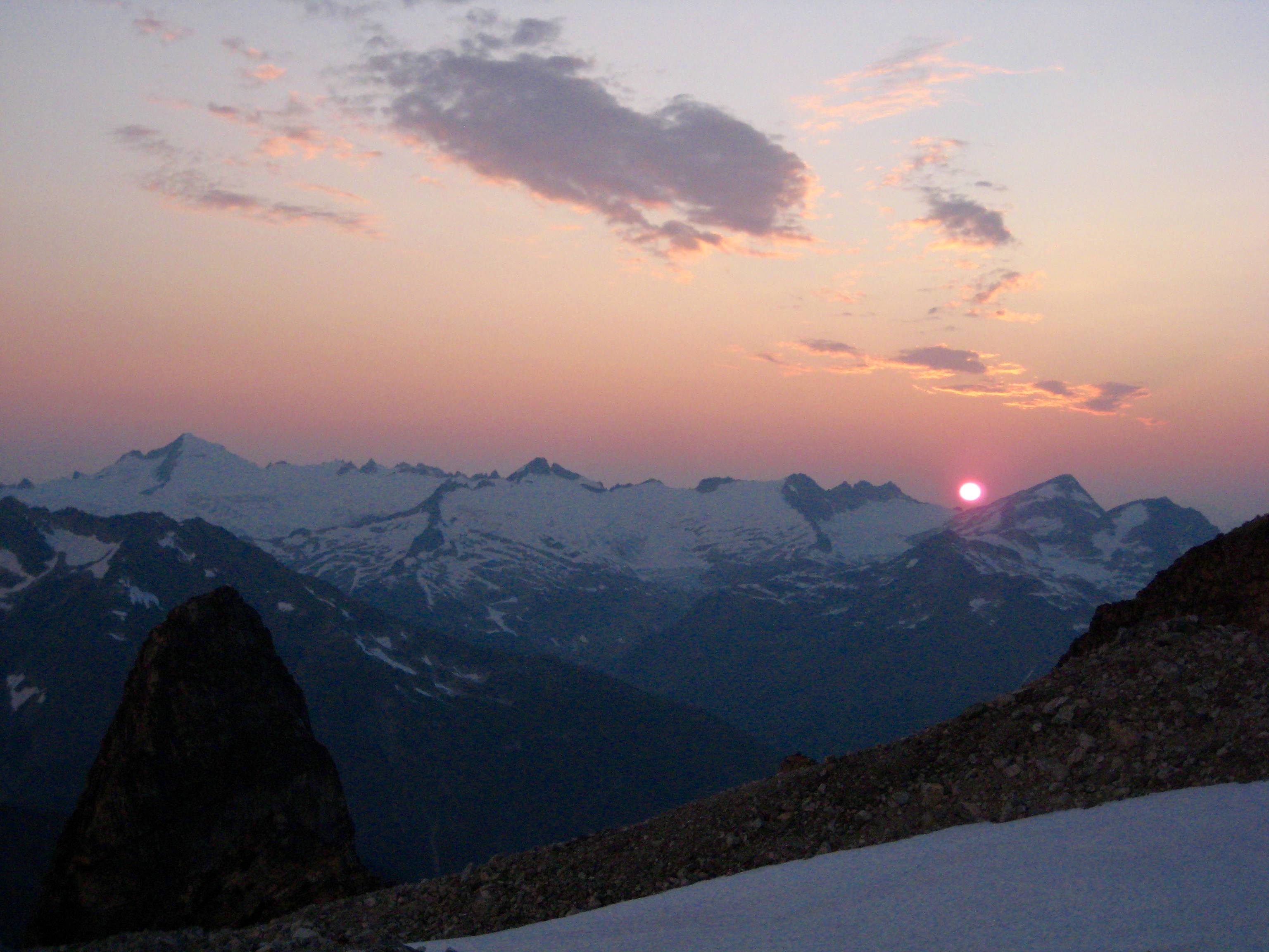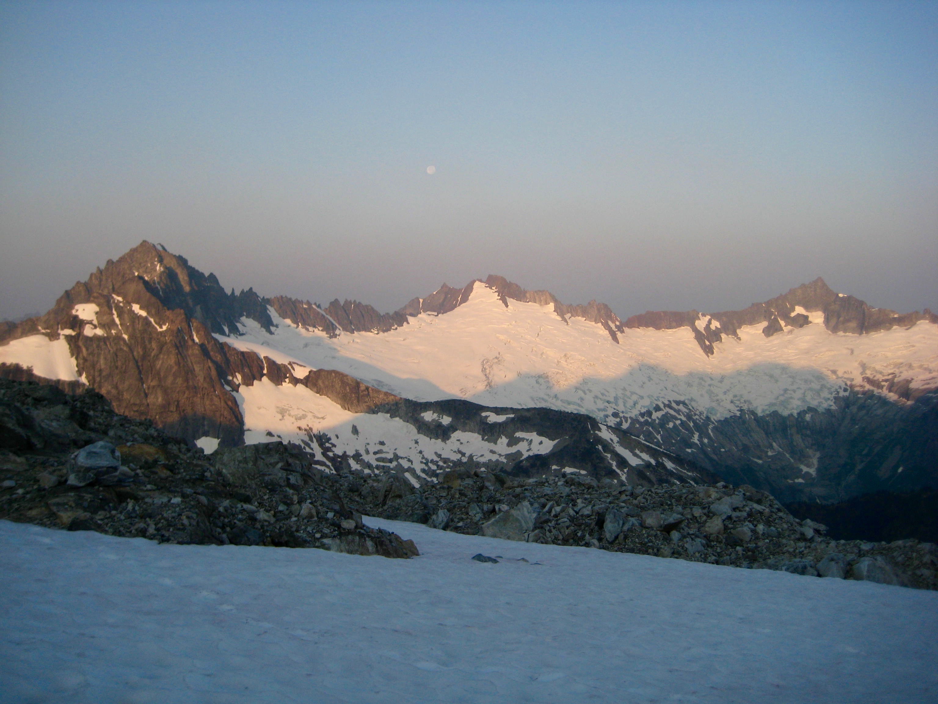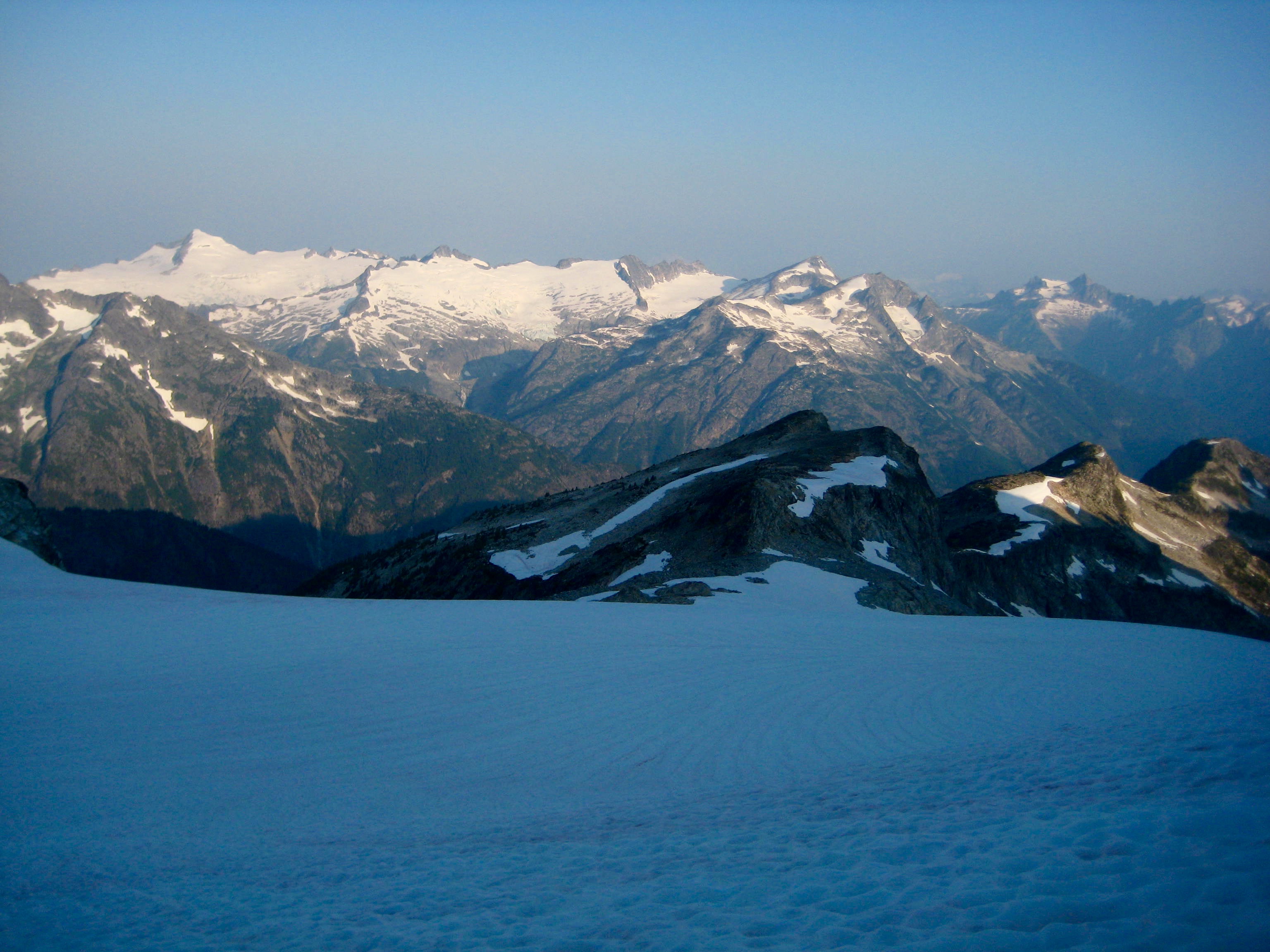 It was now only mid-afternoon, giving us time for a run at the summit, but the 90-degree heat had boiled off our zeal. Therefore, we spent the rest of the day resting, rehydrating, and preparing for a summit climb in the morning. Views of the Boston Glacier and associated peaks across the valley provided visual entertainment despite a heavy haze in the air. (We later learned that lightning strikes had started several forest fires in the region.)