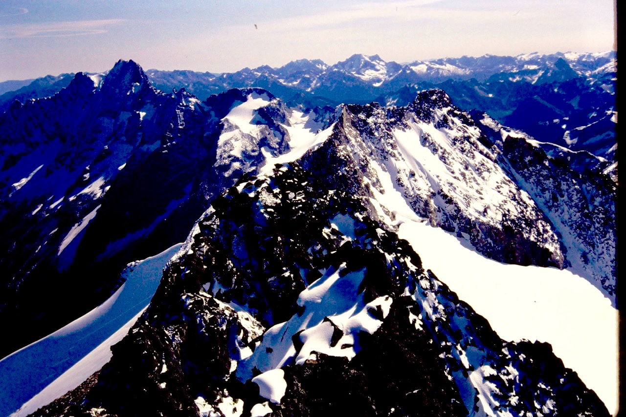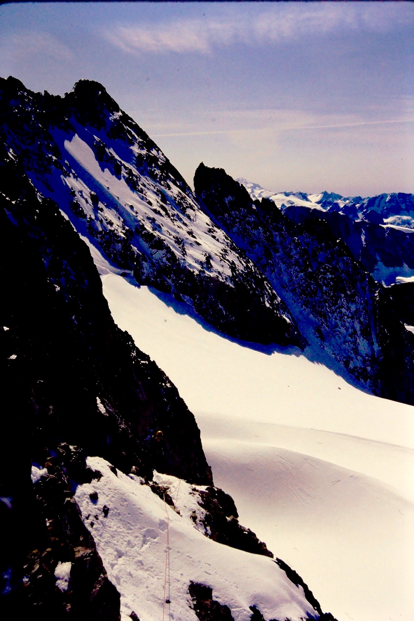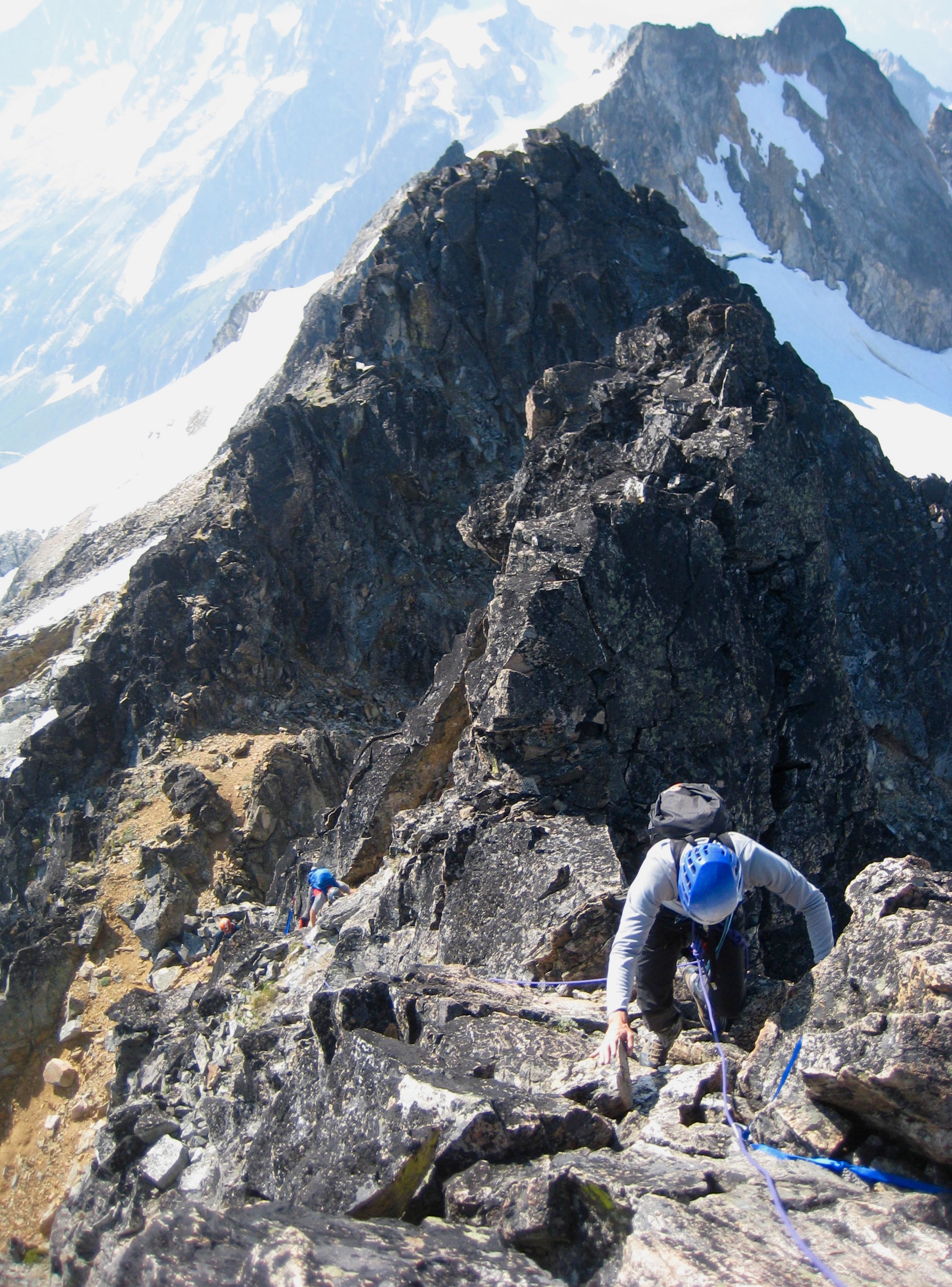 Upon reaching a snow hogback at the uppermost edge of the glacier, we roped up and climbed a Class 3-4 rock pitch to a left-slanting ramp on the western side of the summit ridge.