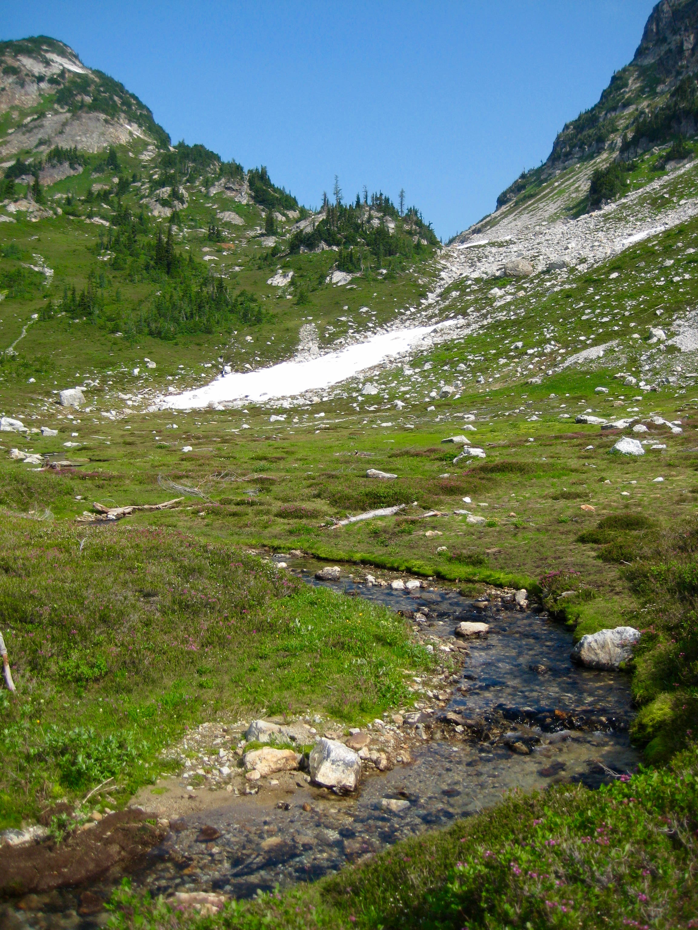 At 12:45pm, we began hiking up the Stehekin River Road/Trail in sweltering heat. We stopped in the shade at Bridge Creek Camp before continuing on to Park Creek Camp/Trailhead (3.8 hours + 1000 feet from High Bridge).
