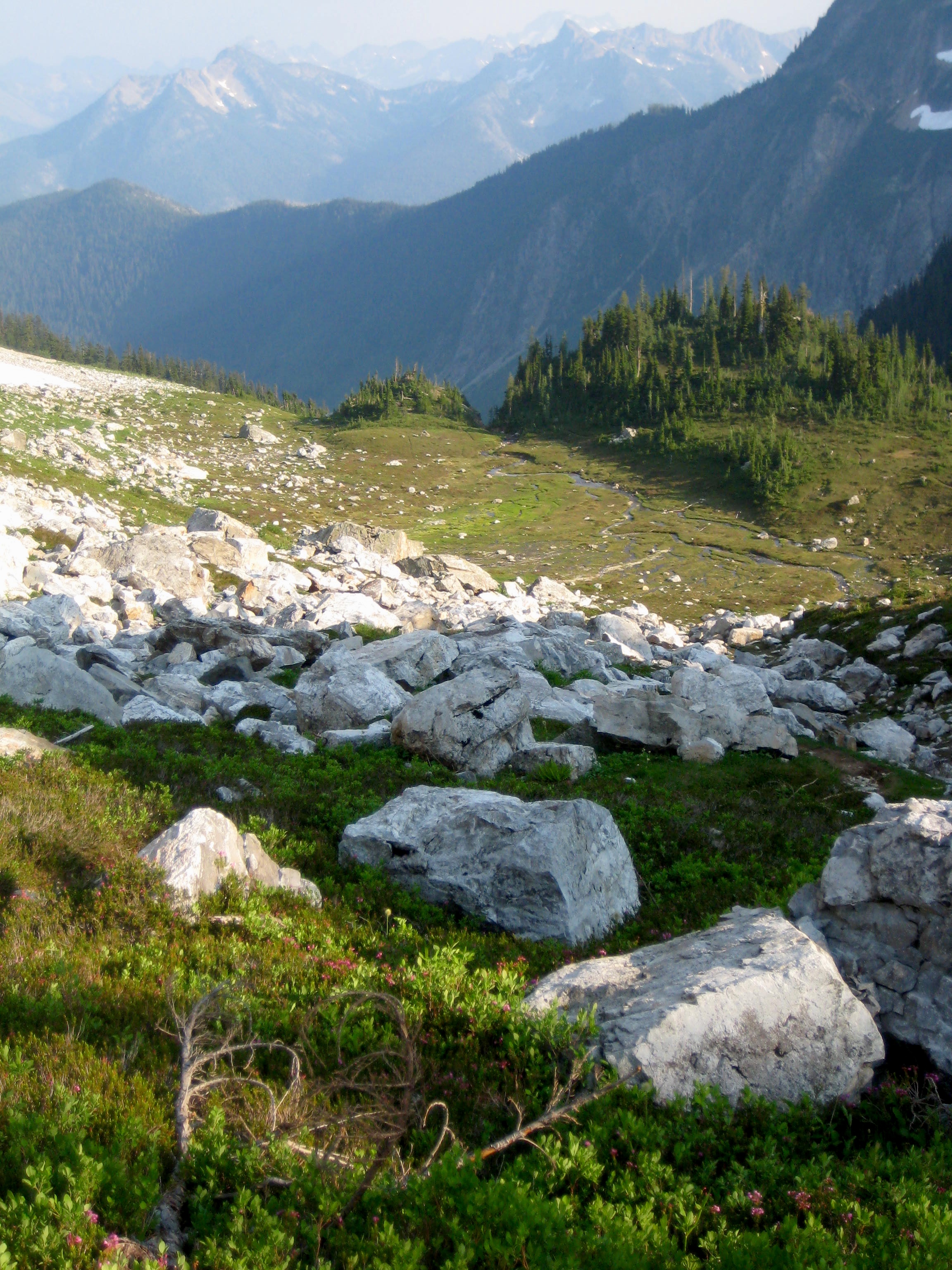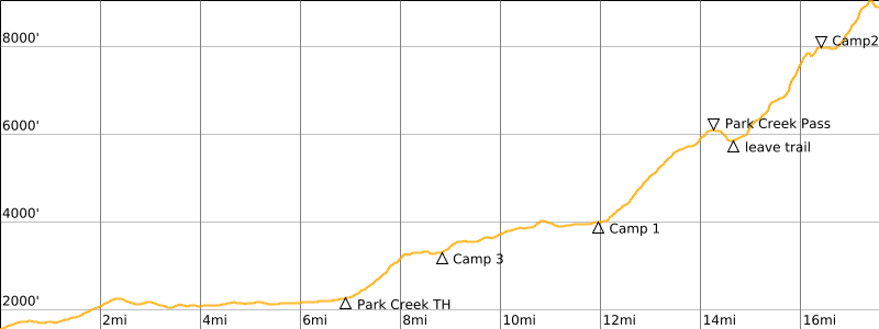 We awoke to clear skies and were on the trail at 8:30am. By the time we reached Park Creek Pass (1.8 hours + 2050 feet from Buckner Camp), it was quite hot, so we sought out a shady nook for a rest stop. Park Creek Pass is a very long, flat, rocky trough—almost a geographic coulee—that separates gorgeous bouldery meadows on each end. Being 16 miles or more from any trailhead, it seems to entertain very few visitors.