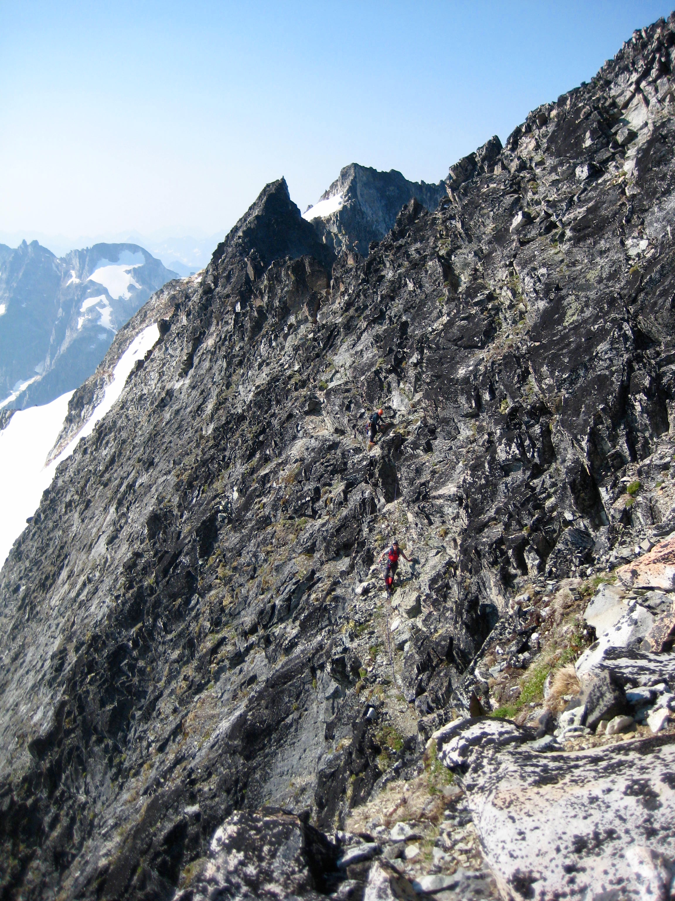 This ramp constitutes a weakness in the rock–possibly a geological fault or eroded dike. It leads to a slot in the ridge crest and continues onto the eastern flank as a series of wide but exposed Class 2-3 ledges.