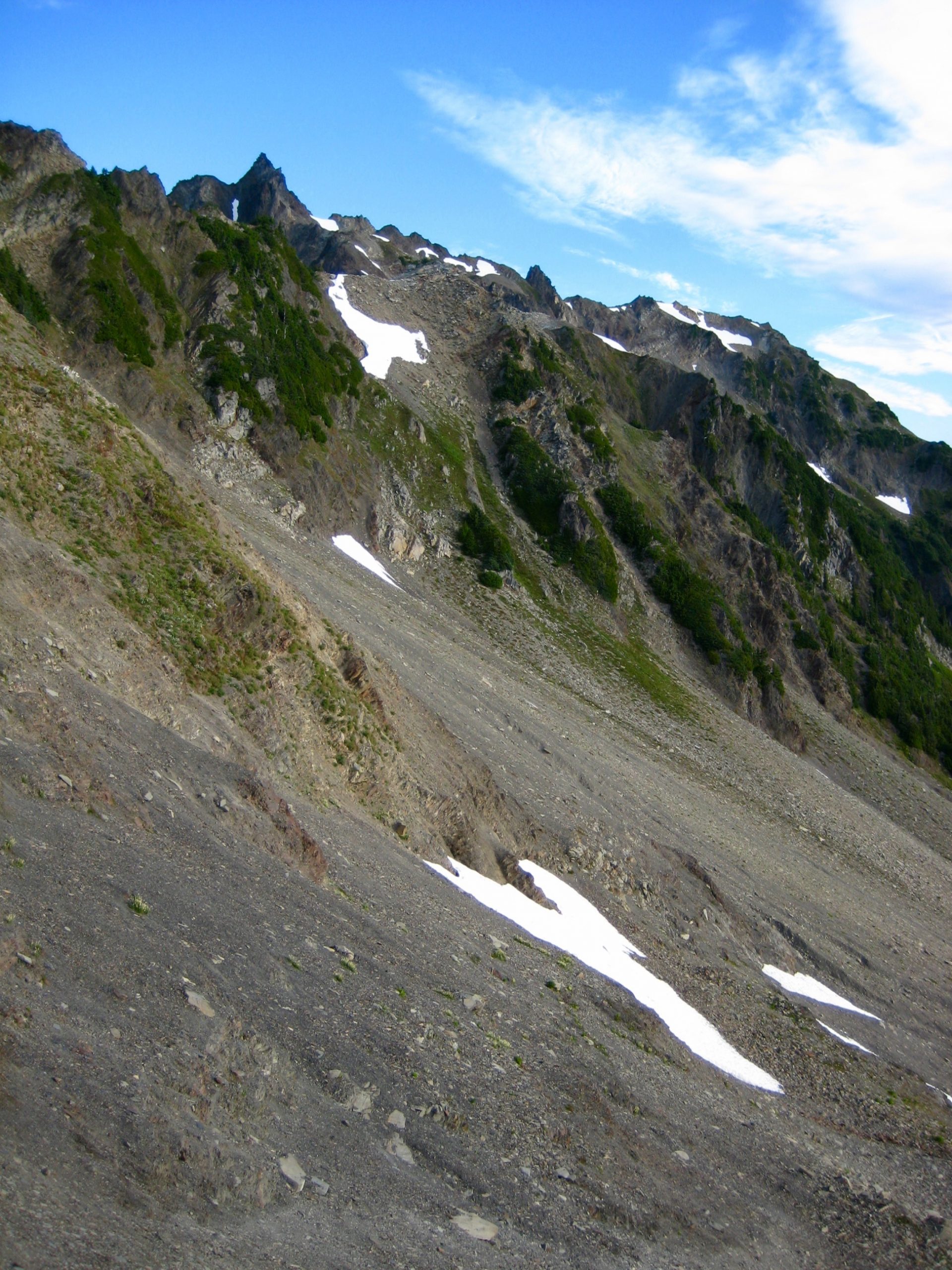 A 100-foot descent from the saddle allowed us to make an unpleasant sidehill traverse beneath Mt. Noyes on compacted dirt and gravel slopes.  We then ascended a loose rock couloir to gain a snow saddle between Mt. Noyes and Mt. Meany.