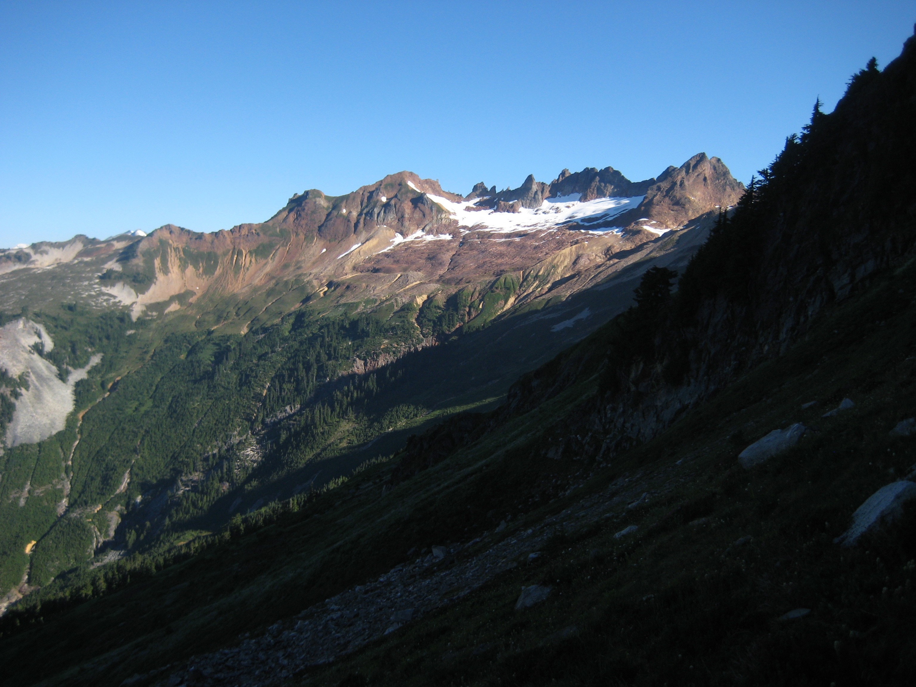 When morning finally arrived, we quickly packed up and headed back toward our saddle camp. About halfway along our traverse, we encountered Stefan Feller and Mike Collins, who were going in to climb Mt. Misch. They had camped in Horse Lake Saddle, next to our camp, and were planning to day-trip over to the peak. We took Stefan’s car key to help them out with a car shuttle from Green Mountain TH to Downey Creek TH.