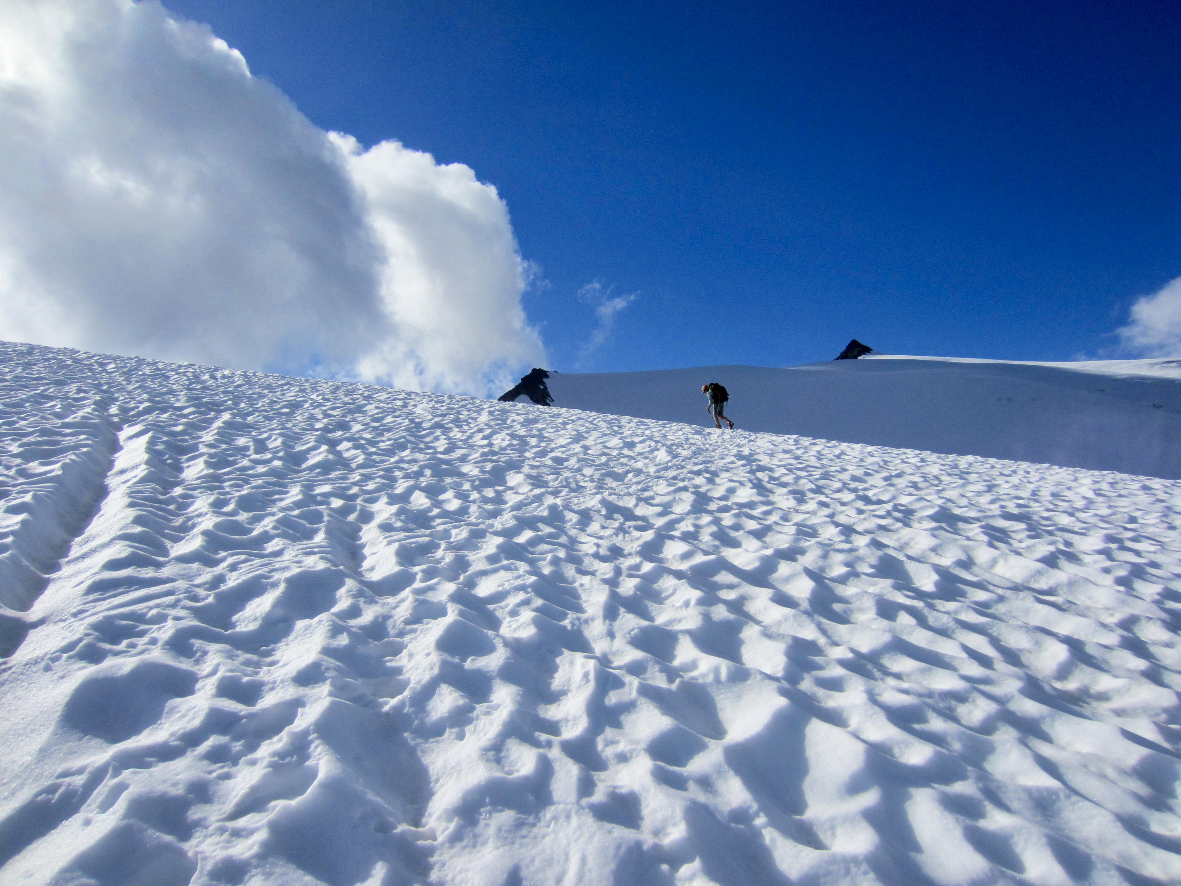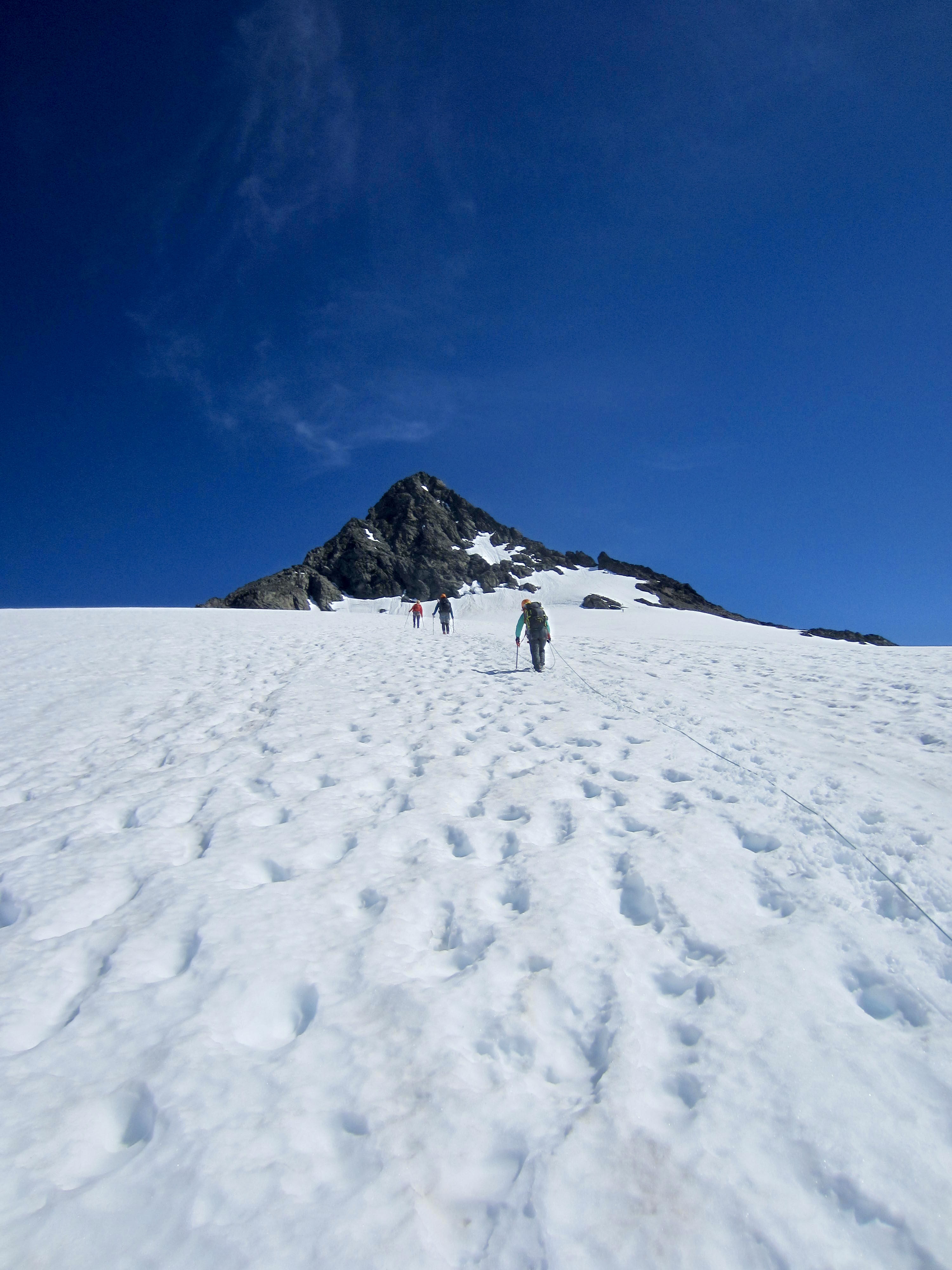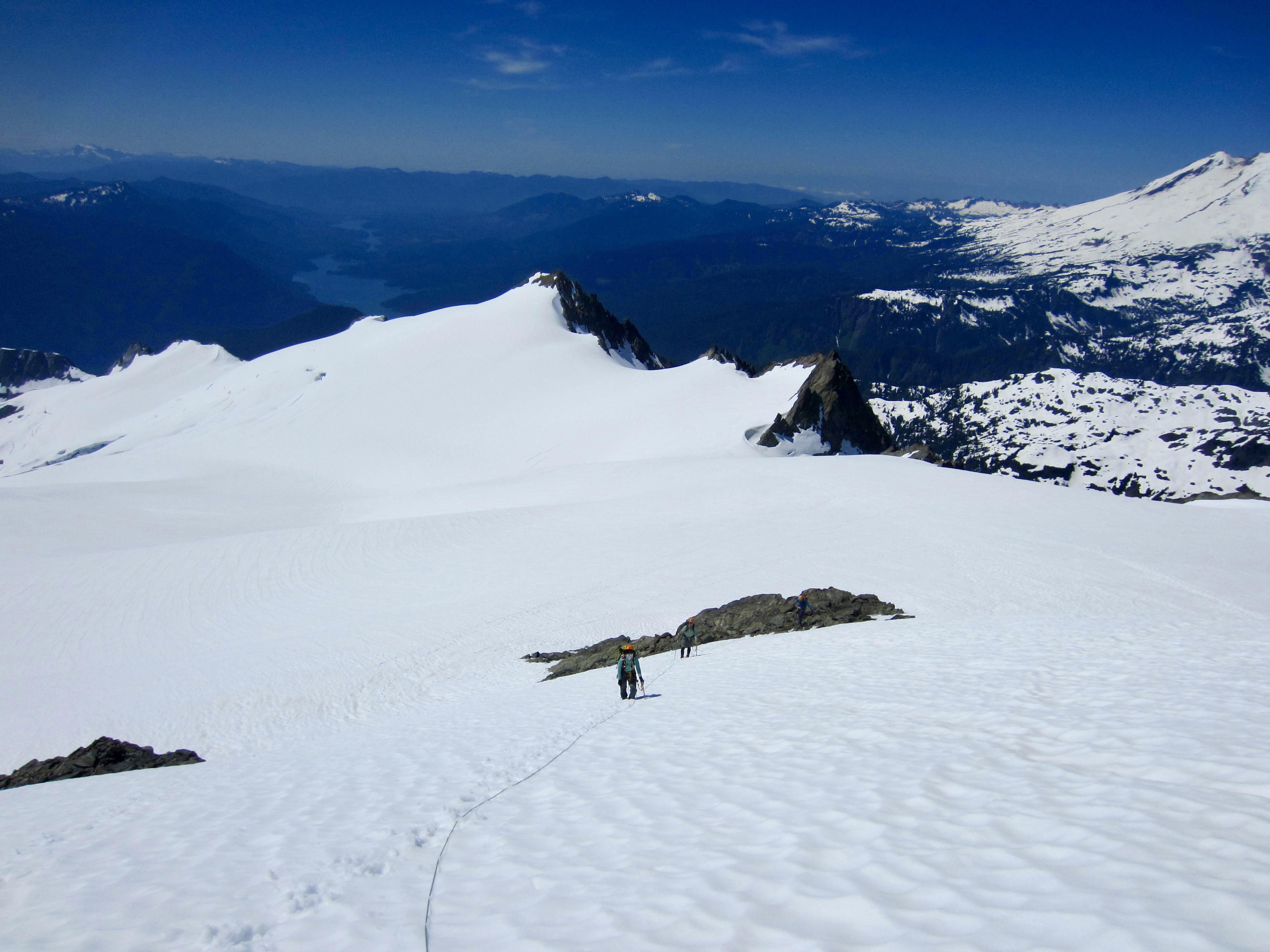 We donned crampons, roped up, and headed across the glacier at 8:00am. The other three parties camped nearby had left ahead of us at various times between 5:30am and 7:30am, but we felt no need to hurry; after all, we had all day. Our ascent route generally followed the other parties’ tracks along a wide arc around the western edge of the Sulphide Glacier and over to Hell’s Gate at the top of Hell’s Highway.