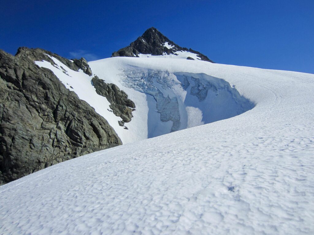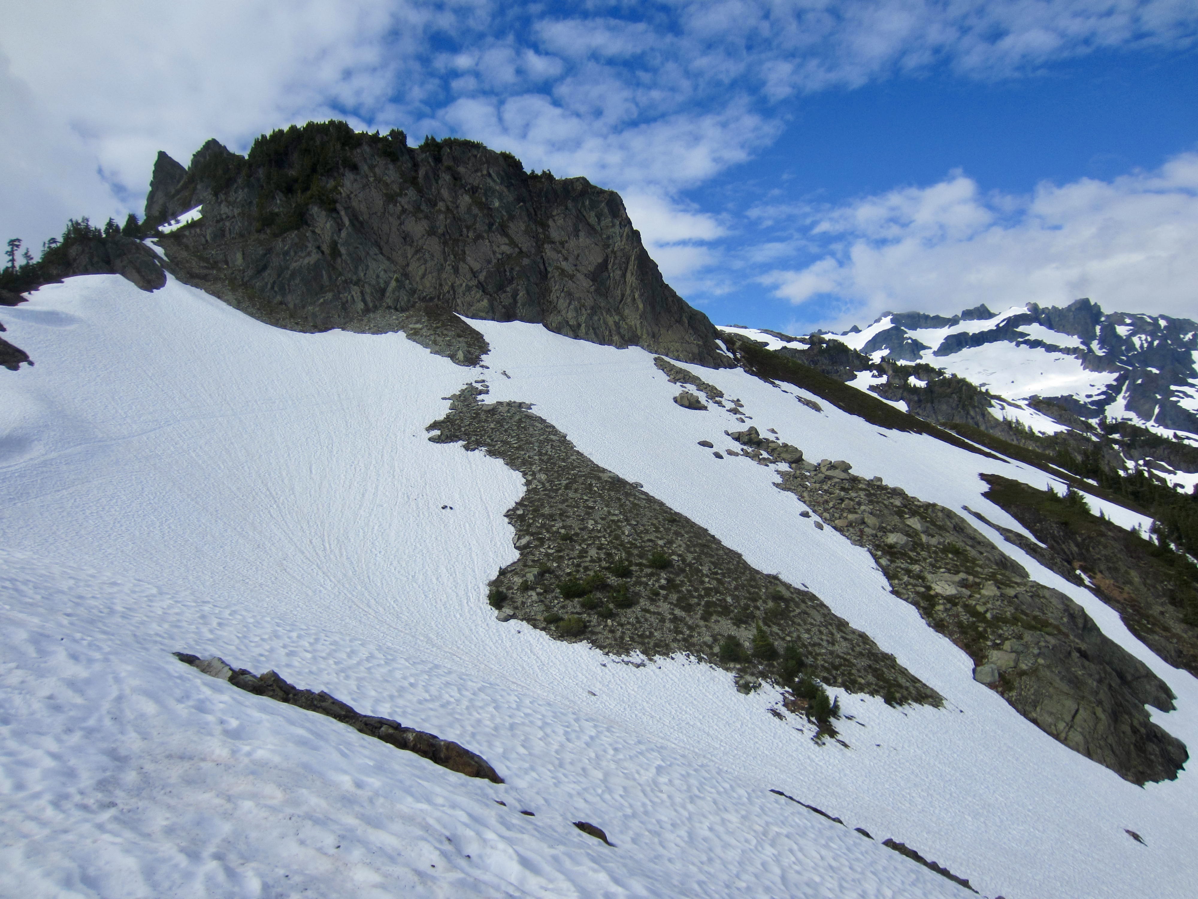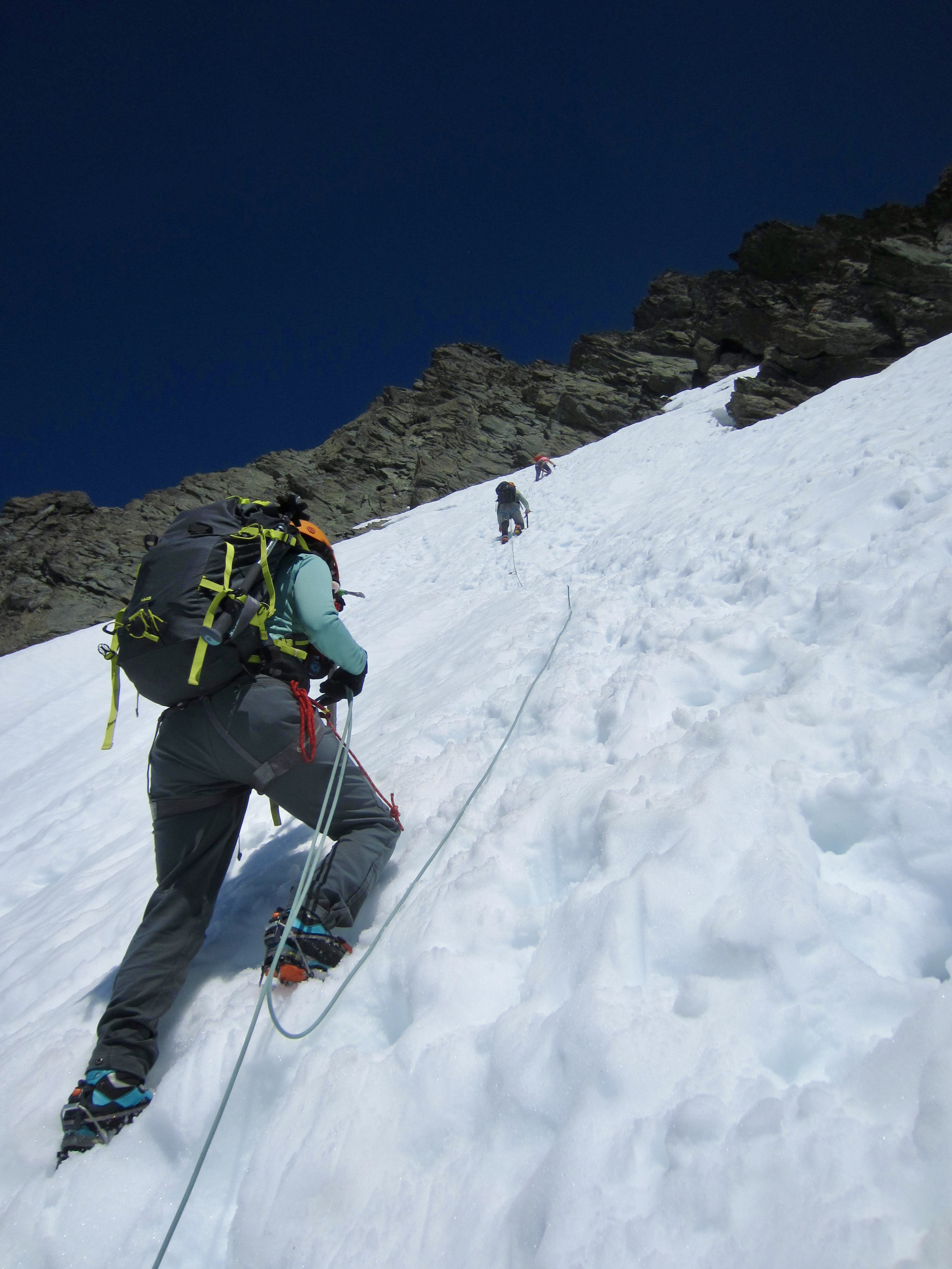 In order to reach the major southwest gully on the summit pyramid, we had to climb a steep snowpatch, and this in turn required scrambling across a small but tricky moat. Here, we met a three-person climbing party on their descent. They had successfully summited after a 5:30am departure and were heading out, now leaving us alone on the pyramid—a good thing from a rockfall hazard perspective. We continued up the steep snowpatch, angling toward the upper left corner and placing pickets for protection.