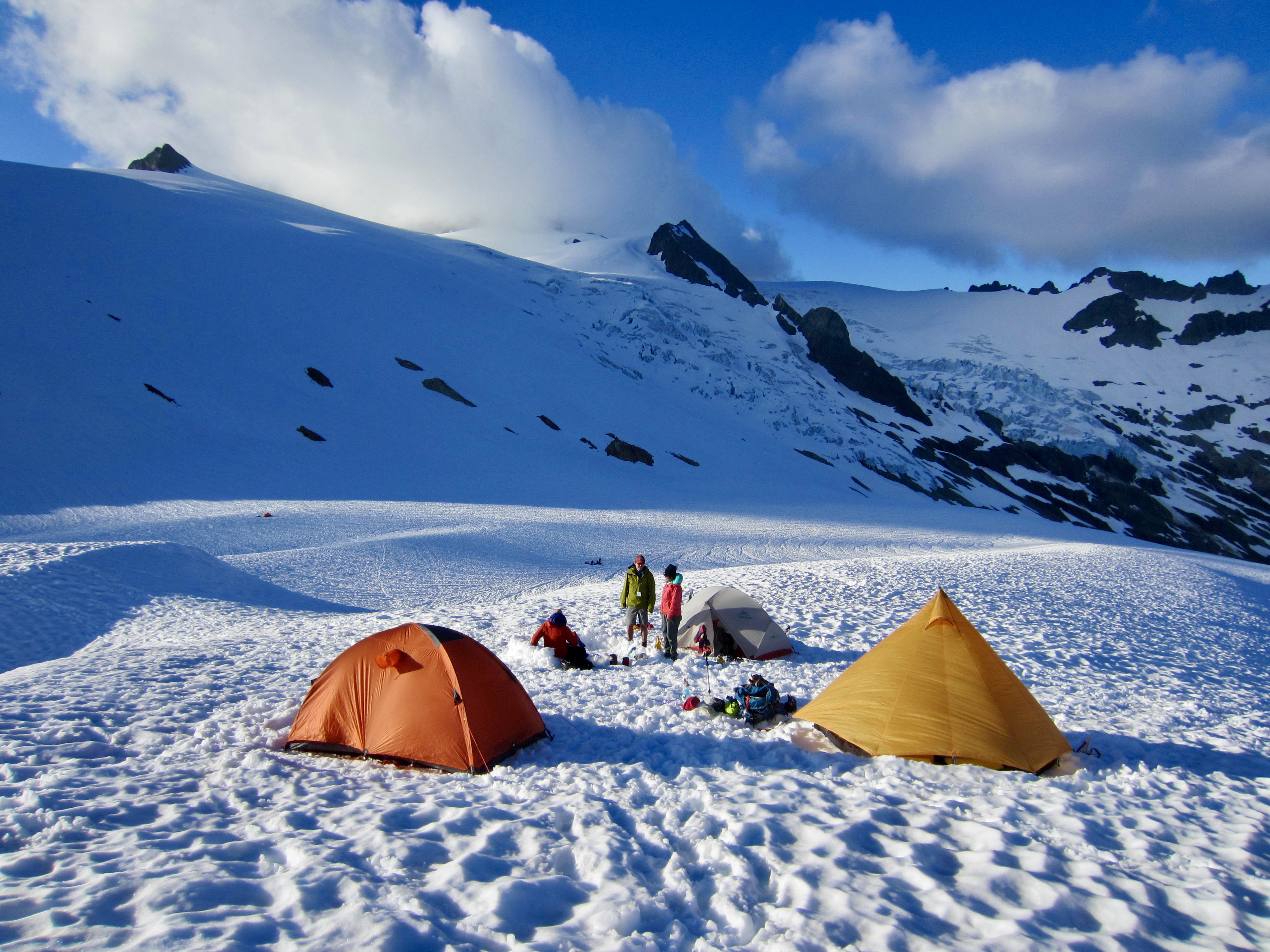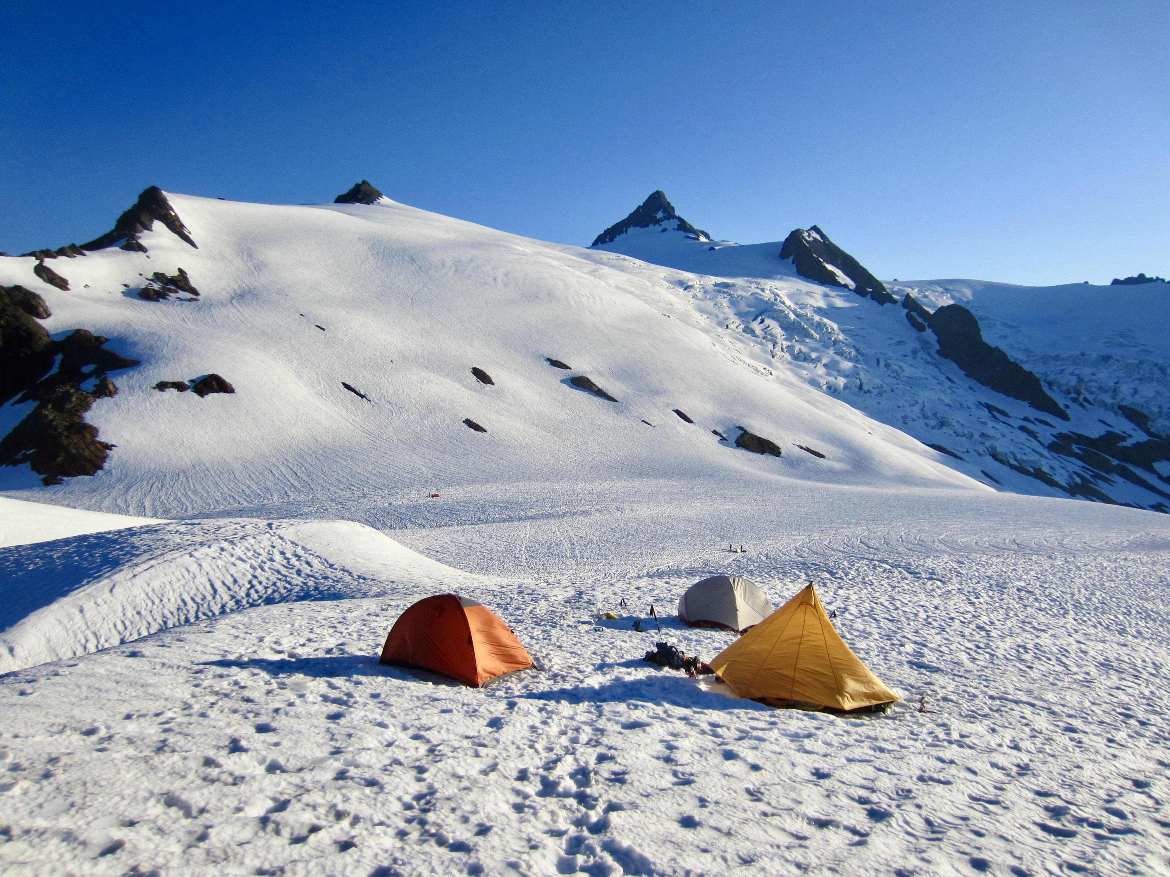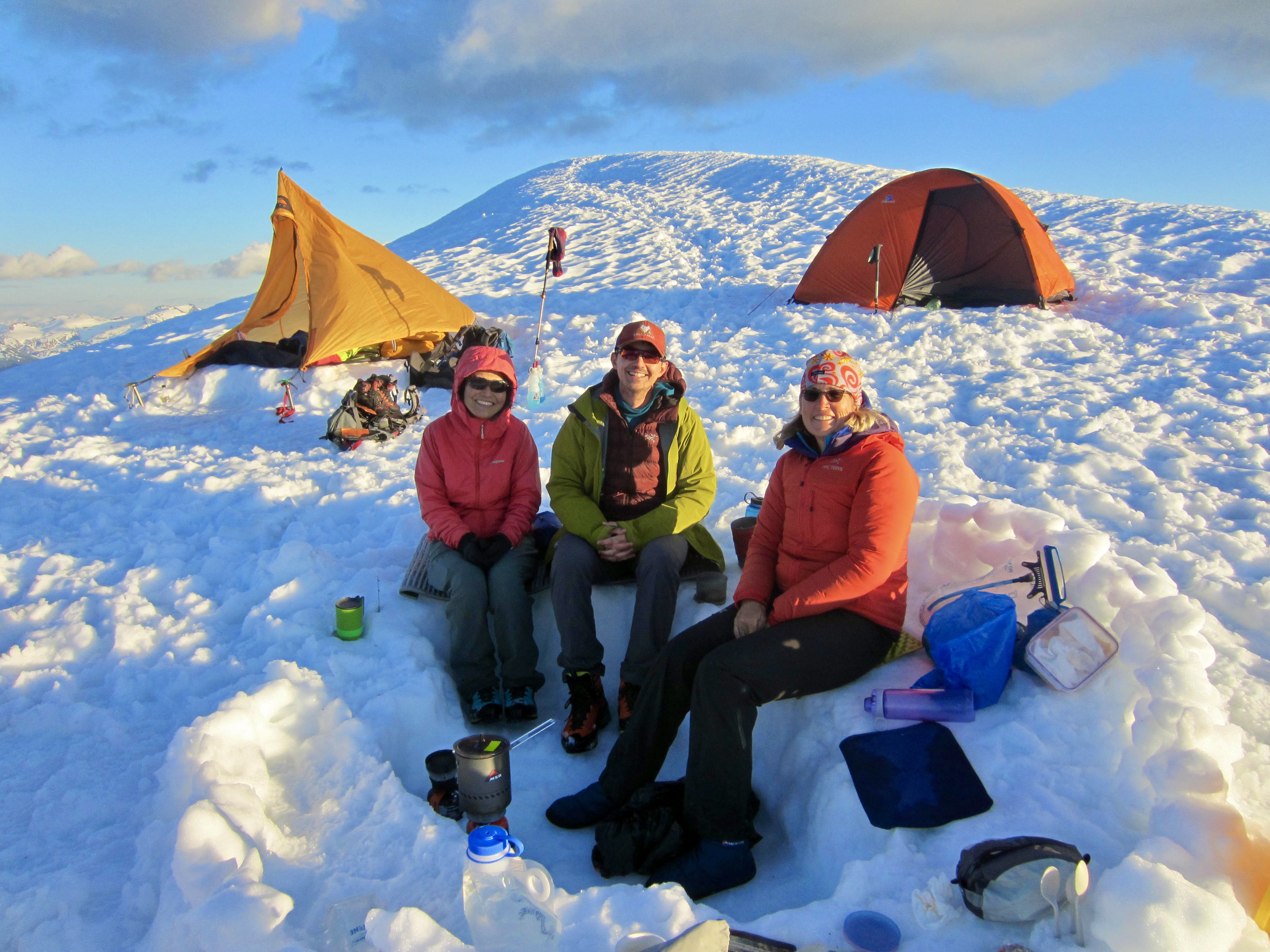 Once out of the gully, we made a belayed down-climb of the steep snowpatch, butt-sliding over the moat to reach the glacier. We then followed boot tracks back to our pack stash (4.8 hours from summit), collected our gear, and dropped a short distance to Sulphide Glacier Camp at 6200 feet. Here, we could enjoy bare ground and a composting toilet. It had been a long day, so these simple amenities seemed downright luxurious!