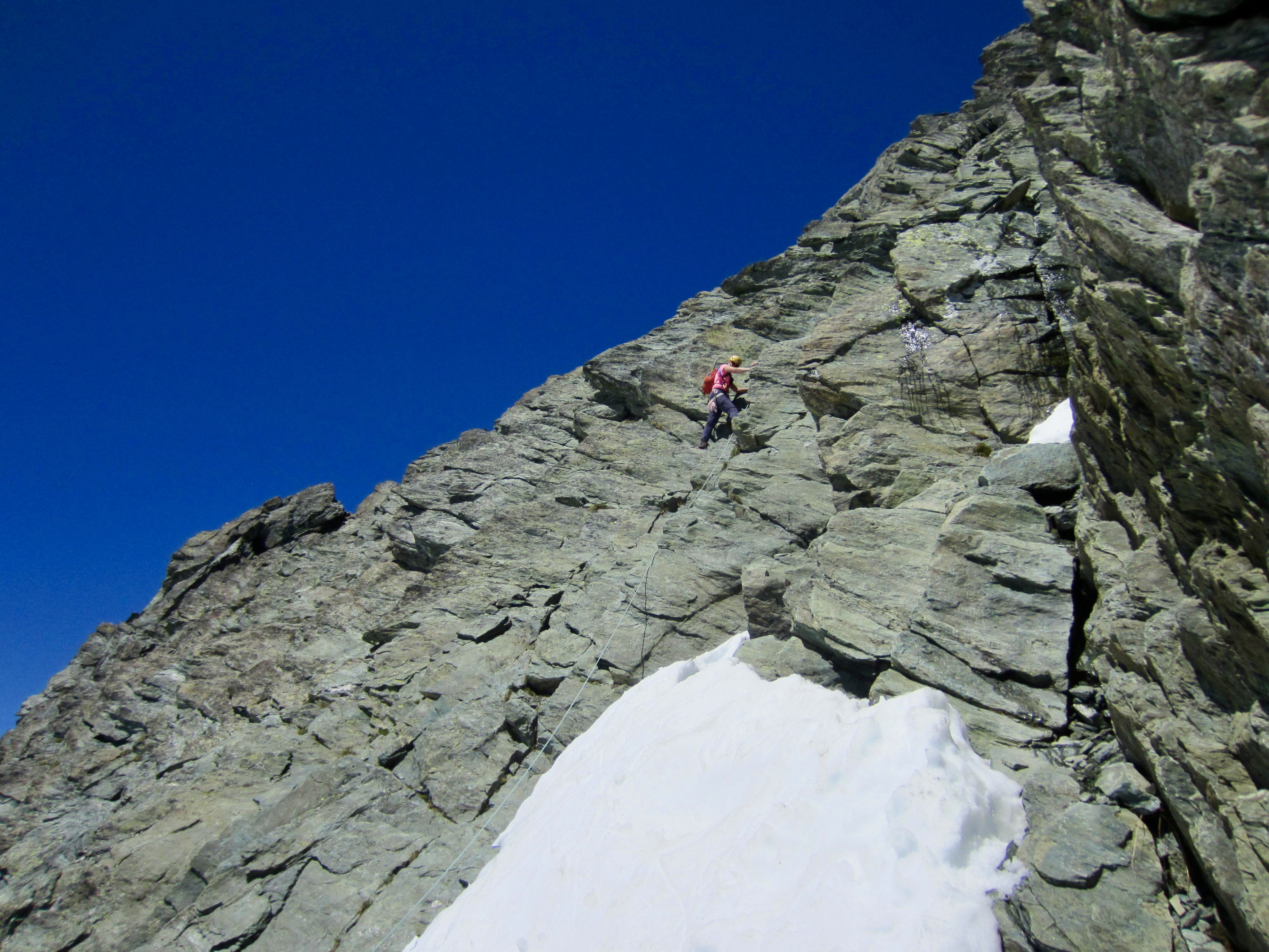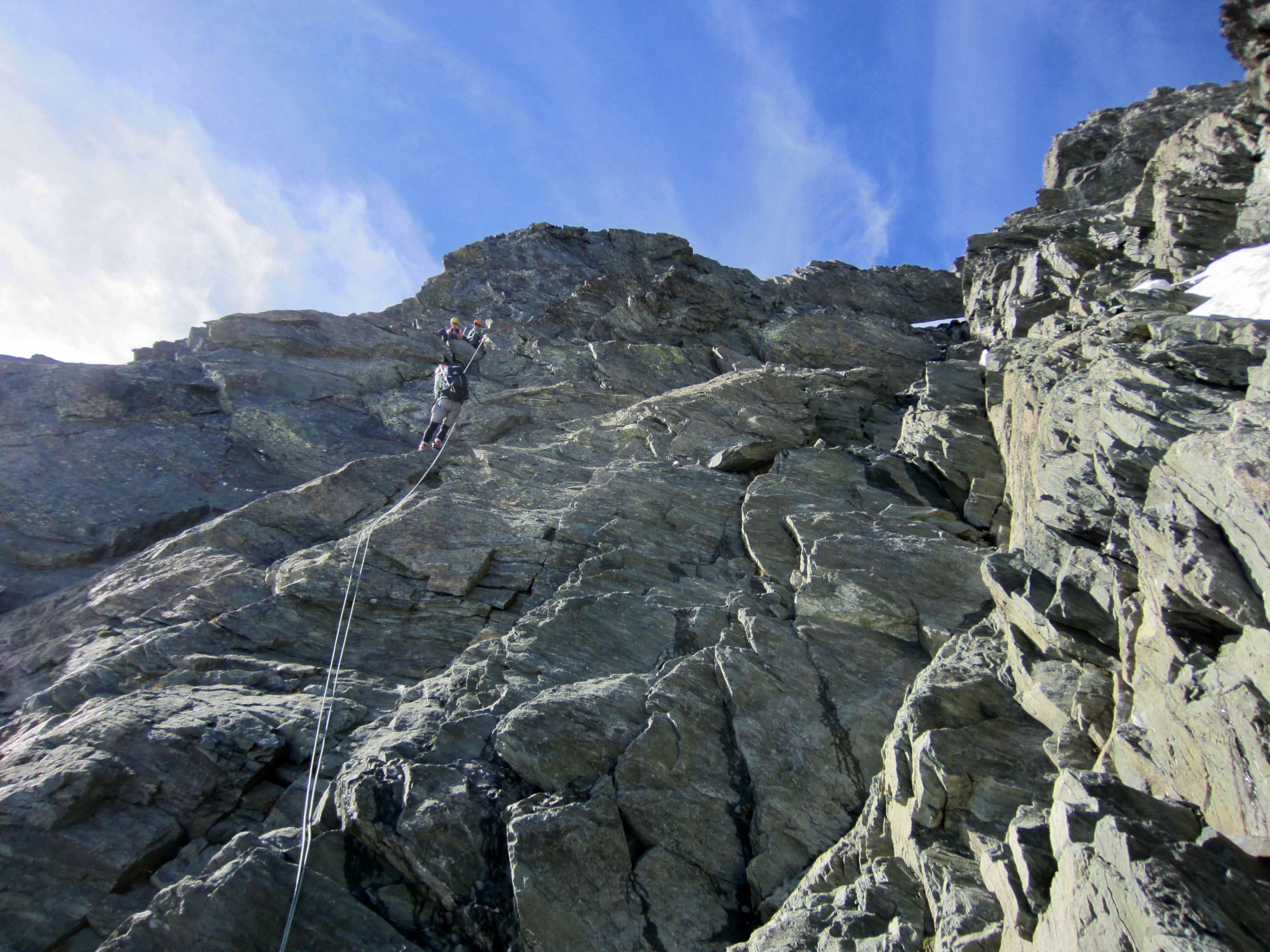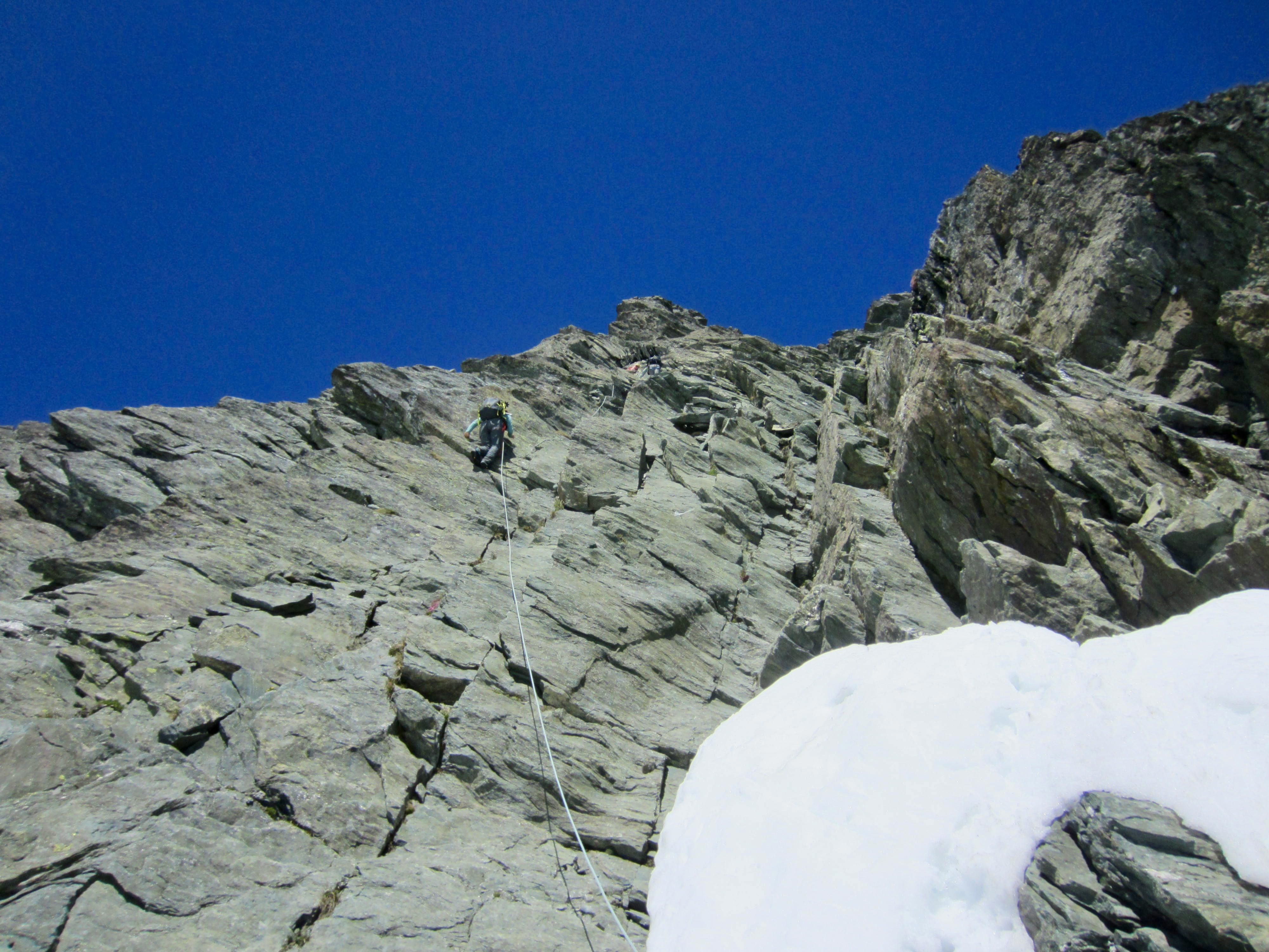 In the lower half of the gully, the gray schist forms down-sloping slabs with limited opportunities for rock protection. In the upper half, the schist is blockier and more featured—thus, more fun and better protected. Overall, I would rate the climbing as solid Class 3-4. Most skilled scramblers would likely be comfortable without using a rope, whereas many people would appreciate being roped for at least the more-exposed parts.