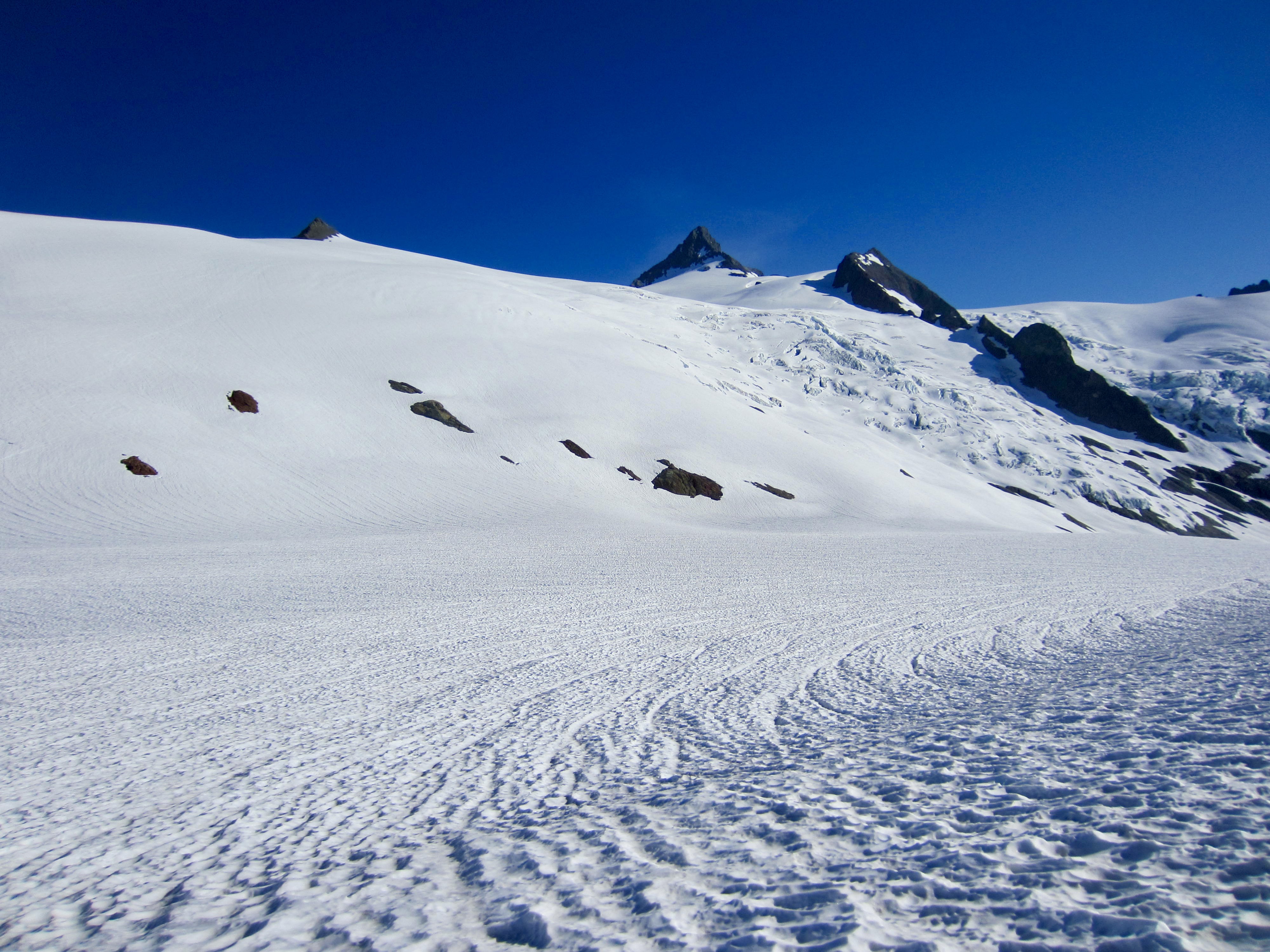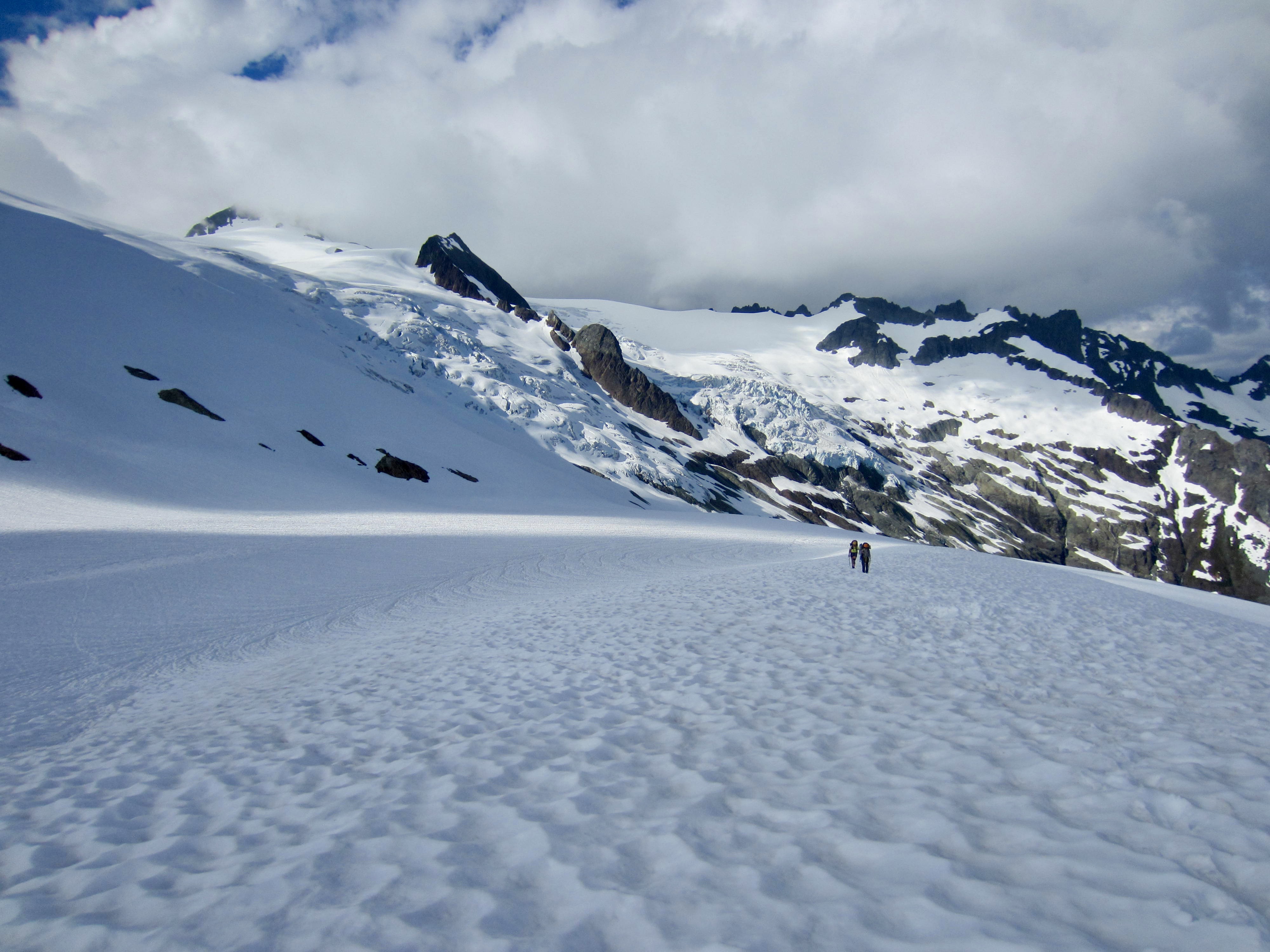 From Sulphide Pass, we made a rising traverse around a snow basin and across the lower fringe of the Sulphide Glacier. A steeper ascent took us up to the expansive glacial flats at 6400 feet. This remarkable “ice plain” could host a dozen Boy Scout Jamborees at once!