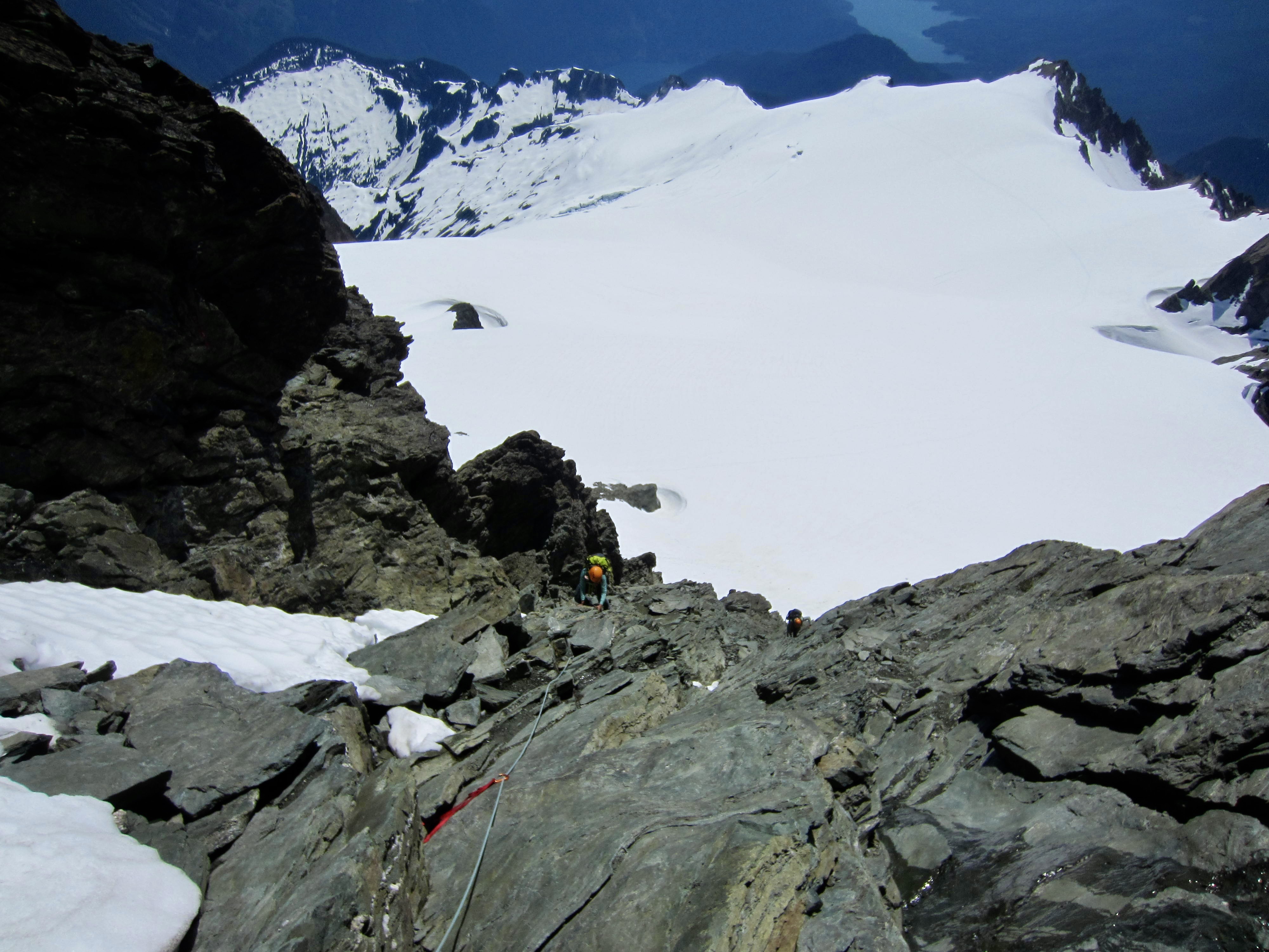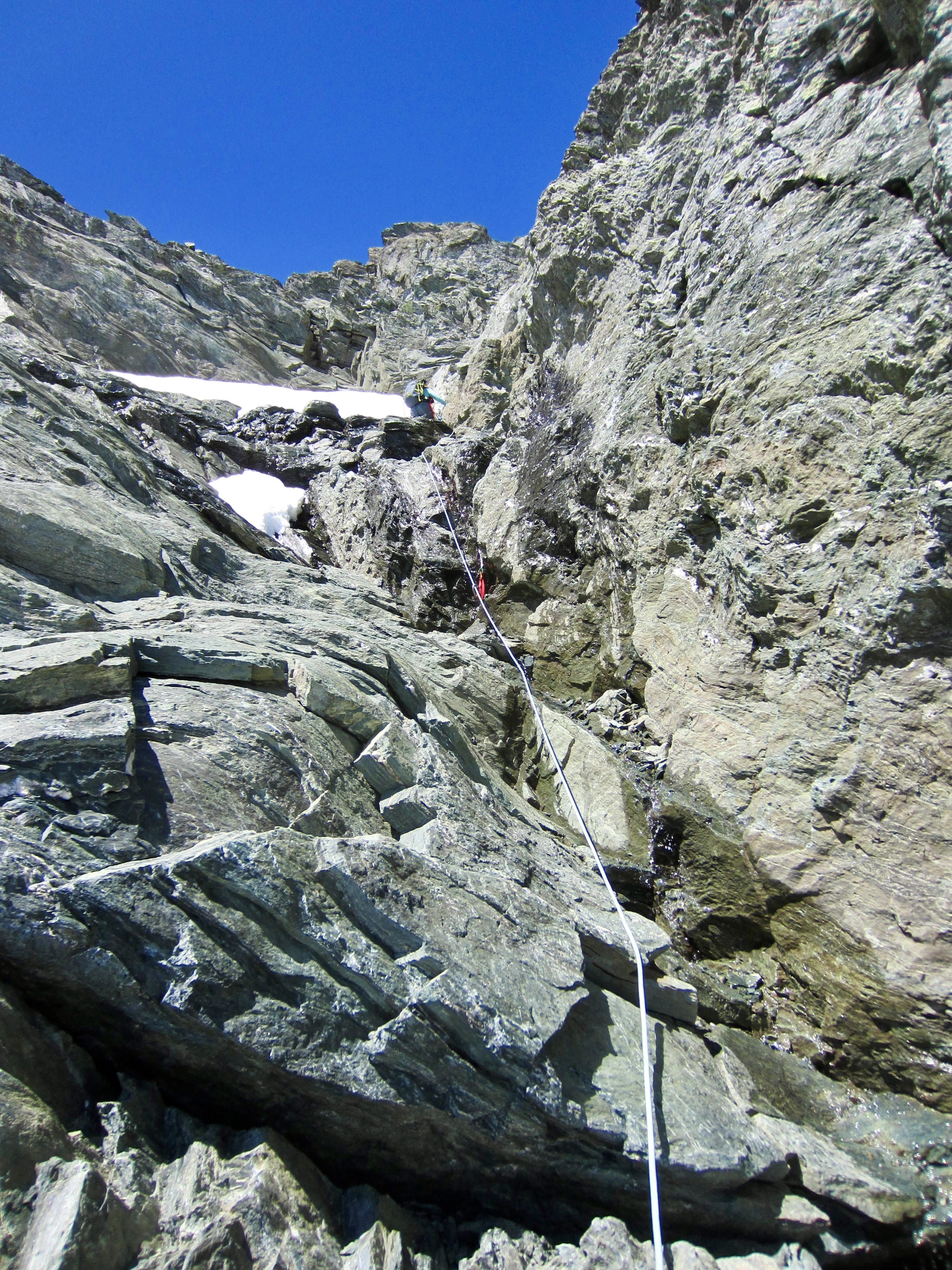 After ditching our crampons and pickets on the last bit of snow, we stepped around to the bottom of the southwest gully and headed up. It was mostly bare rock, but there were small lingering snowpatches and some flowing water within the invert. Eileen and I traded leads over four pitches of belayed simul-climbing on our 60-meter alpine rope.