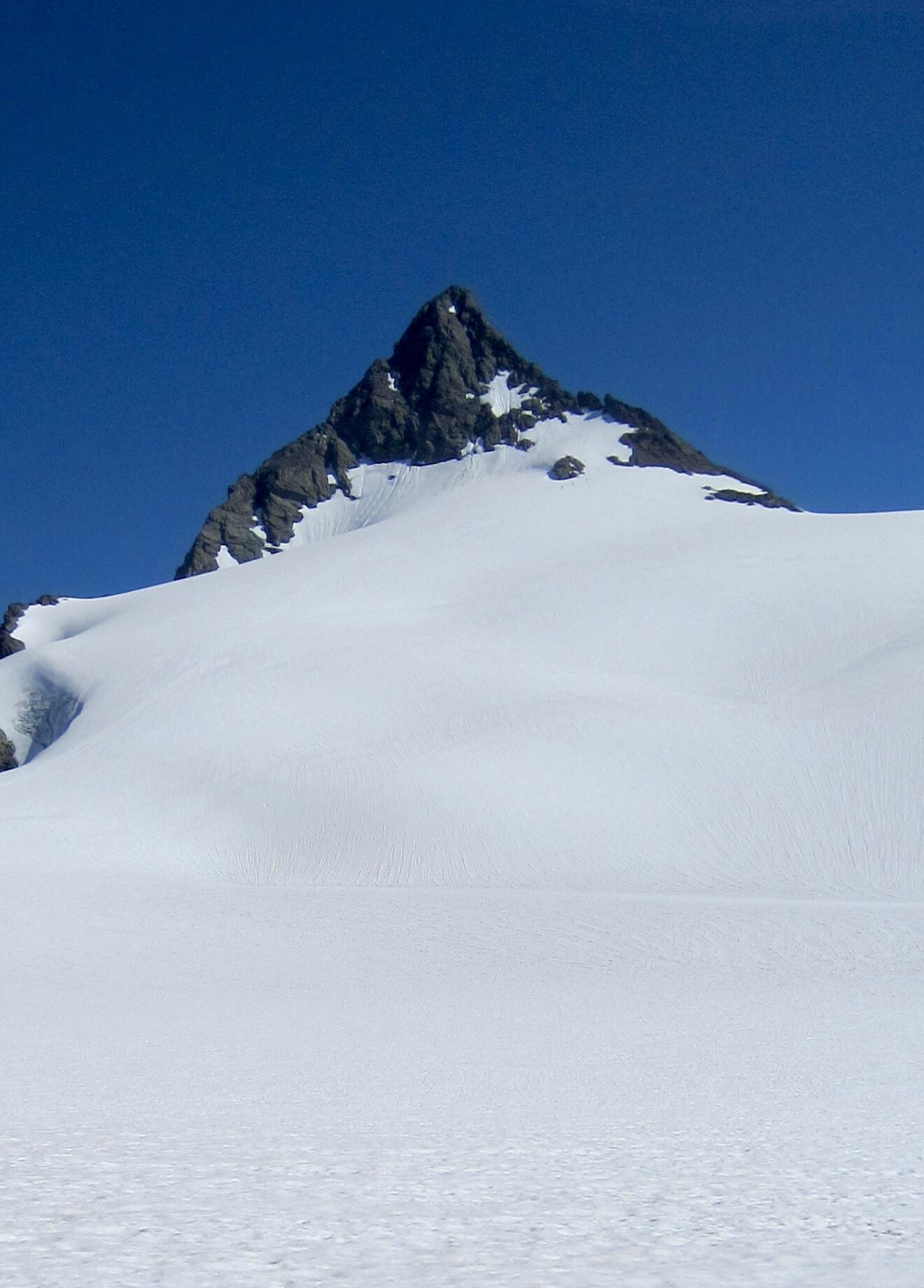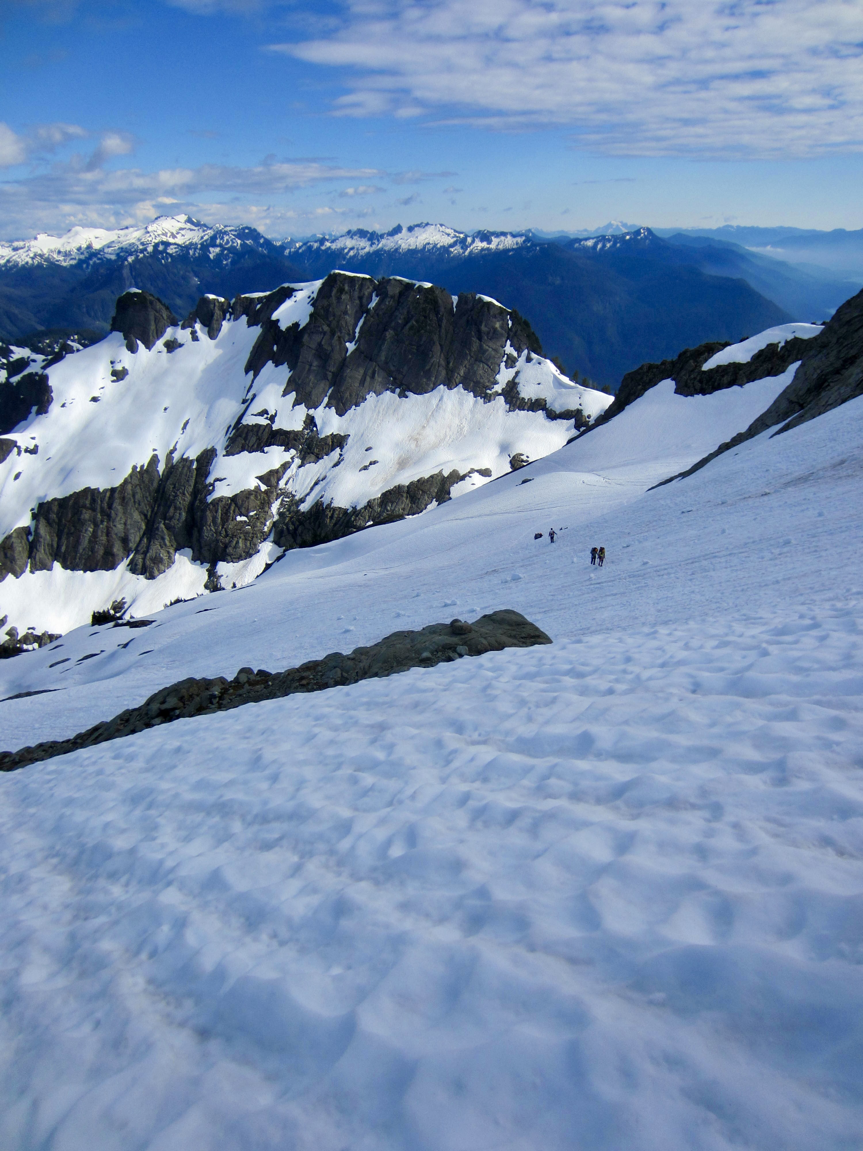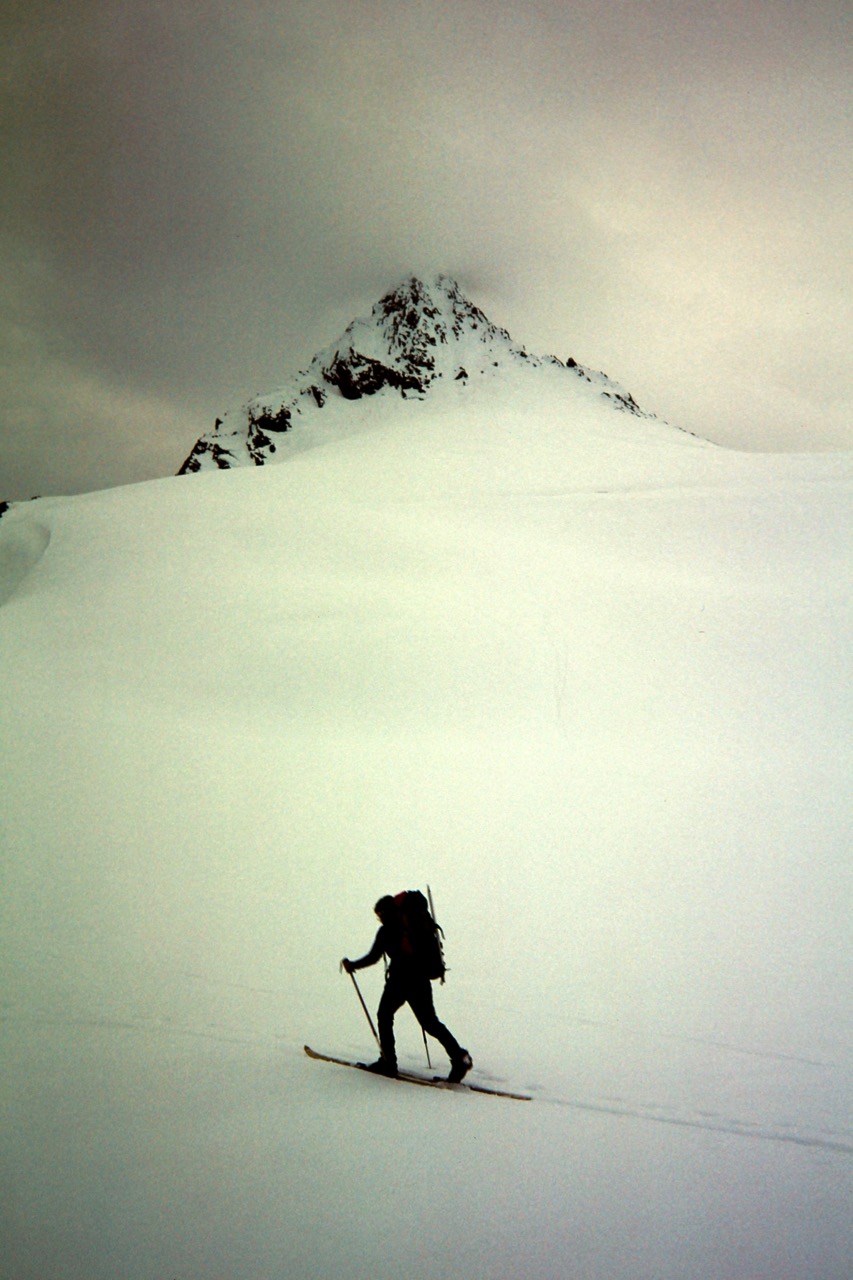 As we cramponed toward the intimidating summit pyramid, a climbing party of two descended past us. They reported having turned around at the base due to lack of time in relation to the task required. Farther upslope, we encountered three ski-mountaineers at a rock outcrop. They too were turning around upon seeing the steep summit pyramid up close. Both of these parties demonstrate that retreat is not an uncommon reaction at this location!