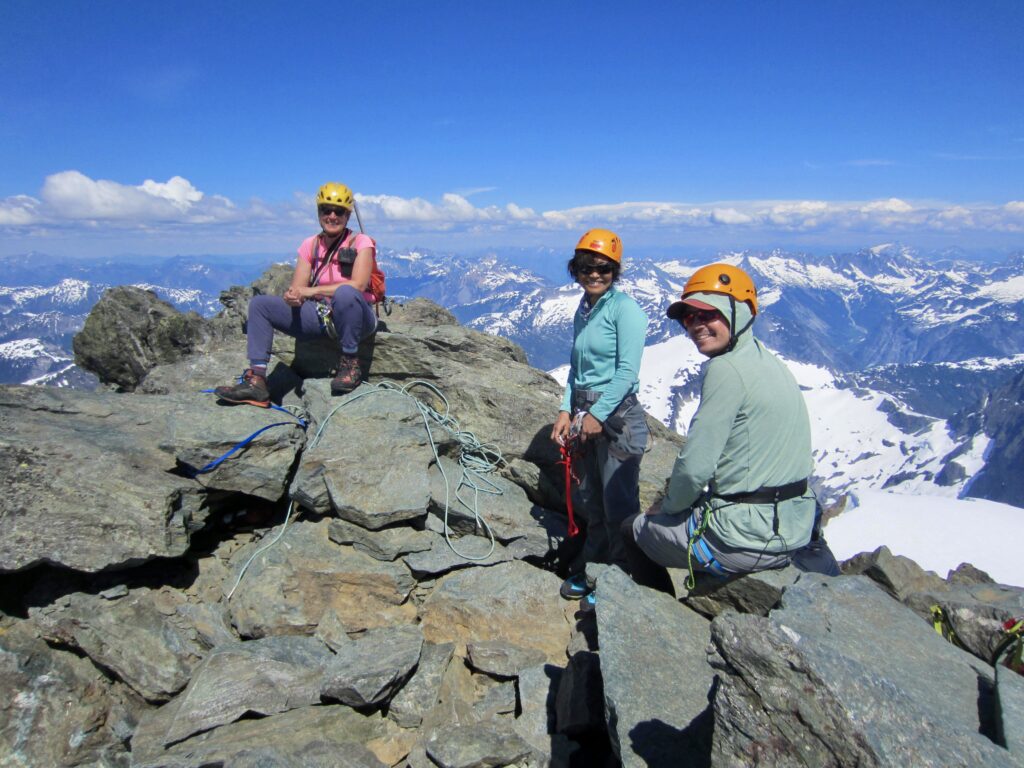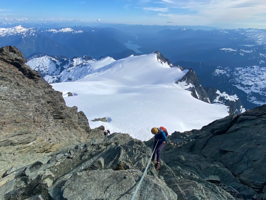A short Class 2 scramble above the fourth pitch delivered us onto the summit in mid-afternoon (7.0 hours + 2600 feet from camp). Yoko, Andrew, and Eileen were all ecstatic to stand on this monumental peak located in the northwestern “bulge” (a strategic bump-out used to nab Shuksan) of North Cascades National Park. We soaked in the views for a half-hour.