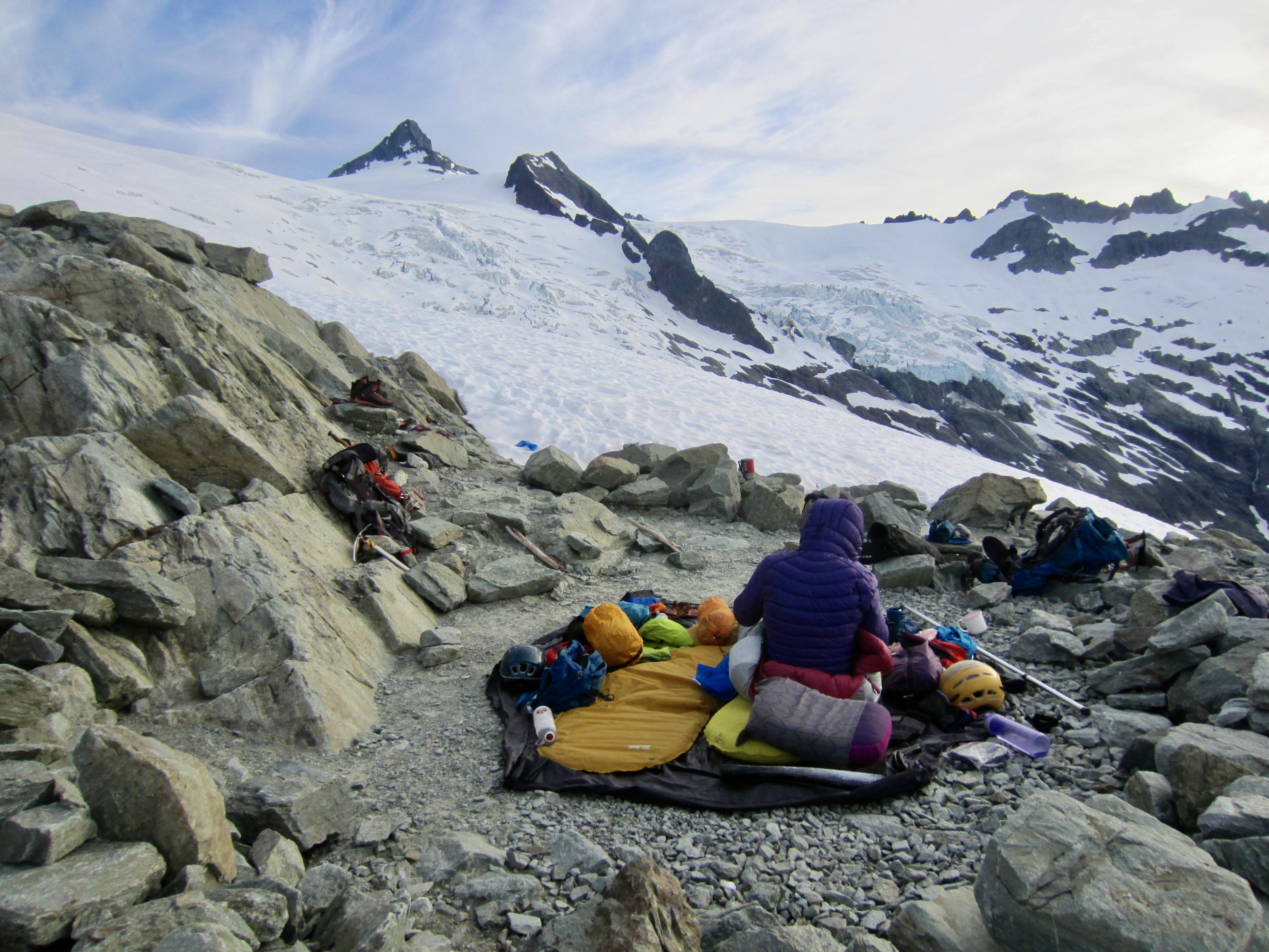 After a night of strong winds that created lots of tent flapping and prevented any quality sleep, we were rewarded with a stellar, cloudless morning. Our slightly revised plan for beginning the day was to pack up, haul gear down to the glacial flats, and leave a stash there. This would allow us to move our camp to a less windy location after our climb.