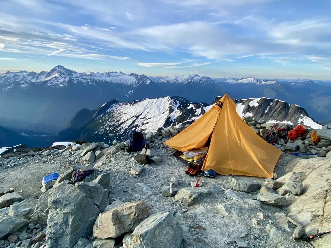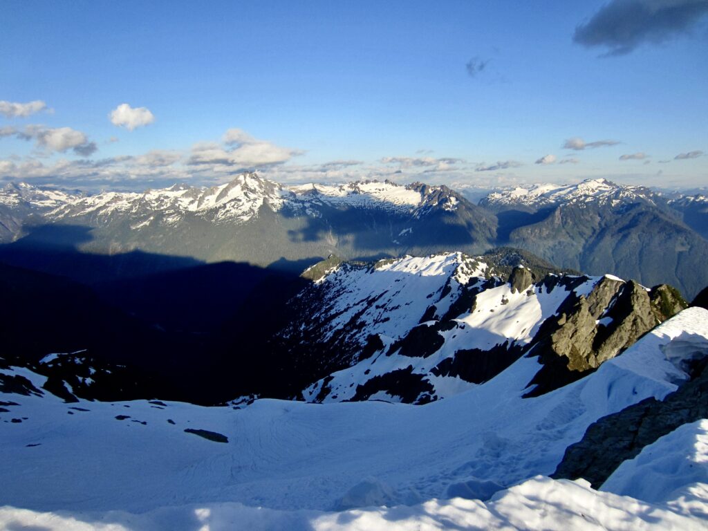 Our campsite provided a sweeping view of the Sulphide Glacier, Picket Range, and Lower Skagit Mountains, with Mt. Baker basking in the evening sun behind us. We particularly appreciated our ringside seat for the entire span of the Bacon-Hagan-Blum Traverse route. Unfortunately, this marvelous scenery was accompanied by a stiff, cold wind.