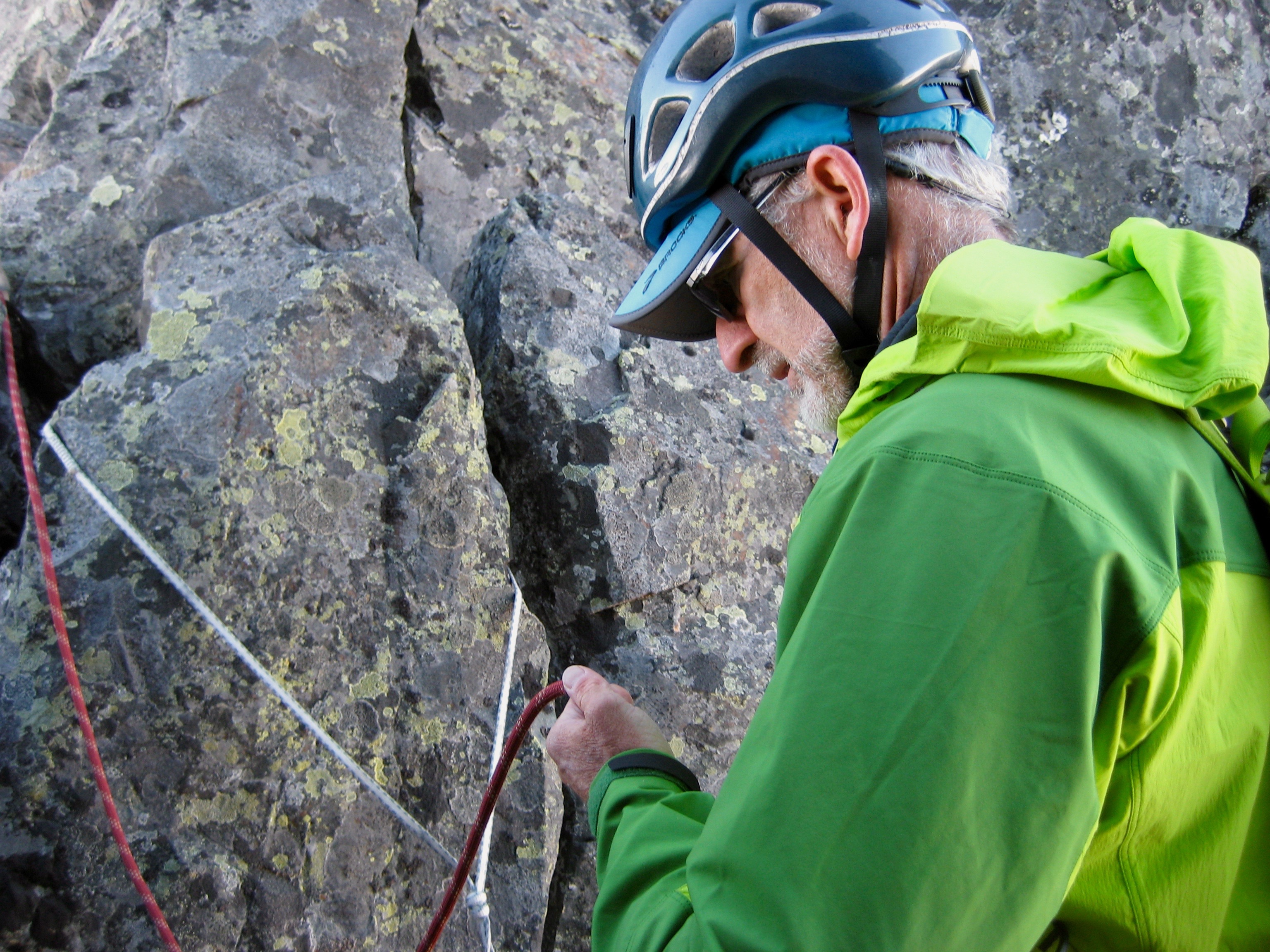 Pitch 6 followed a series of ledges and cracks along the peak’s upper ridge.  We were back on exposed terrain, but the rock quality was excellent.