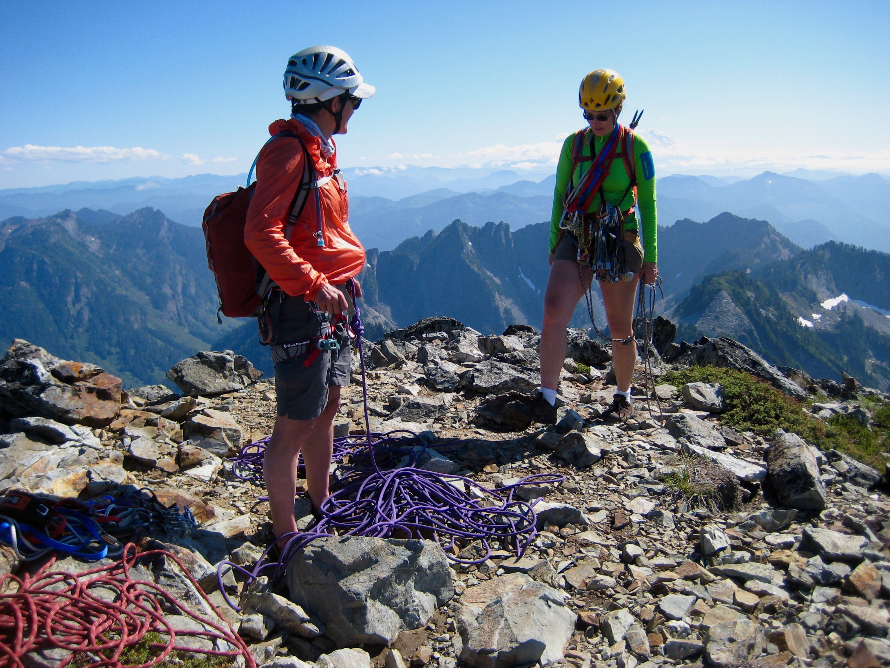 rock climbers celebrating on the flat summit of Mt Thomson in the Snoqualmie Mountains