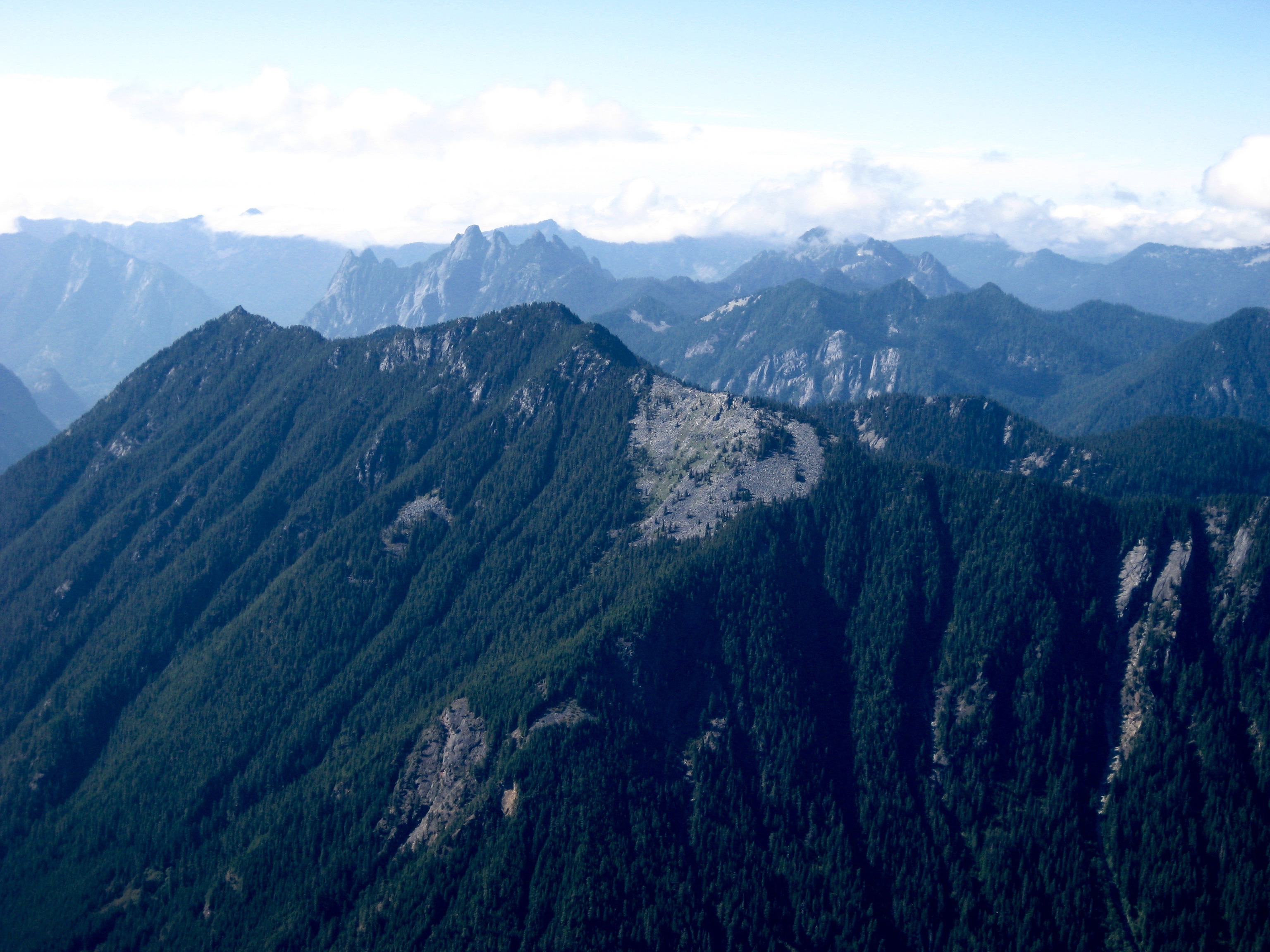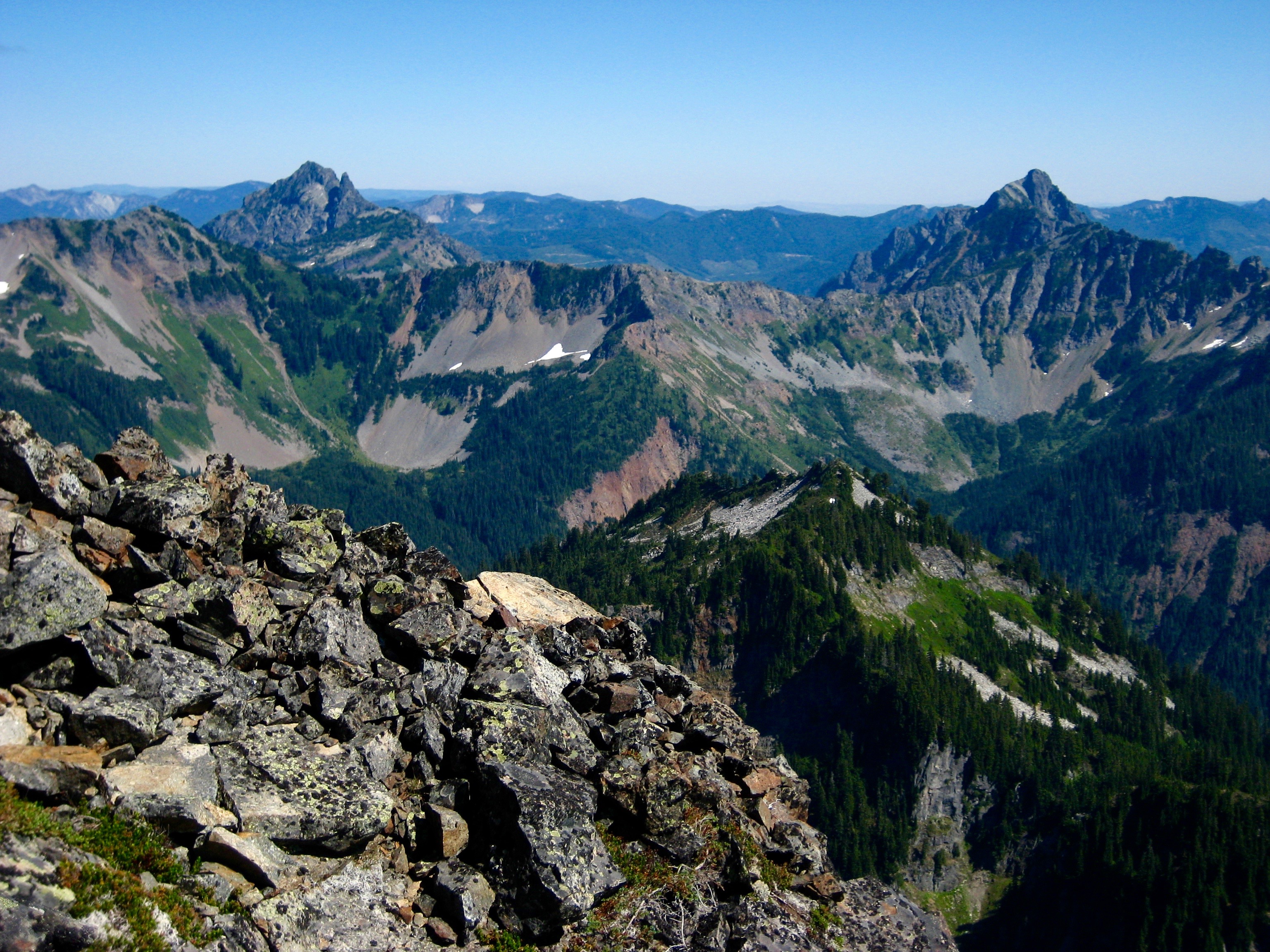 Overcoat Peak, Chimney Rock, and Lemah Mountain as seen from the summit of Mt Thomson in the Snoqualmie Mountains