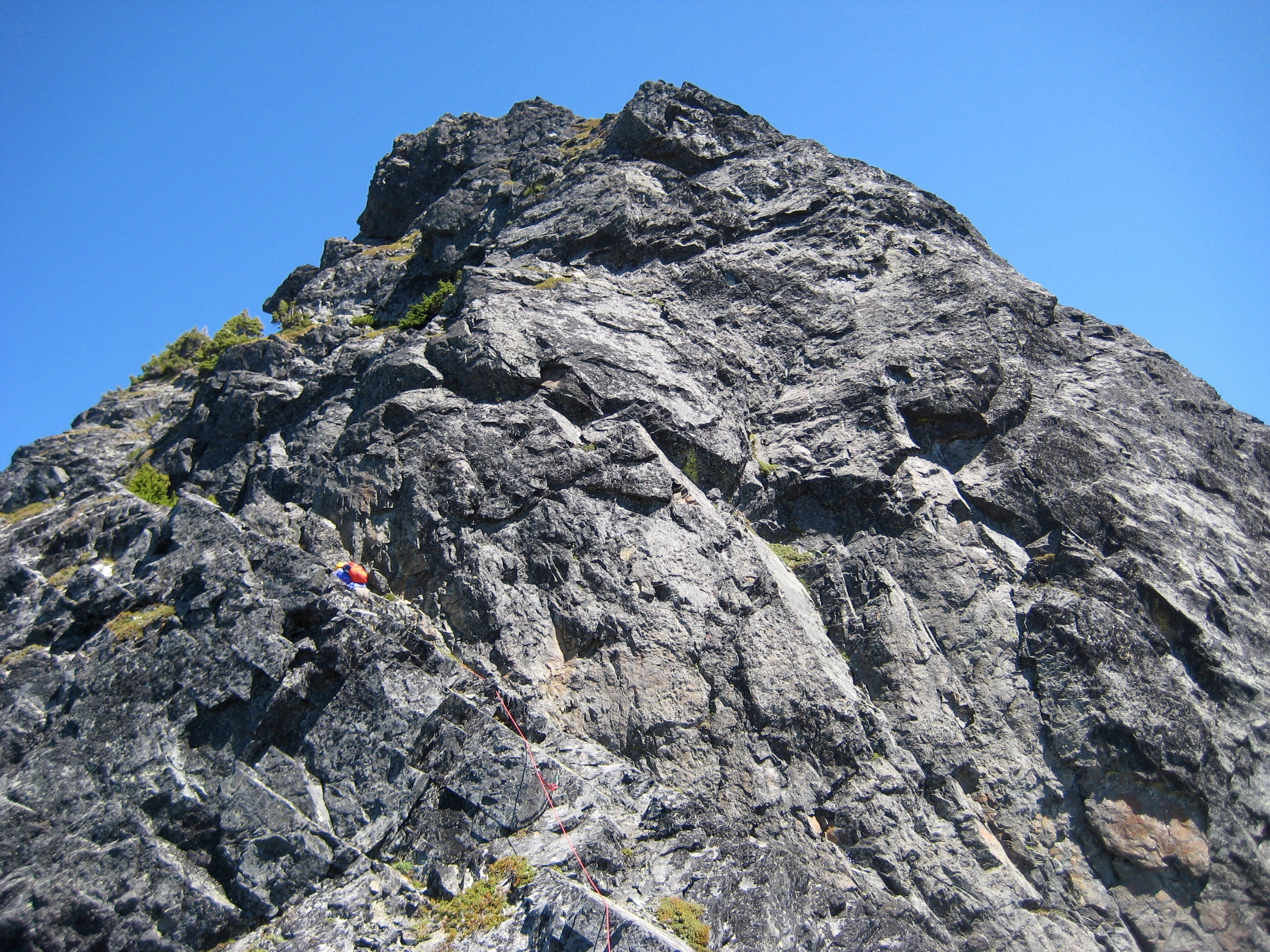 The crux was a Class 5.6 bulge at the start of Pitch 3, and Pitch 4 was a Class 5.4 face.  Each of the first four pitches had considerable exposure.