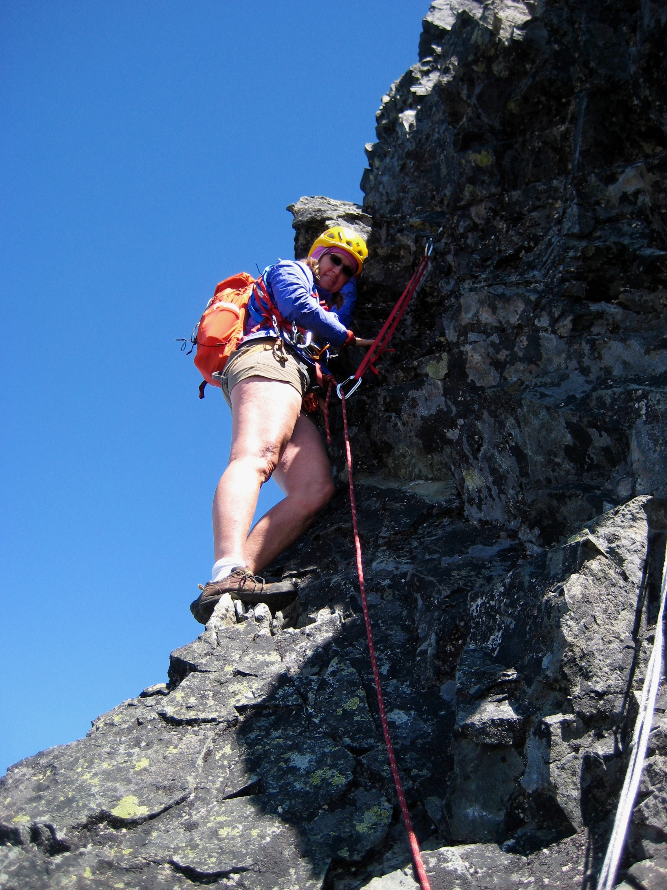 This climb of Thomson’s very popular West Ridge route was selected by Lisa and Eileen, and they took turns doing all of the rock leads.  My job was to stay tied in between our two ropes, belay the leader and follower, and keep complaints to a minimum.  On a rope team, this person is commonly called the “belay wench.”  I was a pretty good one.
