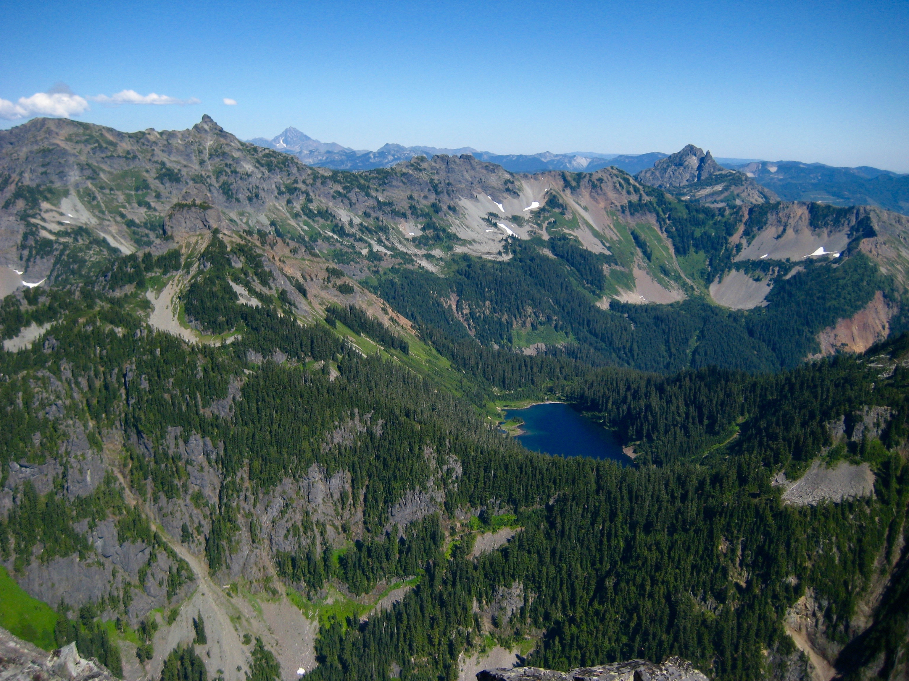 Three Queens, Hibox Peak, and Joe Lake as seen from the summit of Mt Thomson in the Snoqualmie Mountains