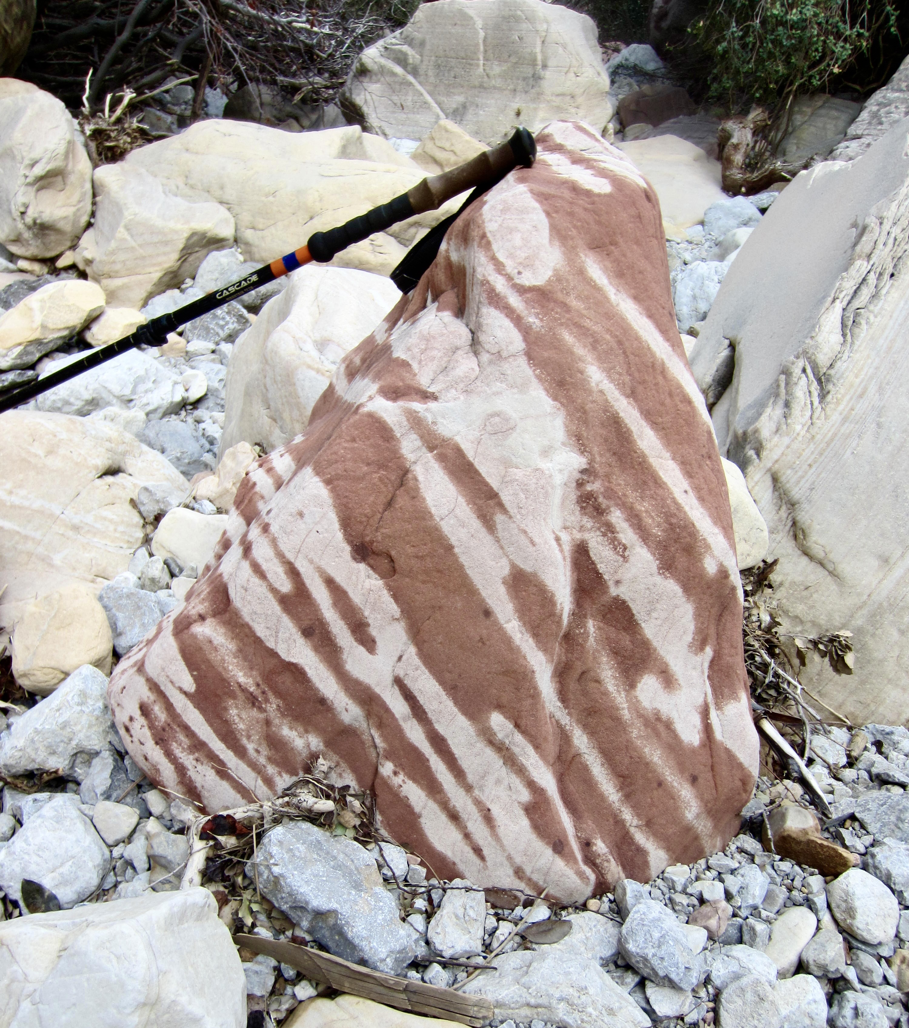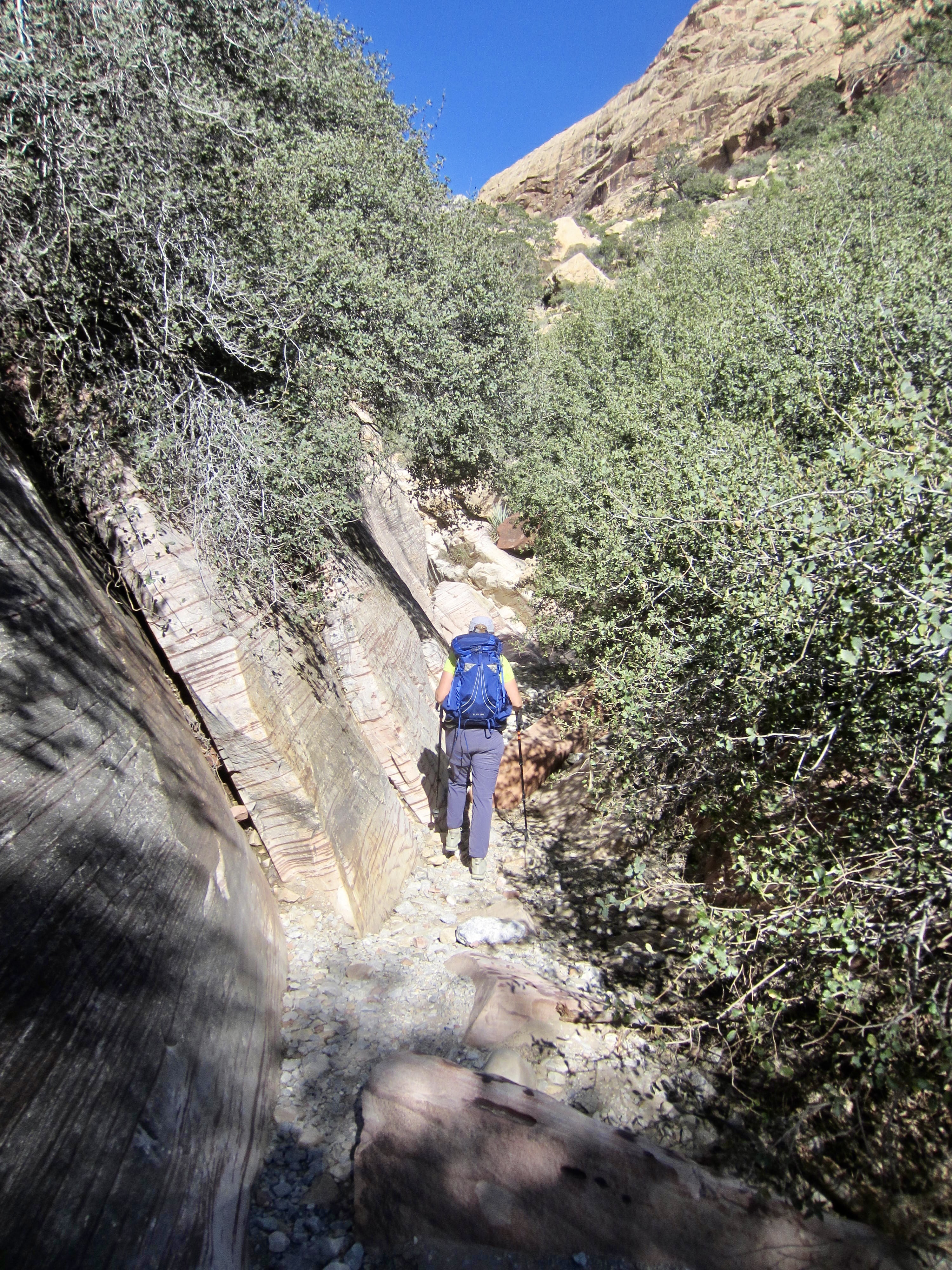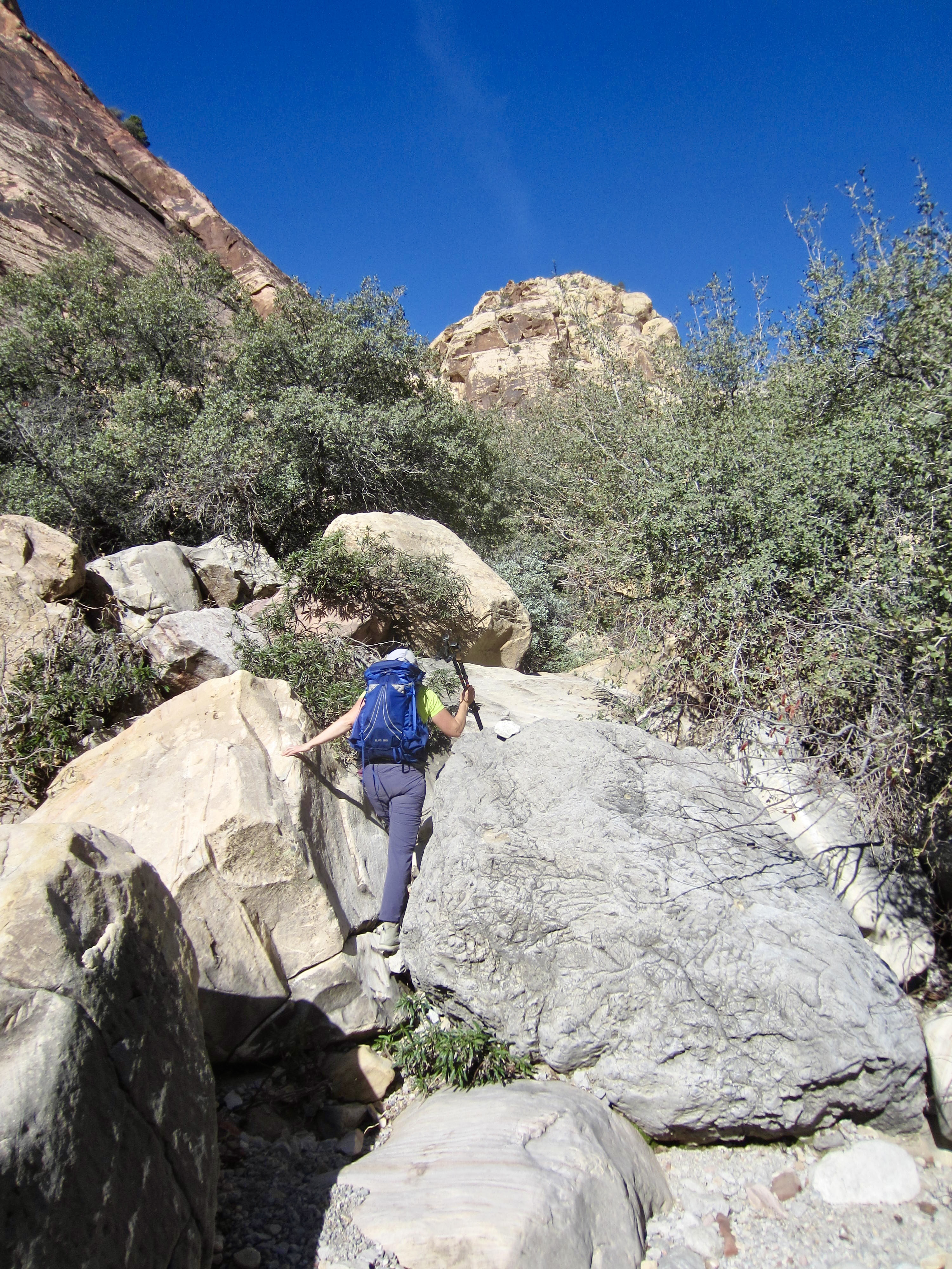 For the next mile, we followed the primitive trail on a tortuous course through the canyon, using footprints, stone ducks, small cairns, and cut limbs as navigation aids. The marked route weaves back and forth, sometimes traveling above the invert and sometimes going straight up the stream bed. Forward progress requires constant vigilance and continual scrambling over large boulders. The scrambling never exceeds Class 3 difficulty, but it does require many strenuous or awkward moves.