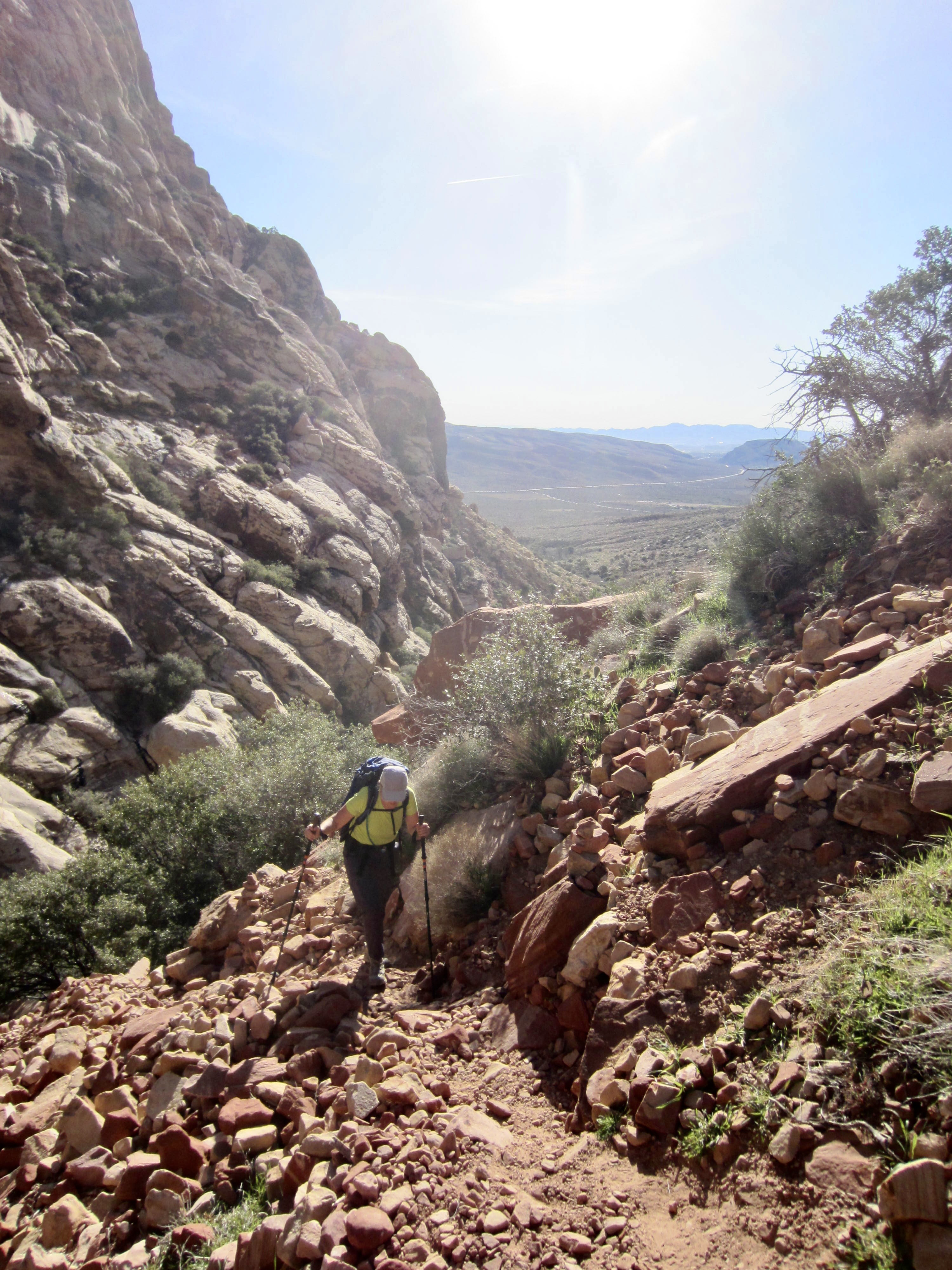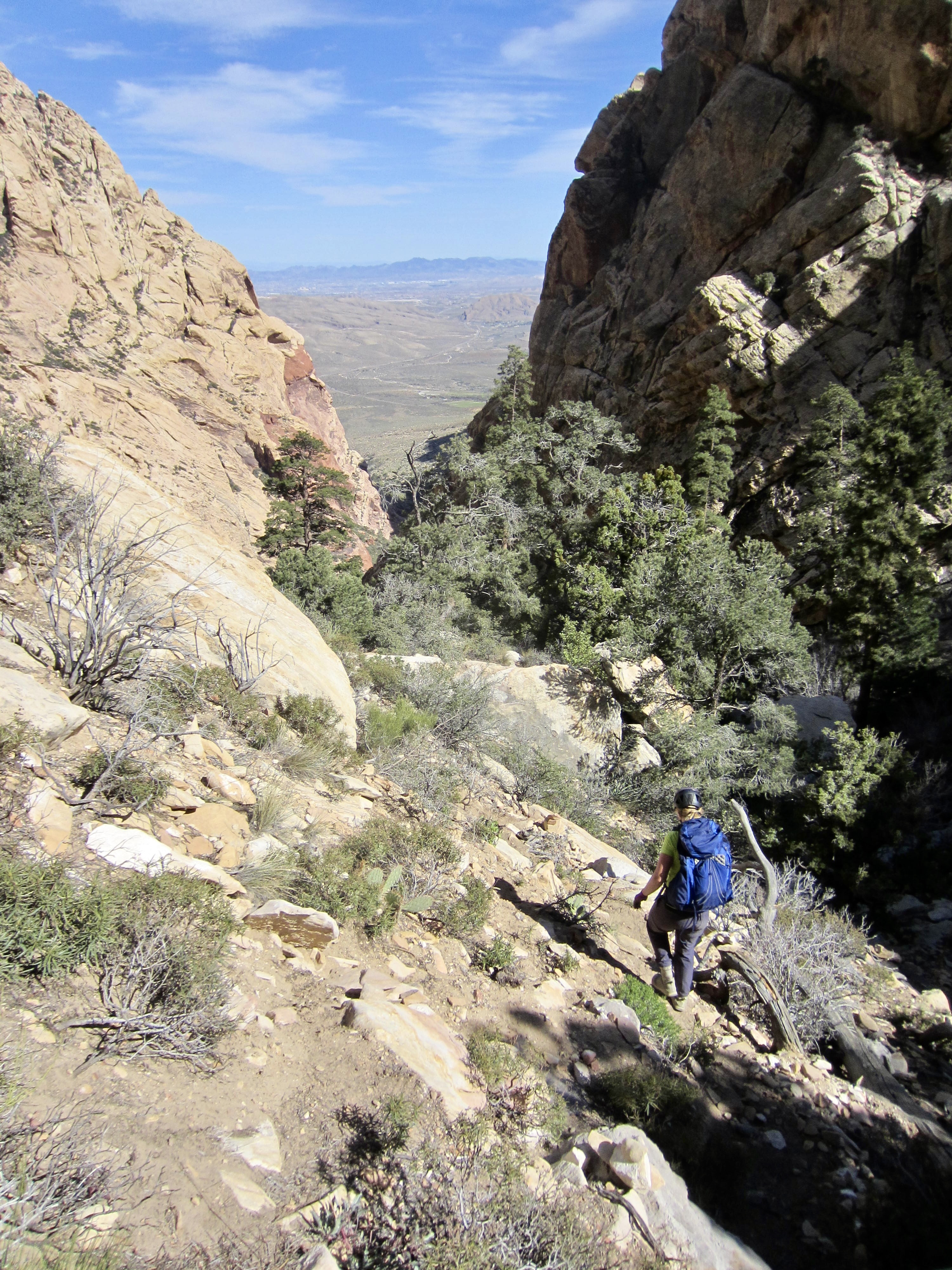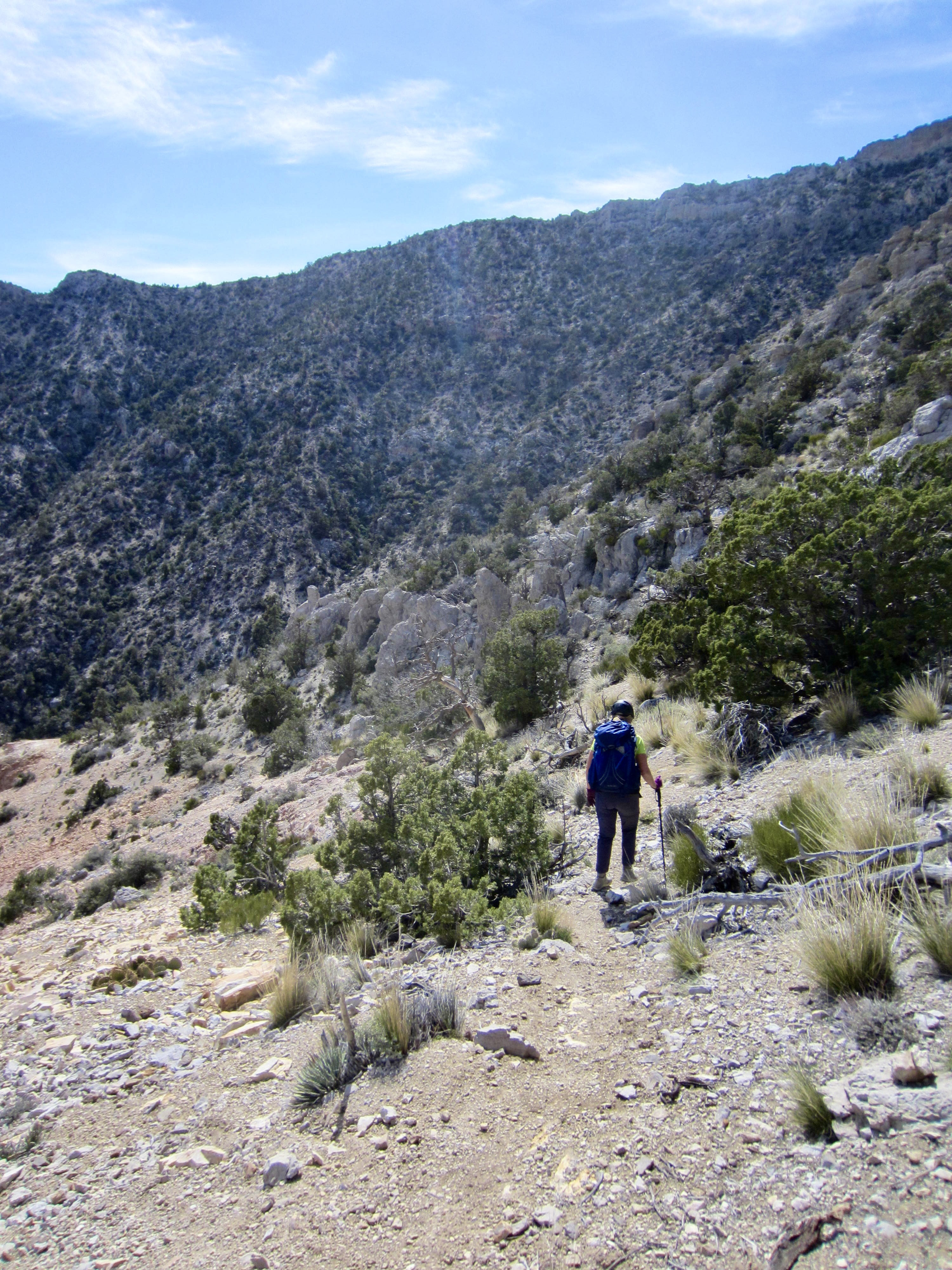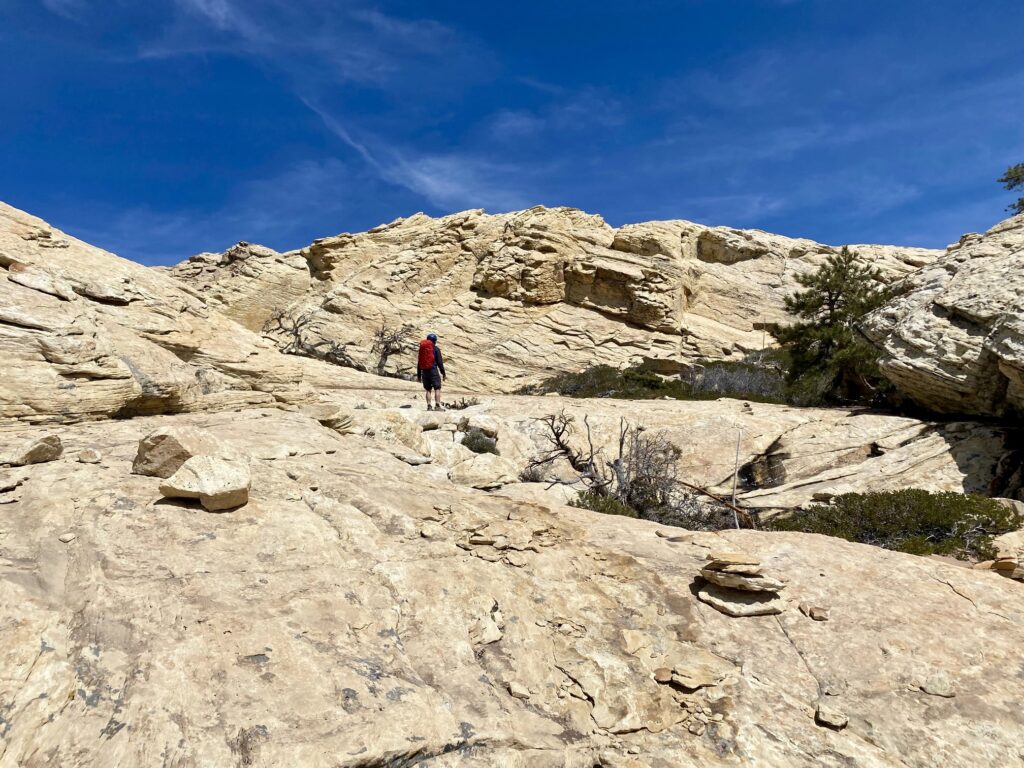 During our descent, it was much easier to stay on-route down the southwest ridge and back through First Creek Canyon, largely because the trail segments and the various stone markers are far more visible from above. We were happily able to avoid any bushwhacking or ropework. However, the canyon seemed longer and the scrambling felt more tedious than it had during our ascent.