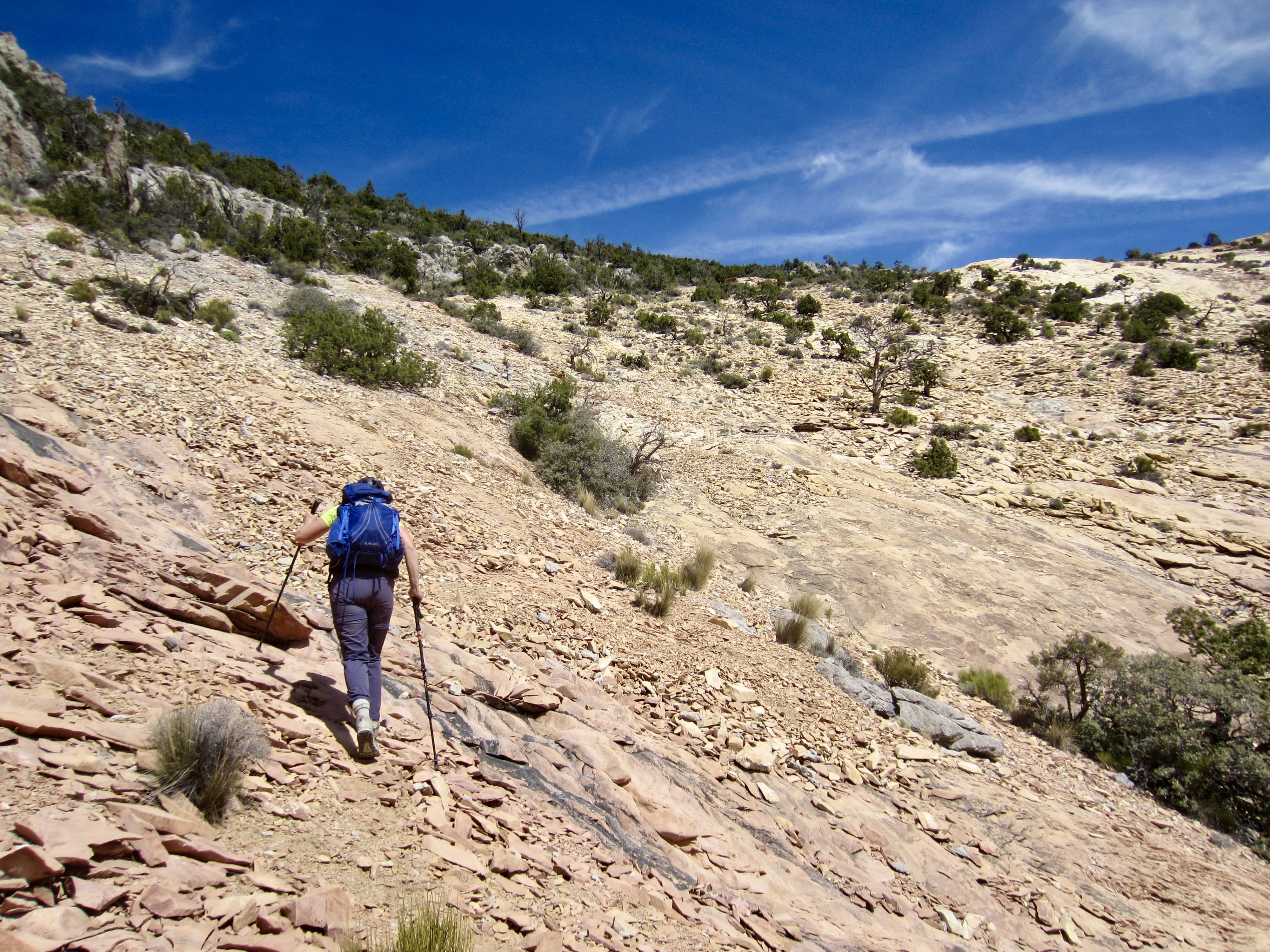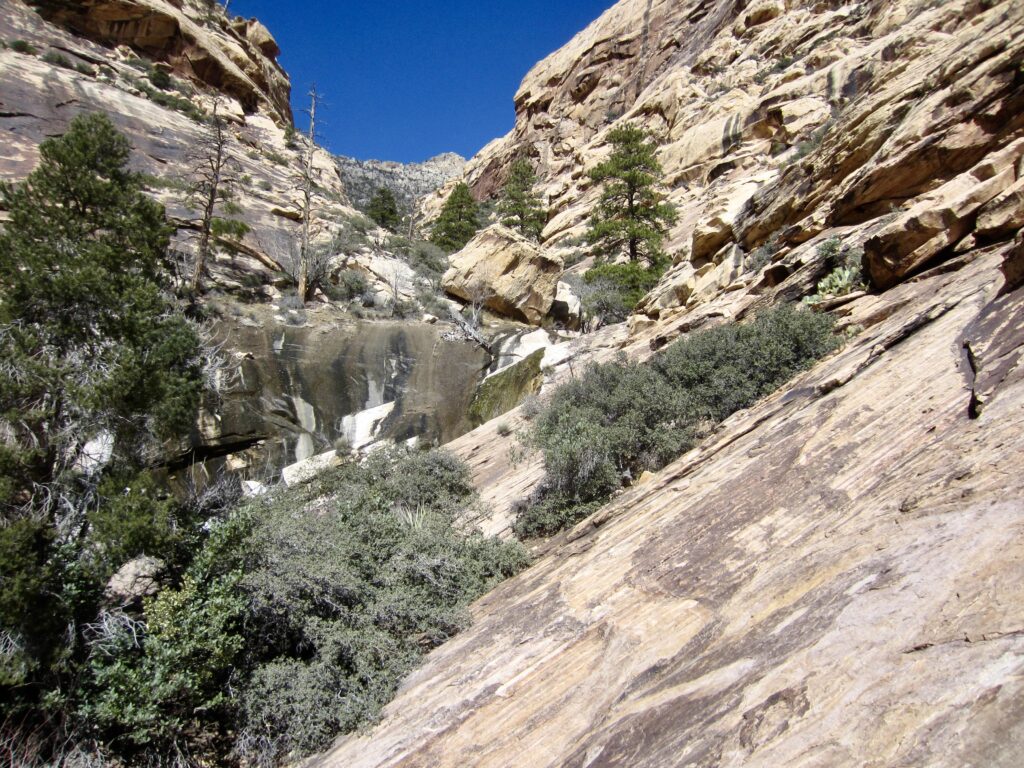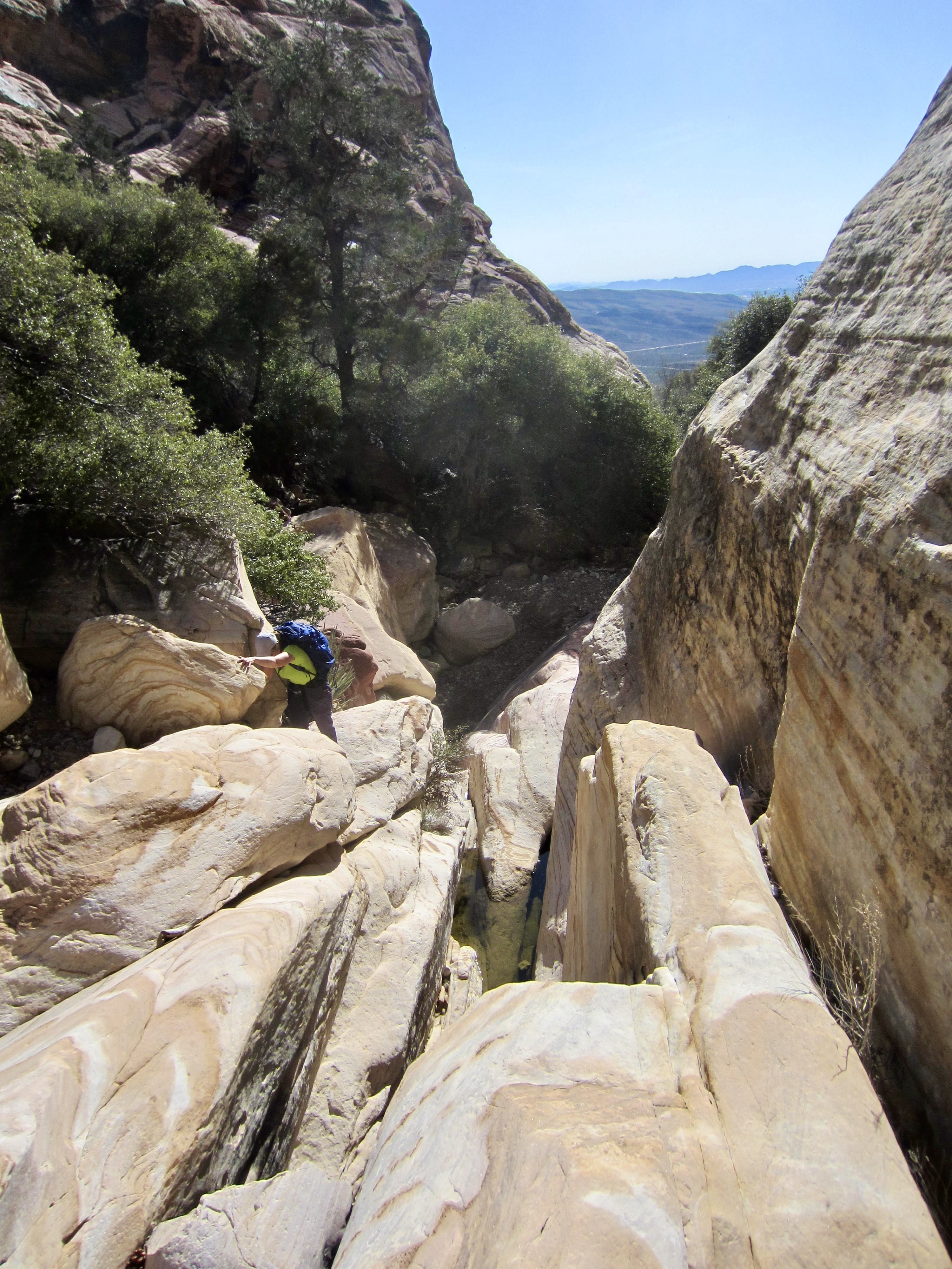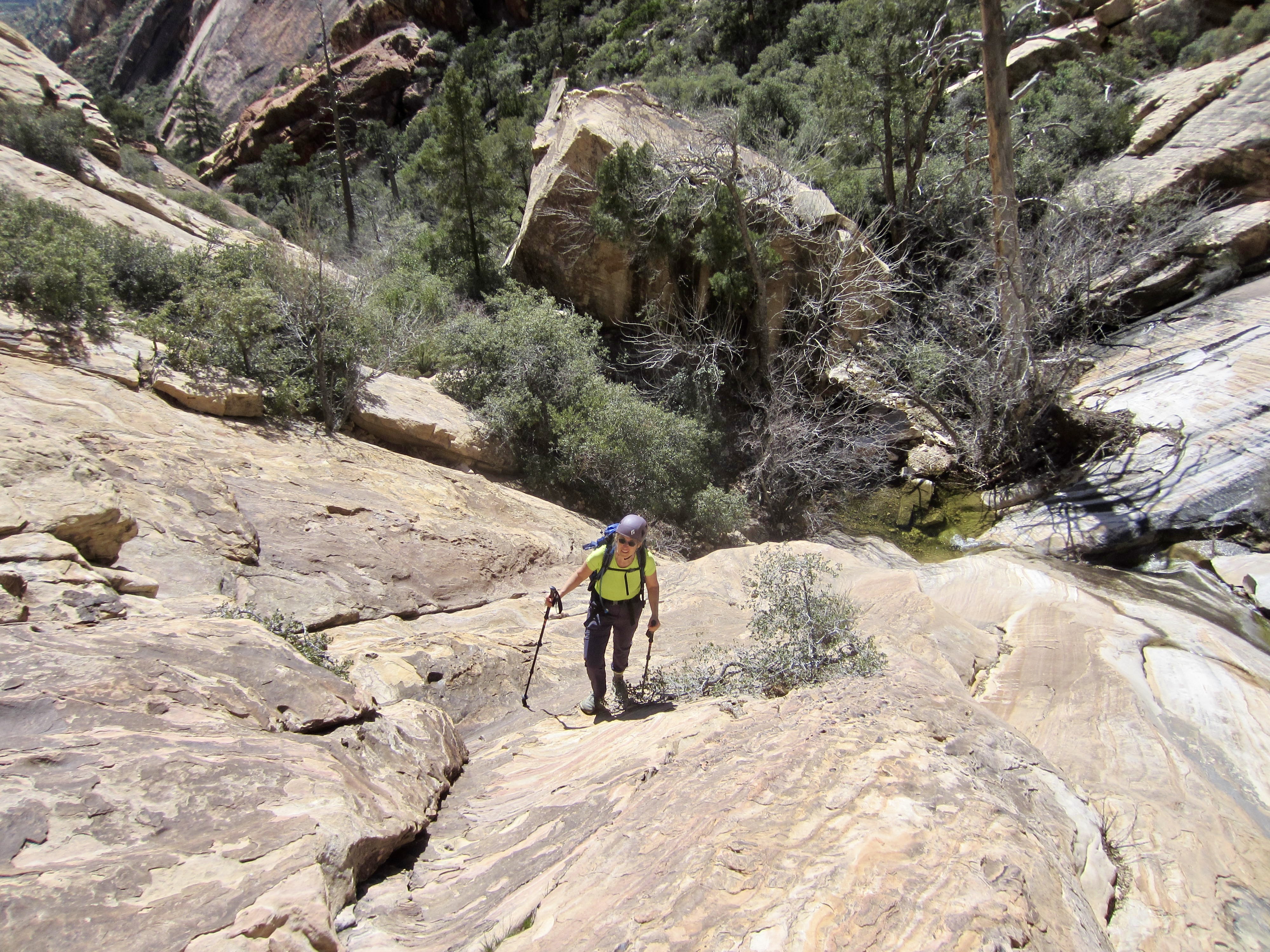 At an elevation of about 4700 feet, we reached a fork in the canyon. We continued up the right-hand branch, traversing across some moderately angled slabs and generally aiming for a series of ponderosa pine trees that were visible ahead.
